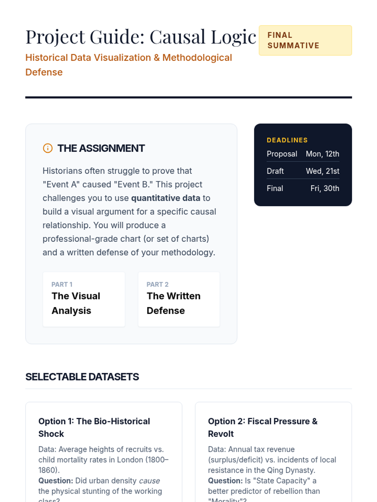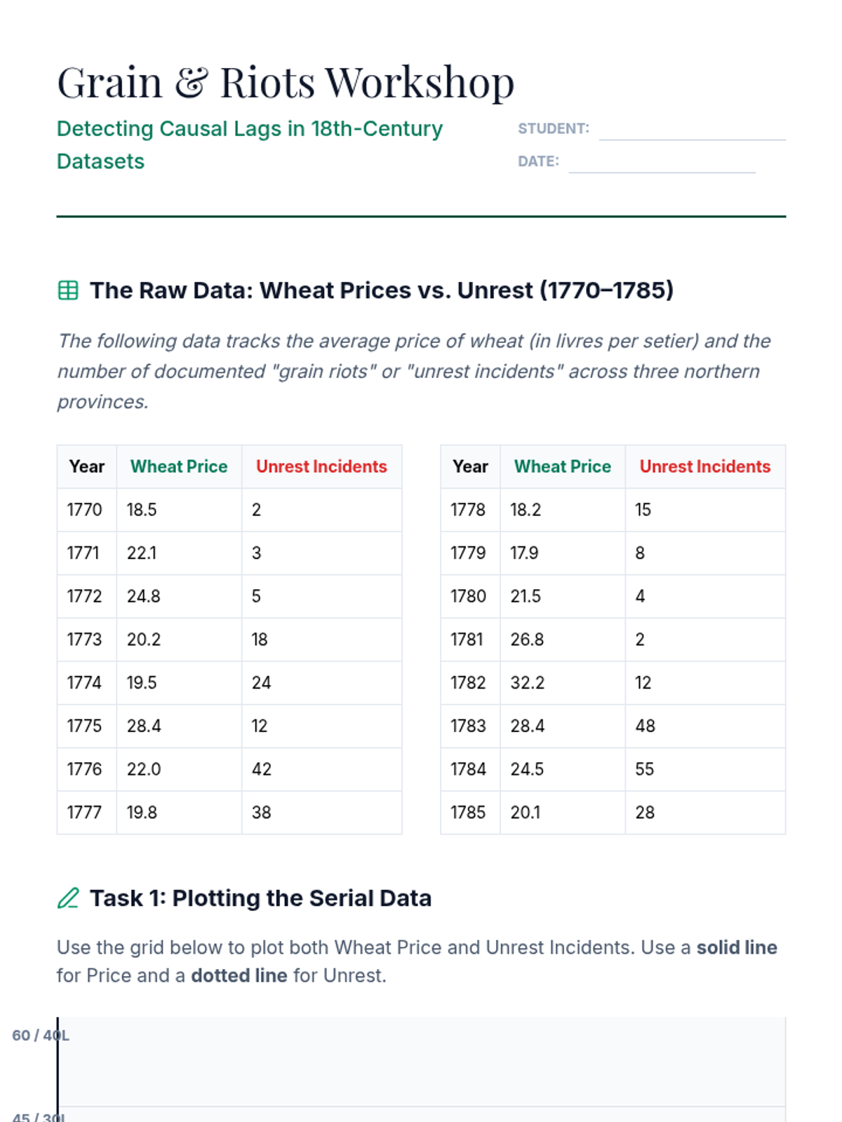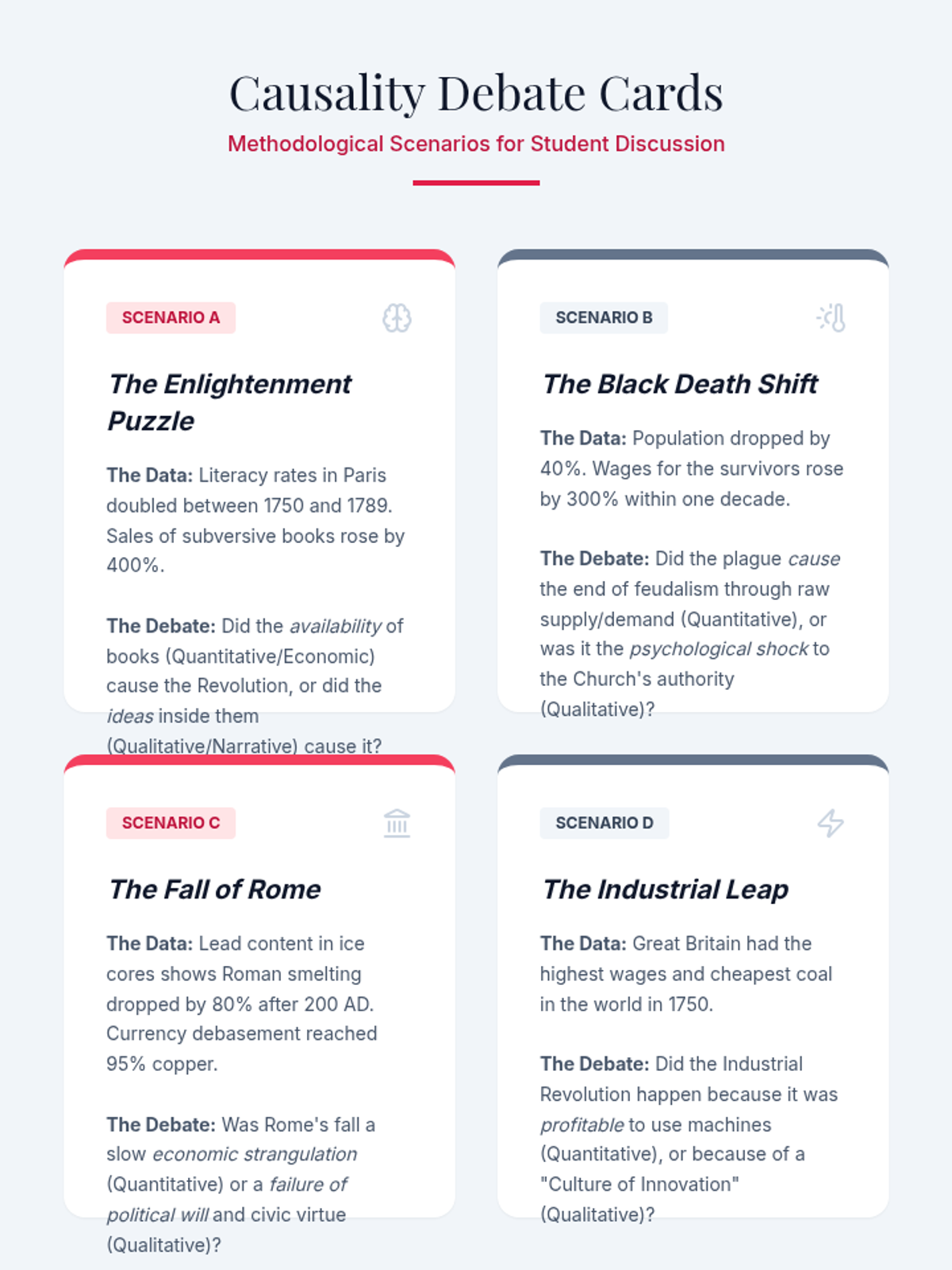 A sequence exploring the methodological intersection of statistics and history, focusing on cliometrics, time-series analysis, and the debate between qualitative and quantitative historical causation.