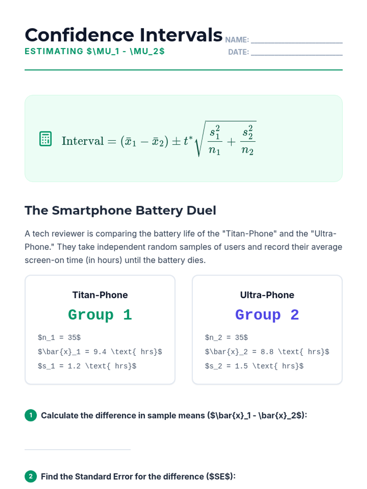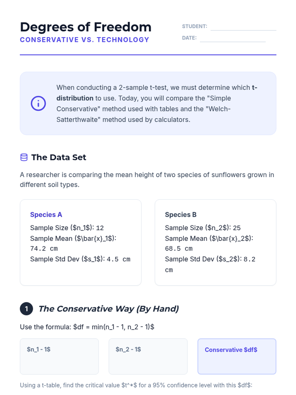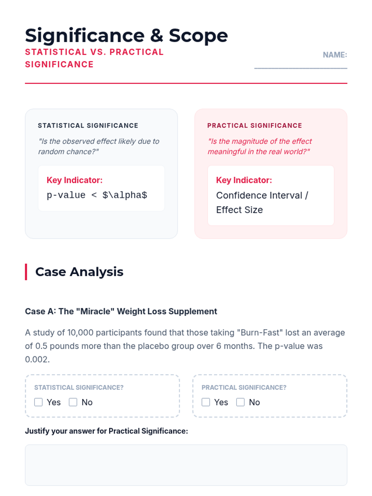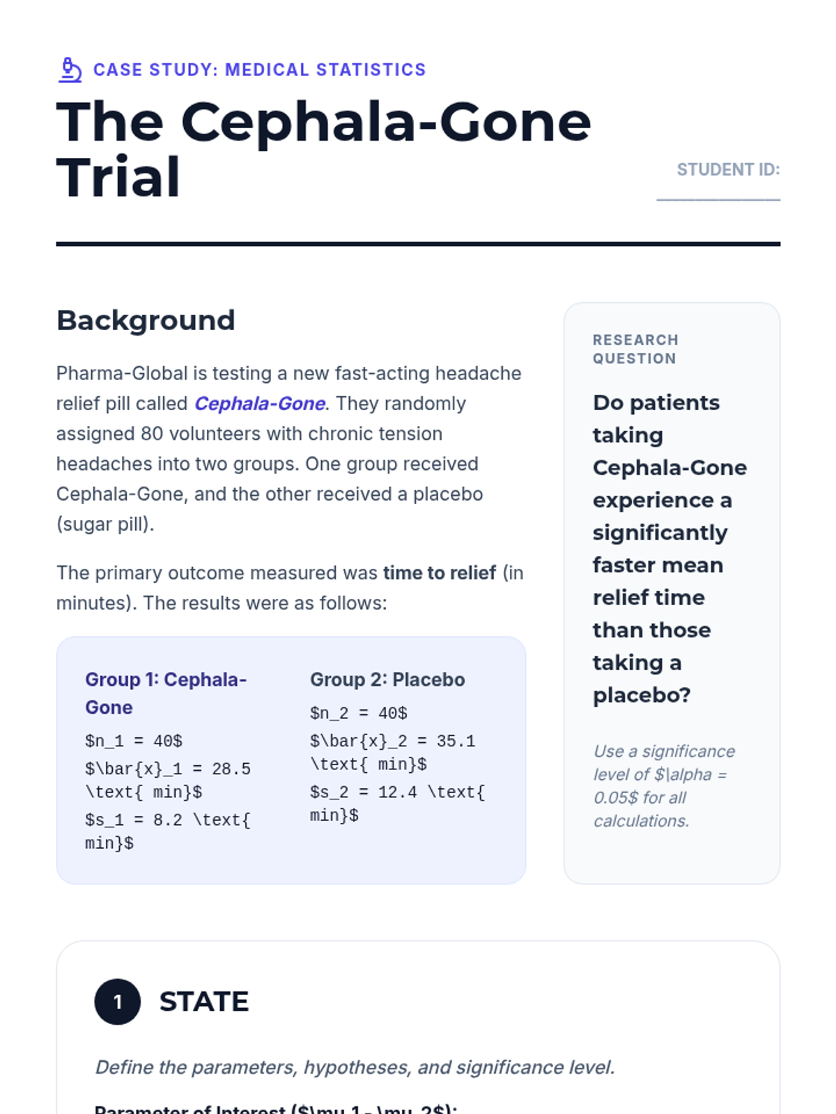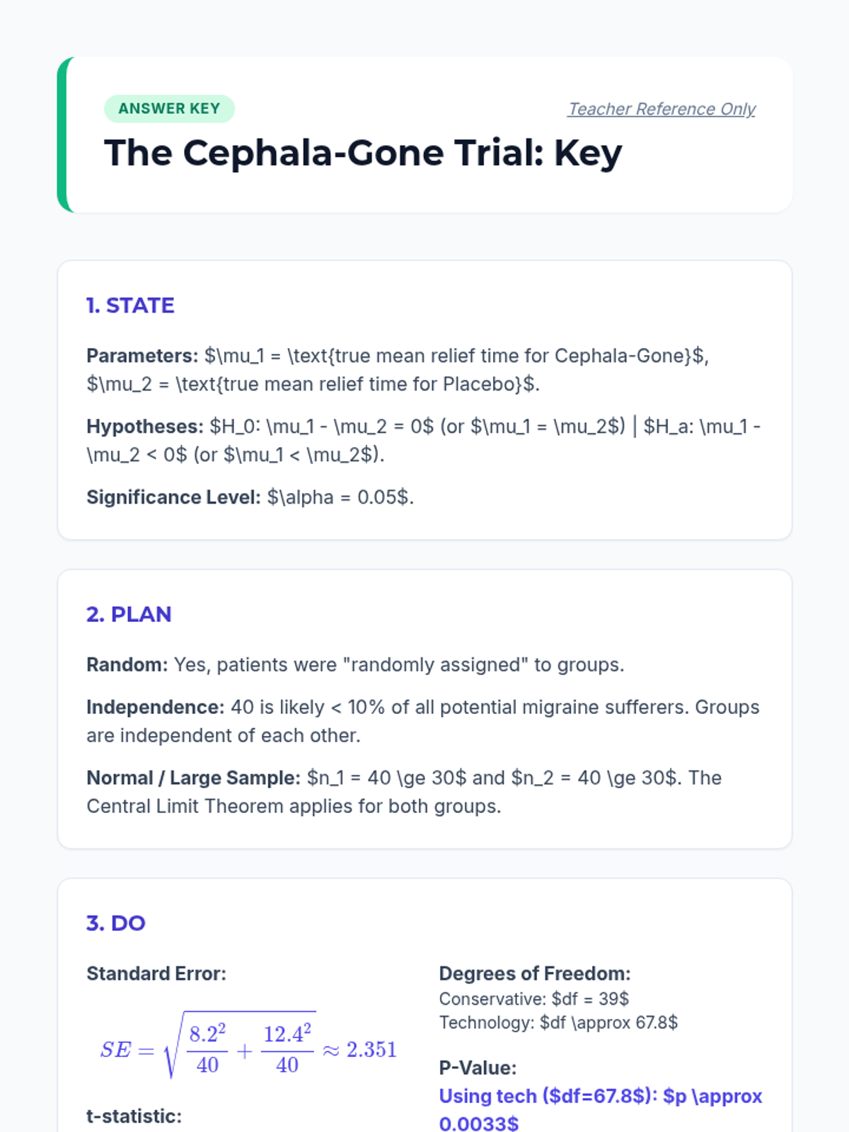 This sequence covers the comparison of means from two independent groups in quantitative data. Students explore the standard error of the difference, degrees of freedom complexities, hypothesis testing through clinical trials, confidence intervals, and the distinction between statistical and practical significance.