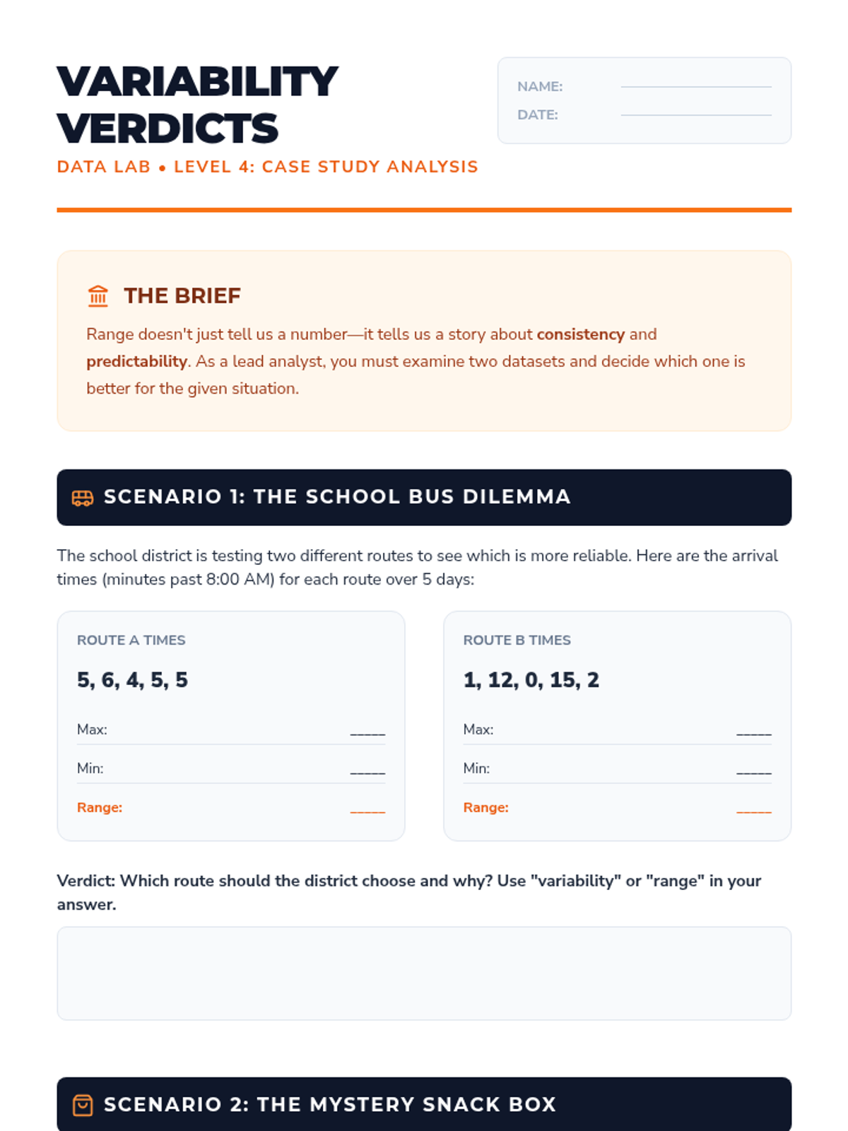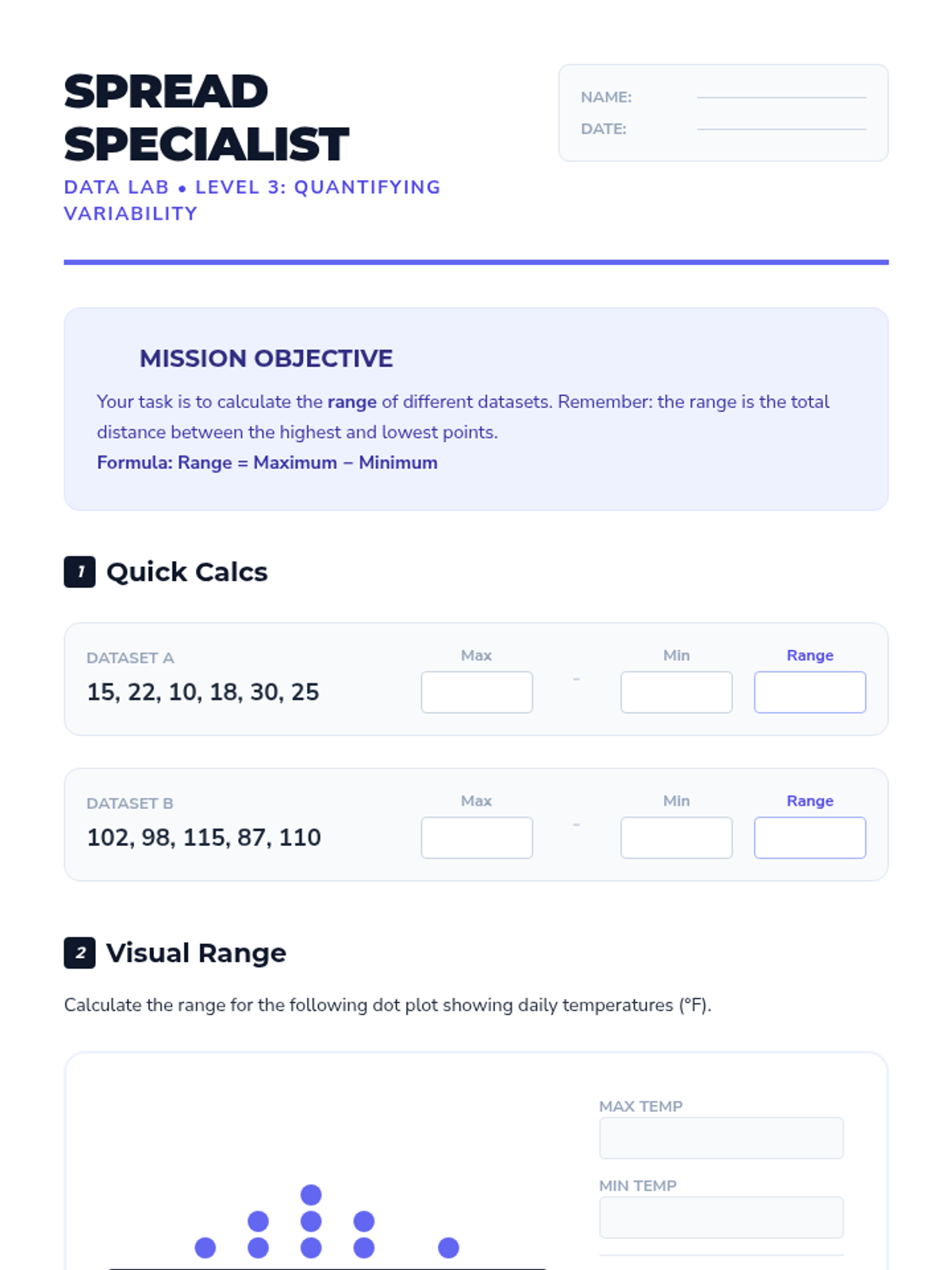 This inquiry-based sequence introduces 6th grade students to statistical variability, starting with distinguishing question types and progressing to visualizing data on dot plots and quantifying spread using range.