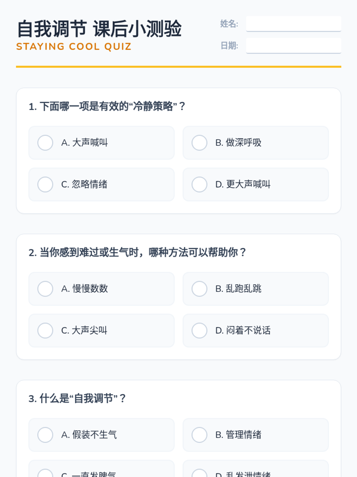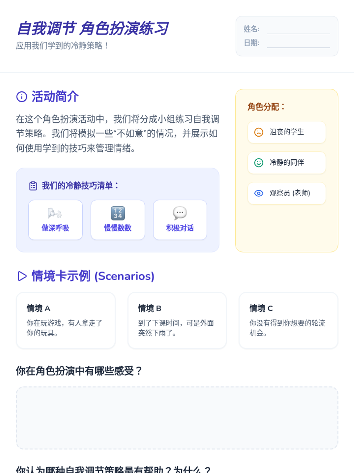 这个为期五天的序列面向2至5年级的生活技能学生,重点是自我调节技能。通过互动幻灯片、角色扮演活动和冷静技巧练习,学生将学习如何管理情绪,并在情况不如预期时保持冷静。