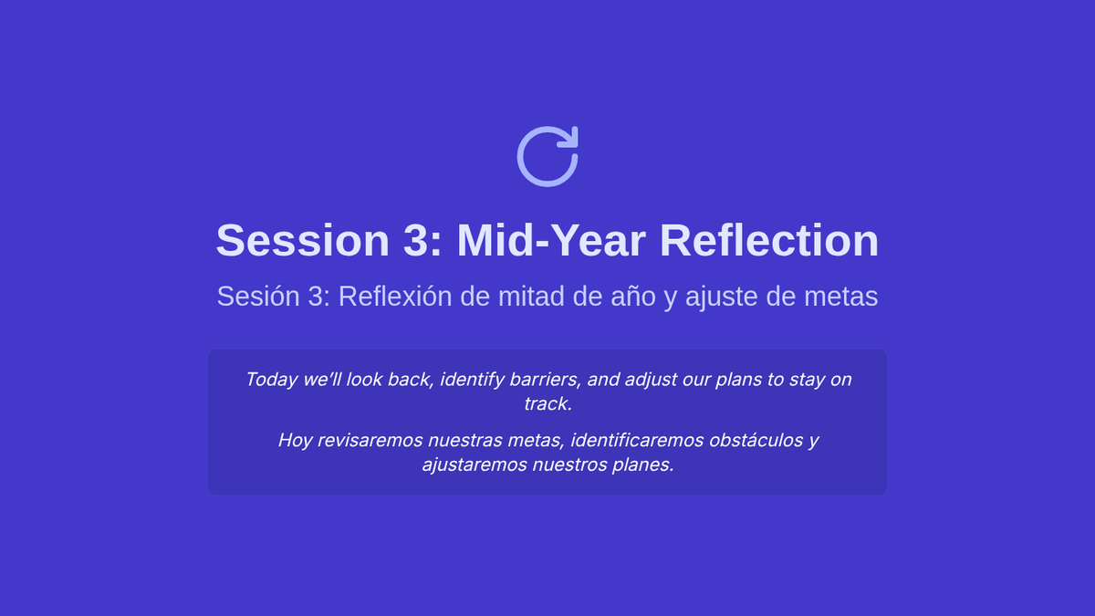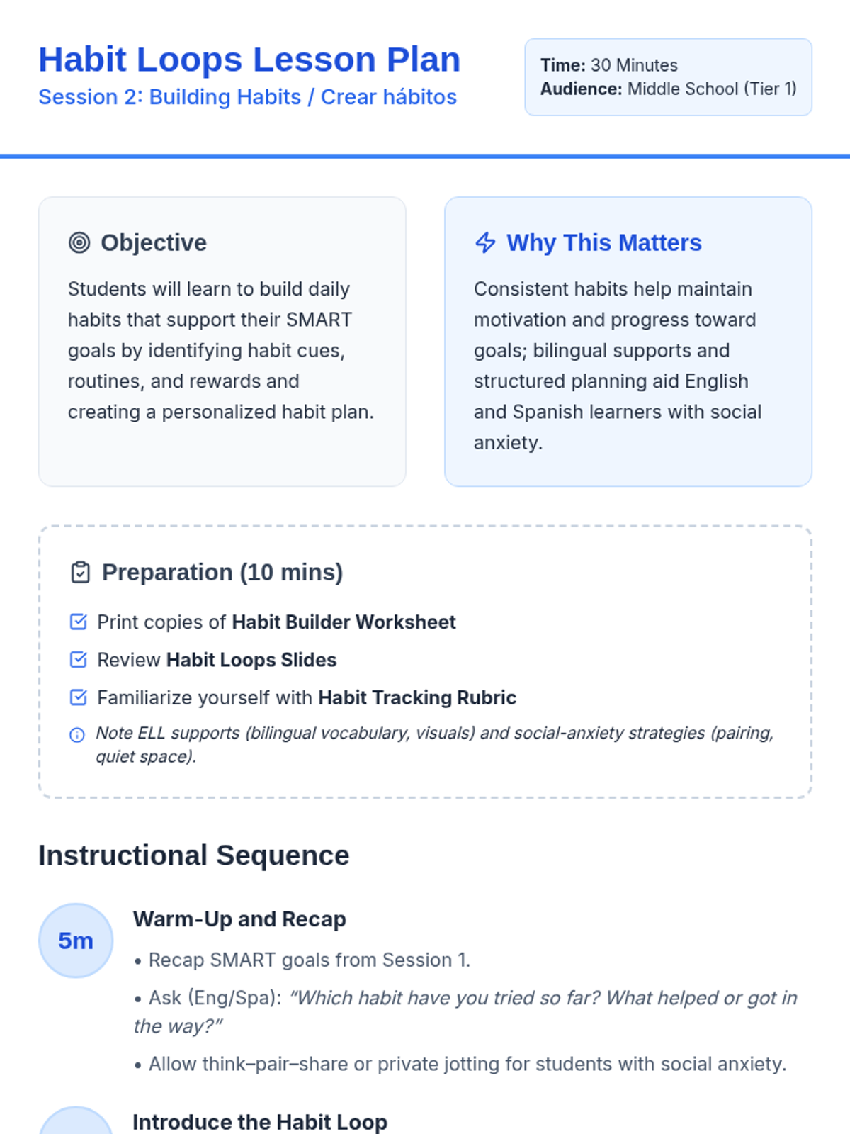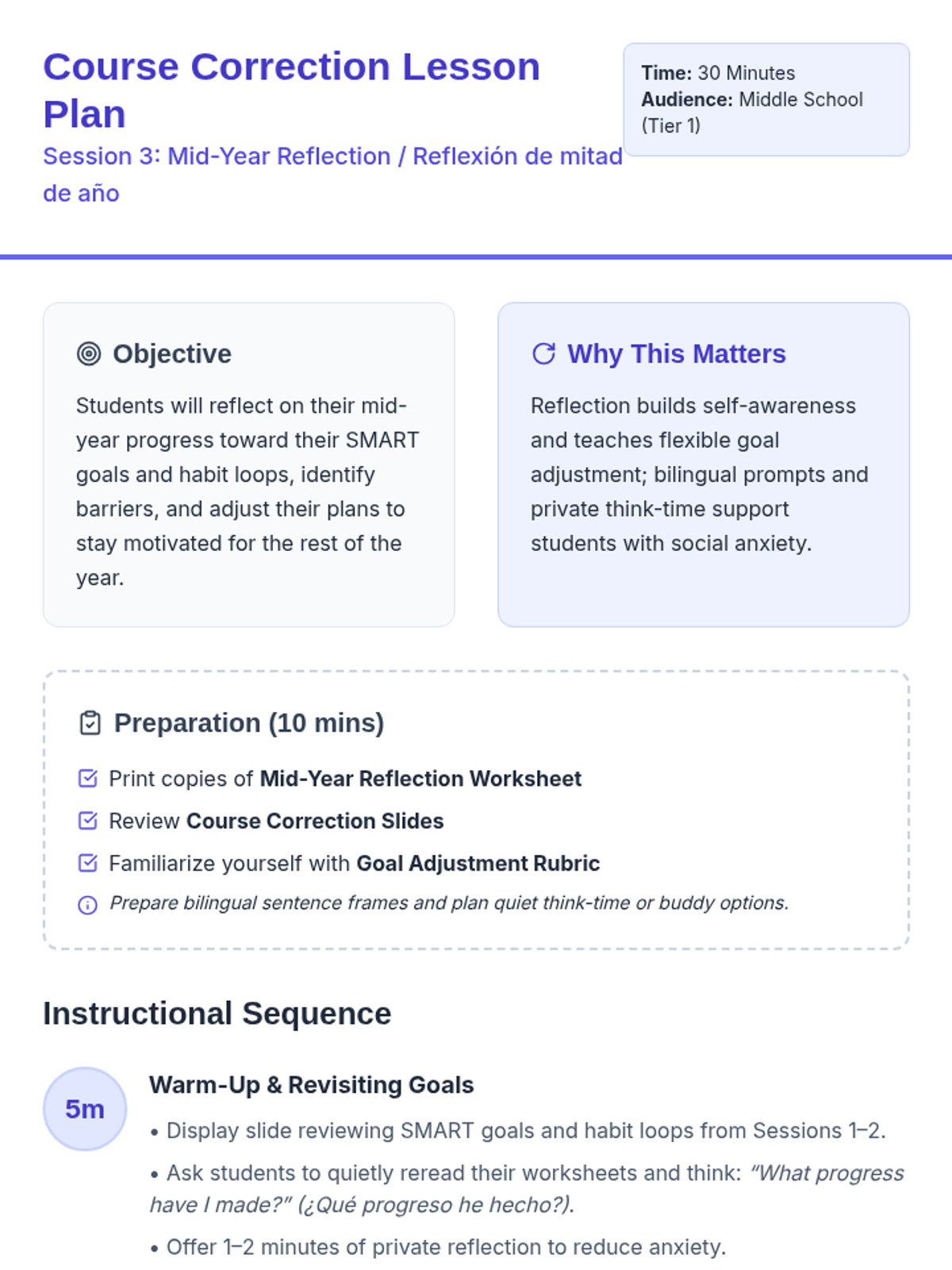 A three-session sequence focused on goal-setting, habit-building, and mid-year reflection for Tier 1 classroom instruction. Designed with bilingual supports (English/Spanish) and accommodations for students with social anxiety.