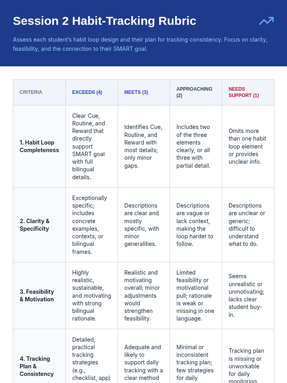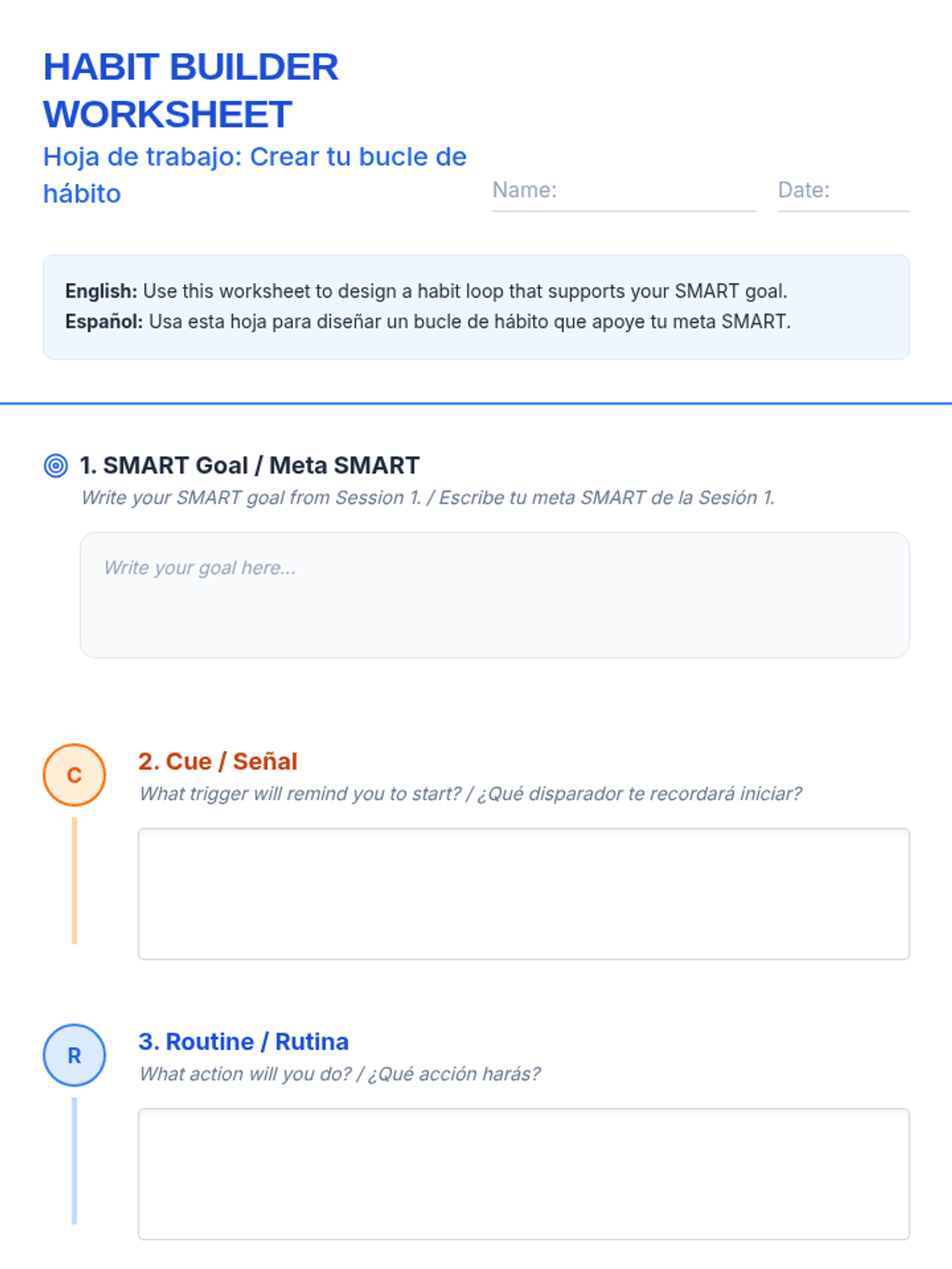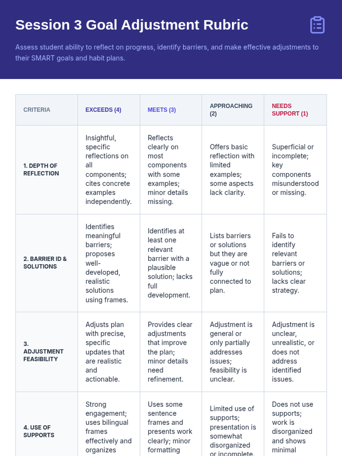 A three-session sequence focused on goal-setting, habit-building, and mid-year reflection for Tier 1 classroom instruction. Designed with bilingual supports (English/Spanish) and accommodations for students with social anxiety.