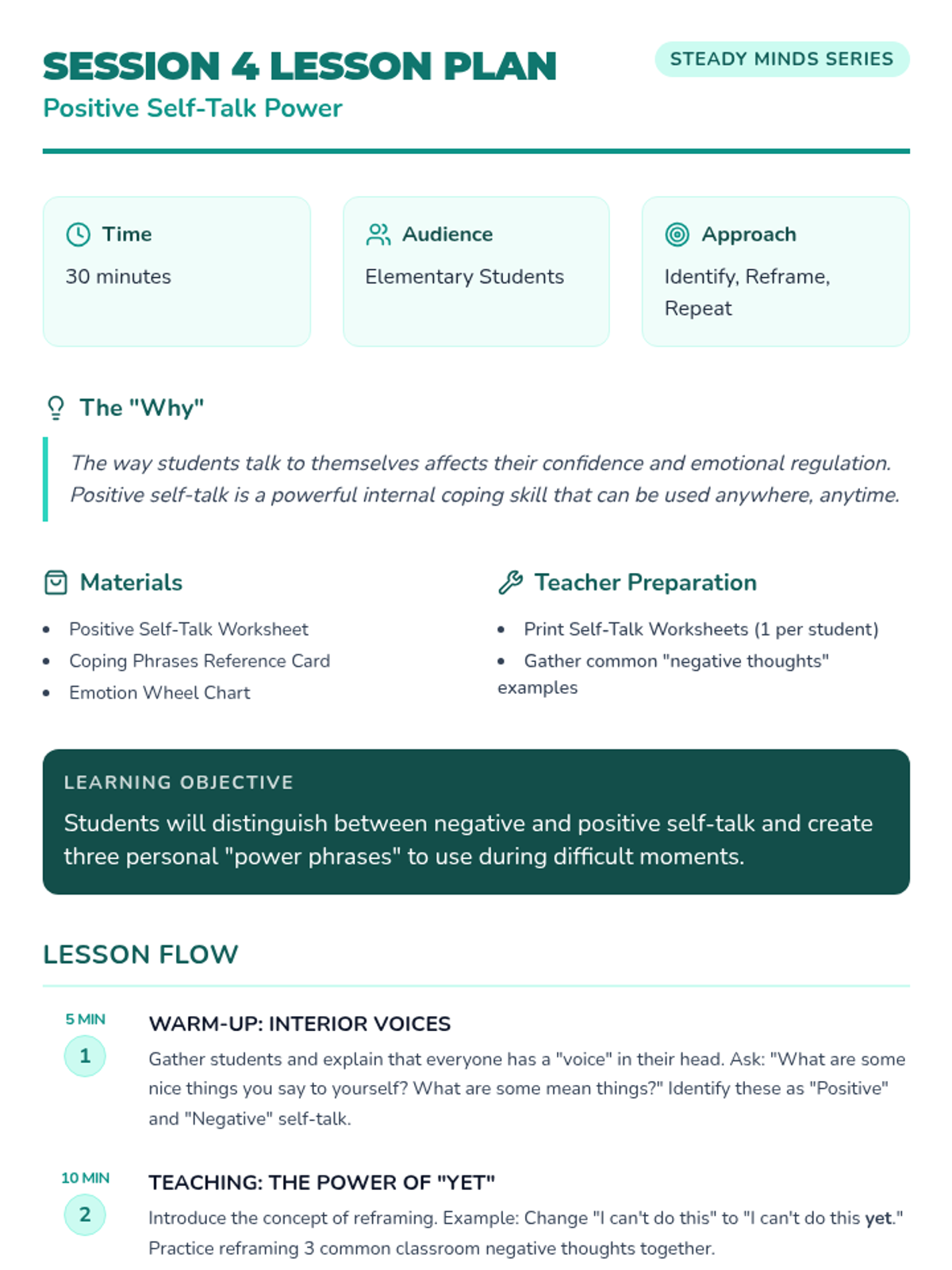 A 6-week small group curriculum for 4th-grade girls focused on developing positive self-talk, building self-esteem, and mastering growth mindset through creative activities and group discussion.