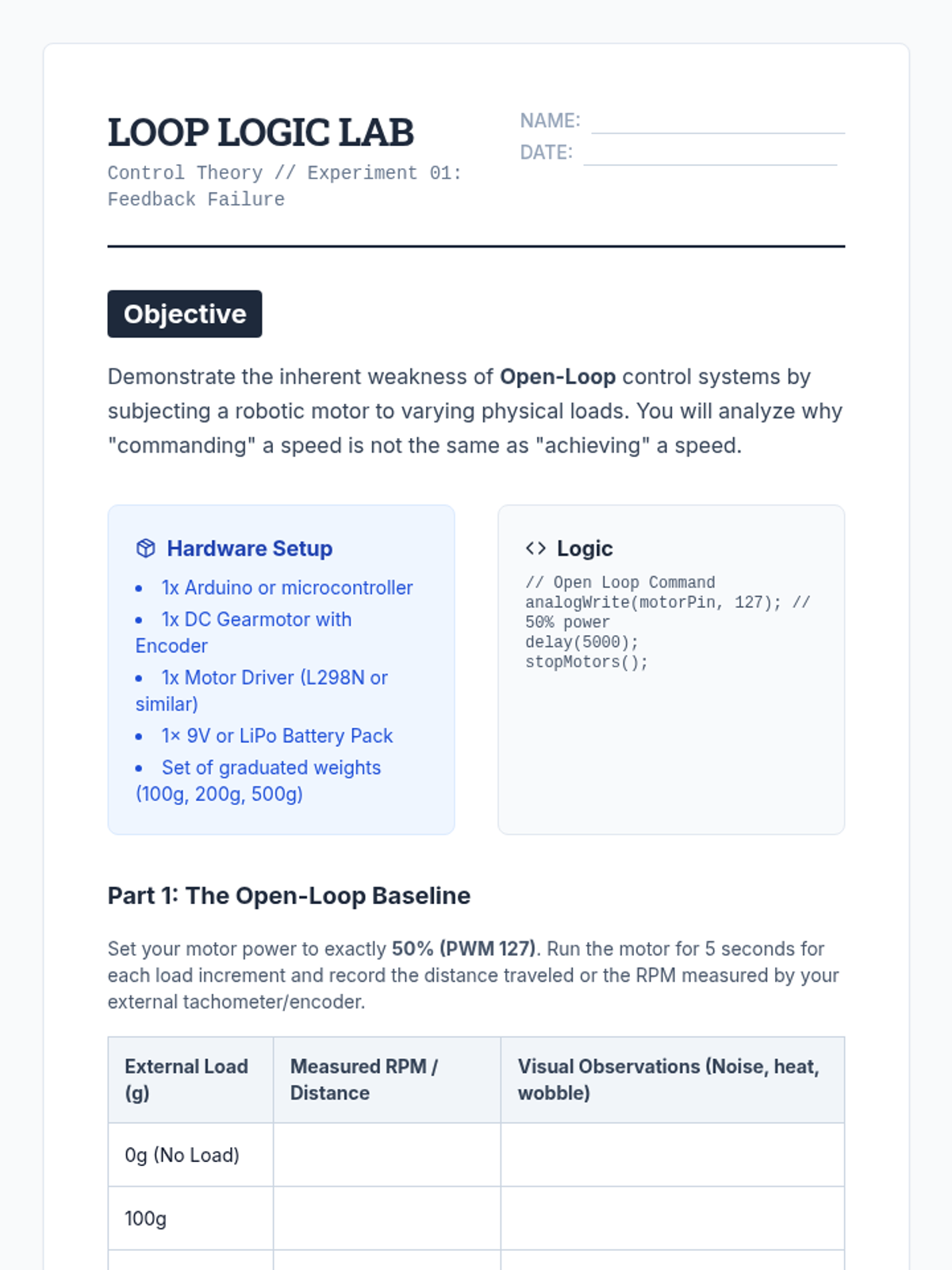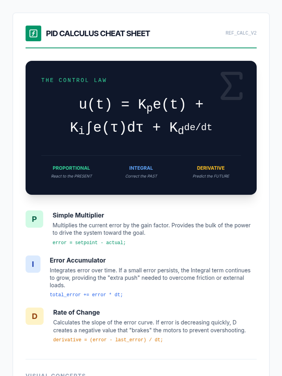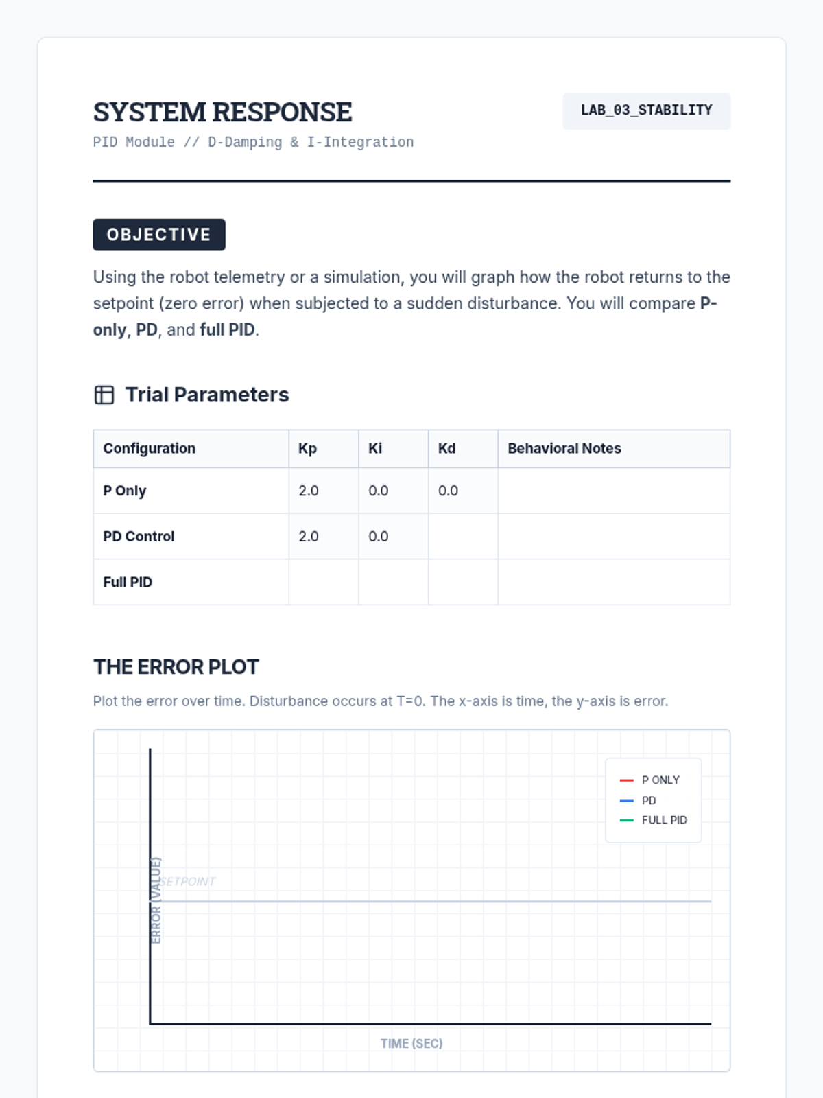 A comprehensive engineering sequence for 12th-grade students exploring control theory and PID algorithms. Students progress from basic open-loop systems to complex self-balancing robots, mastering the mathematics of real-time error correction and system stability.