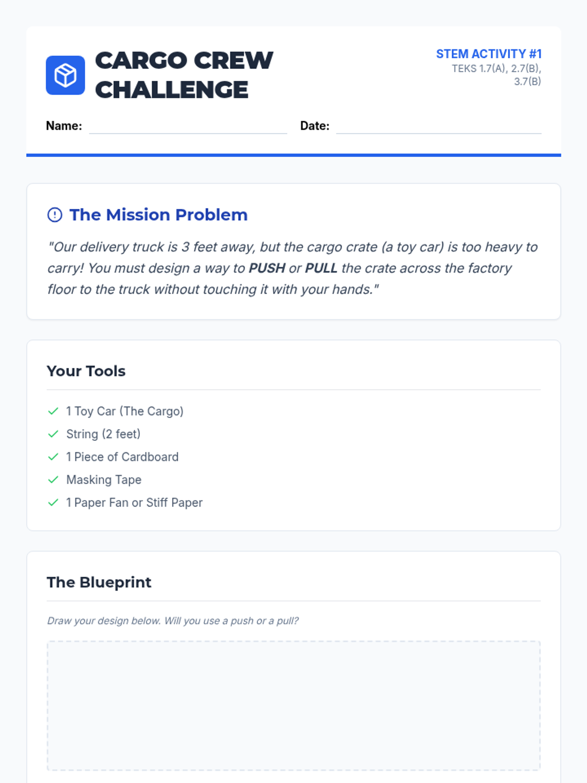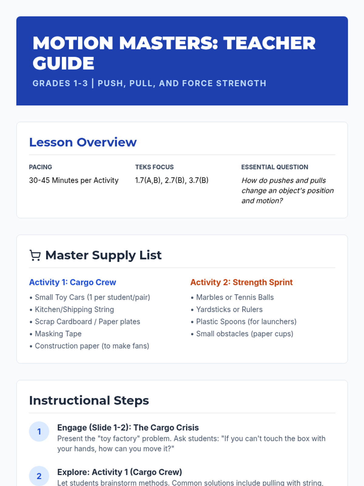 A comprehensive K-5 STEM curriculum covering Texas TEKS for Earth and Space Science. Each grade level features two hands-on engineering challenges, interactive slide decks, and STAAR-aligned assessment tools focusing on seasons, lunar patterns, solar system models, and Earth's rotation.
