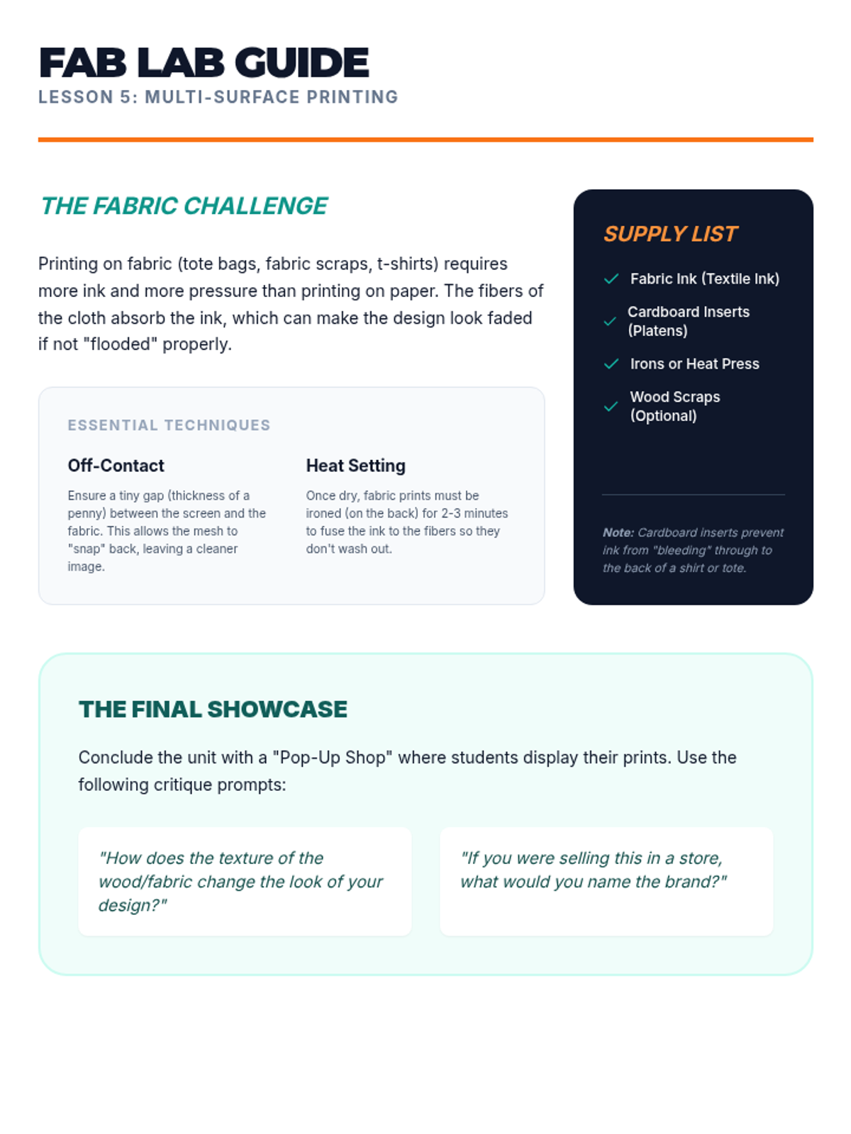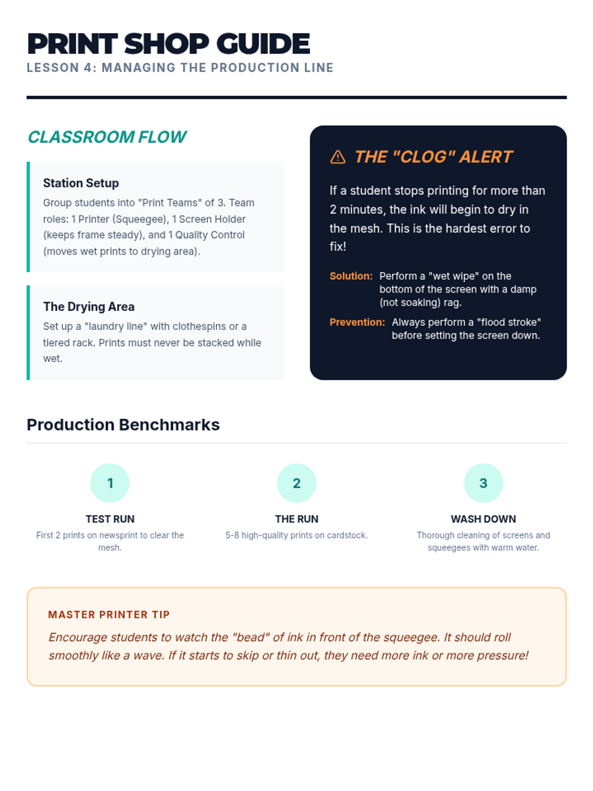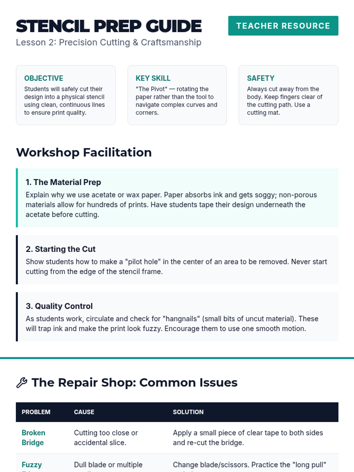 A comprehensive introduction to the world of screen printing and stencil graphics for 5th graders. Students learn to simplify images into high-contrast designs, manage the mechanics of 'islands and bridges,' and master the squeegee pull to create repeatable art on various surfaces.