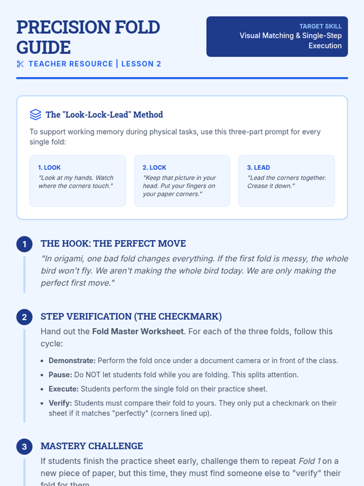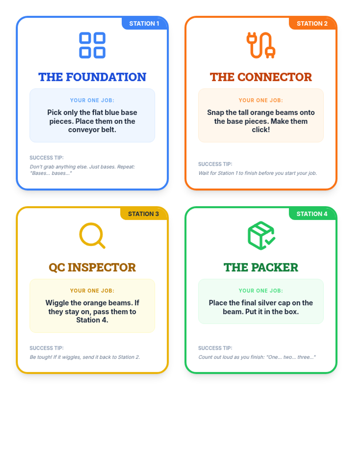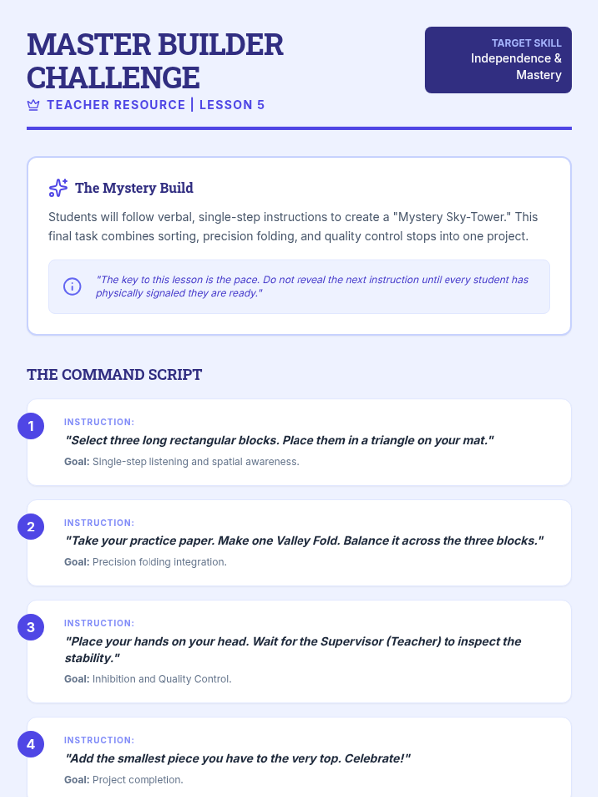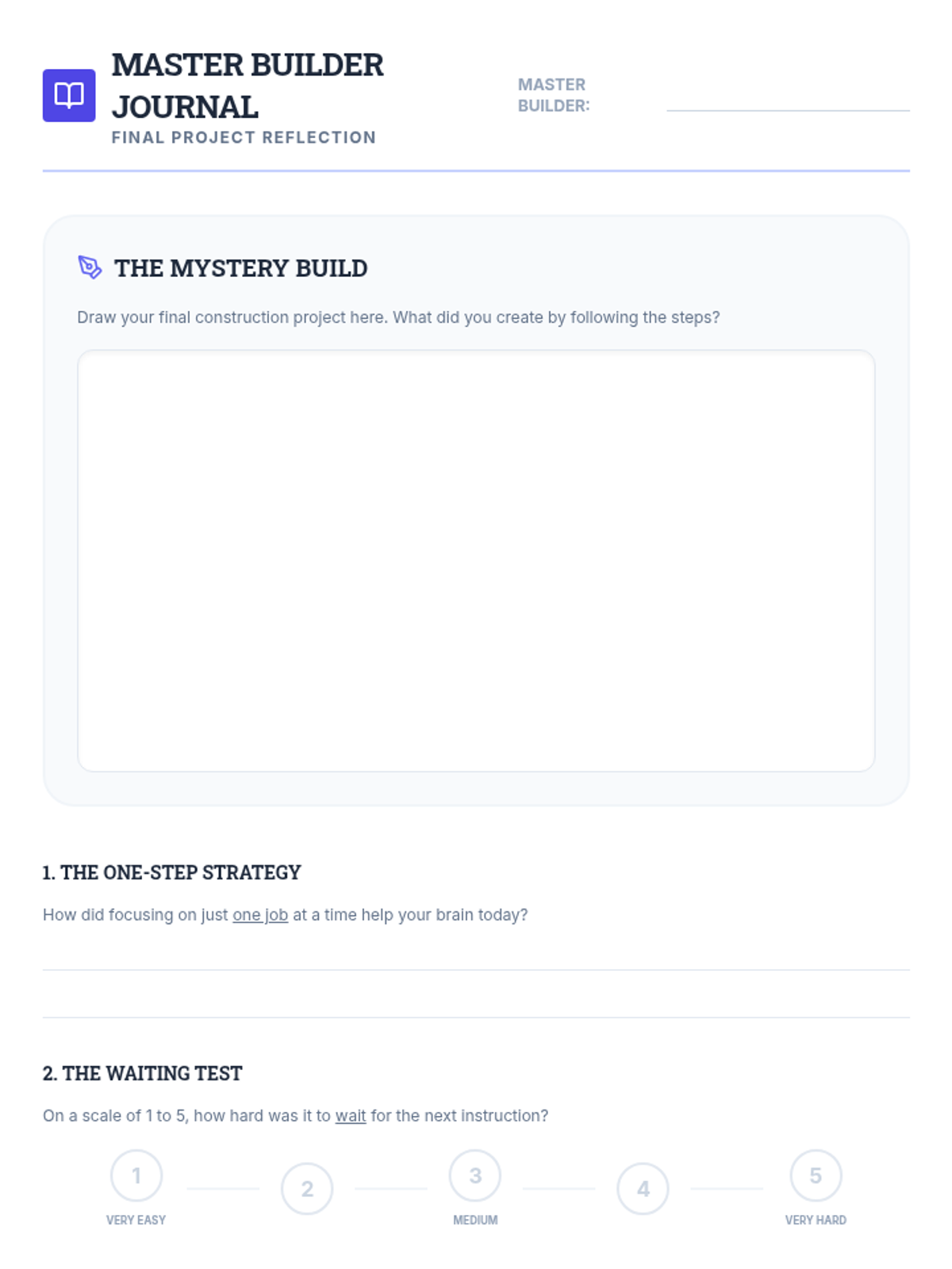 A project-based sequence for 4th-grade students focusing on working memory support through single-step direction following, using construction and assembly tasks to reinforce precision and patience.