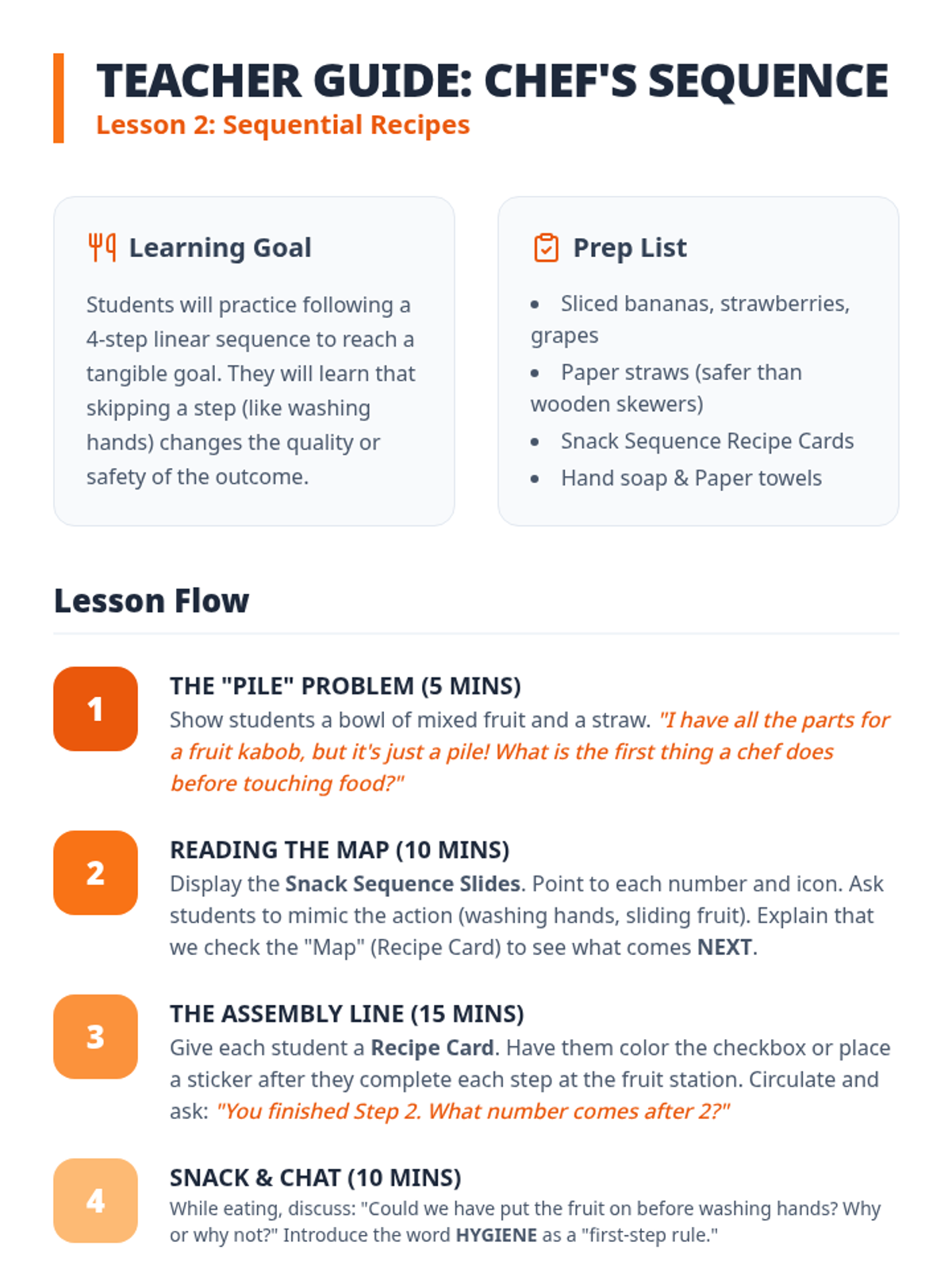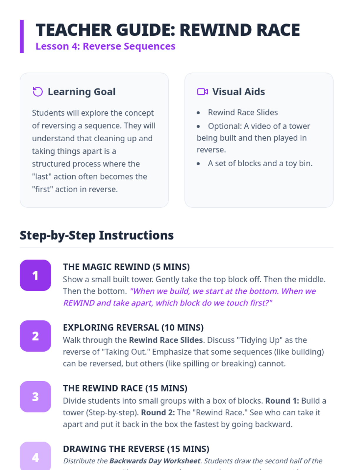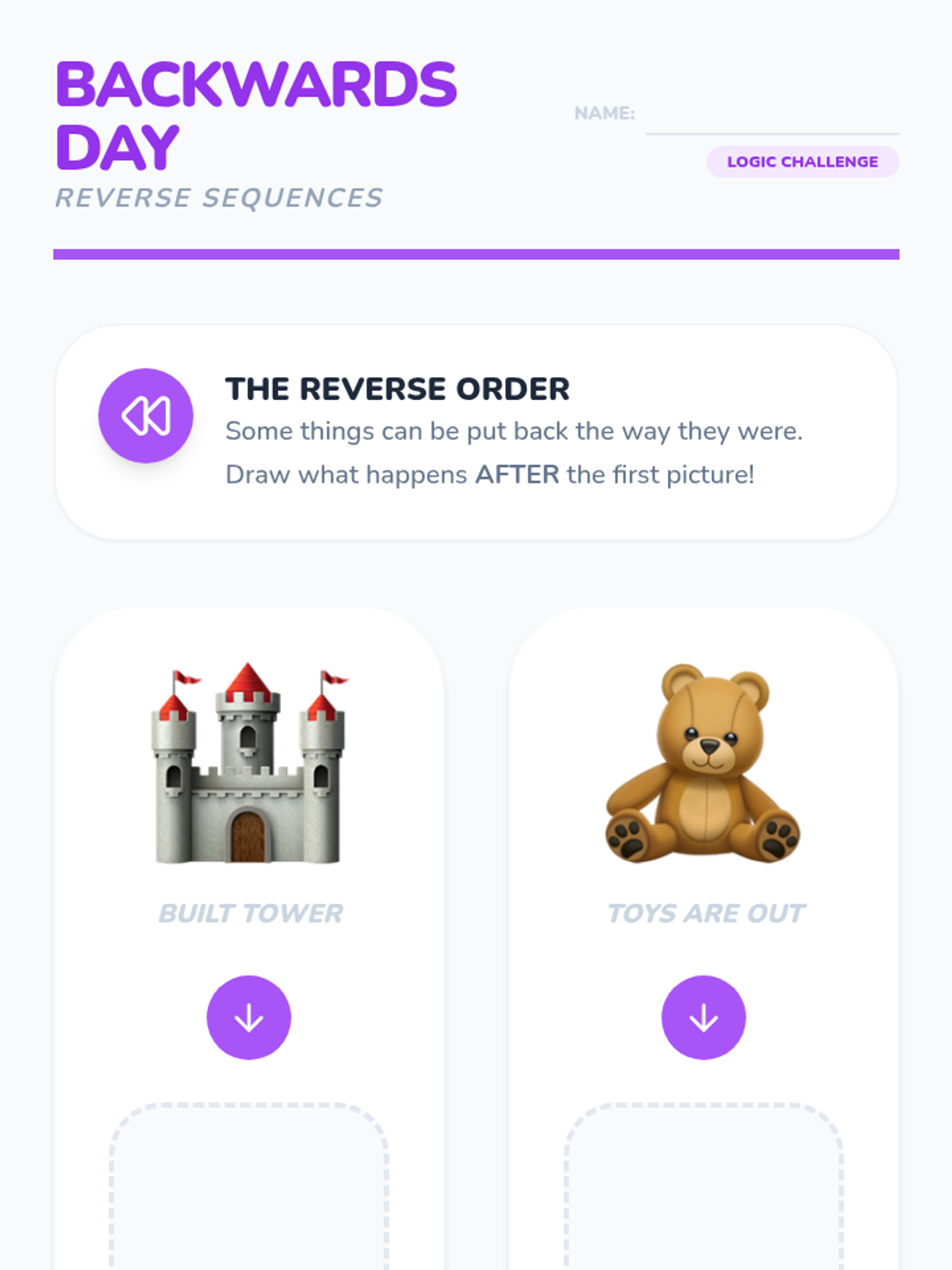 A hands-on sequence for Pre-K students to explore logic and cause-and-effect by ordering multi-step procedures. Students learn that the order of steps is essential for success in daily tasks like dressing, cooking, and building.