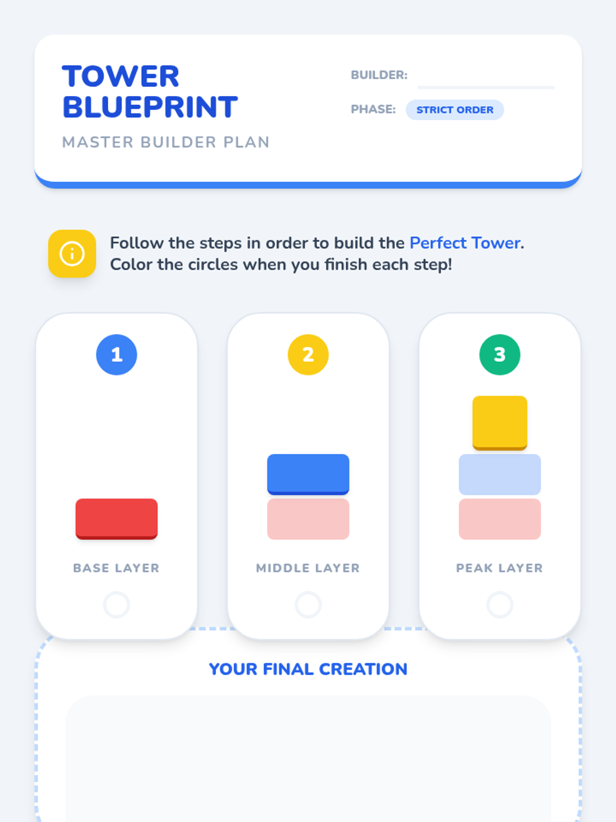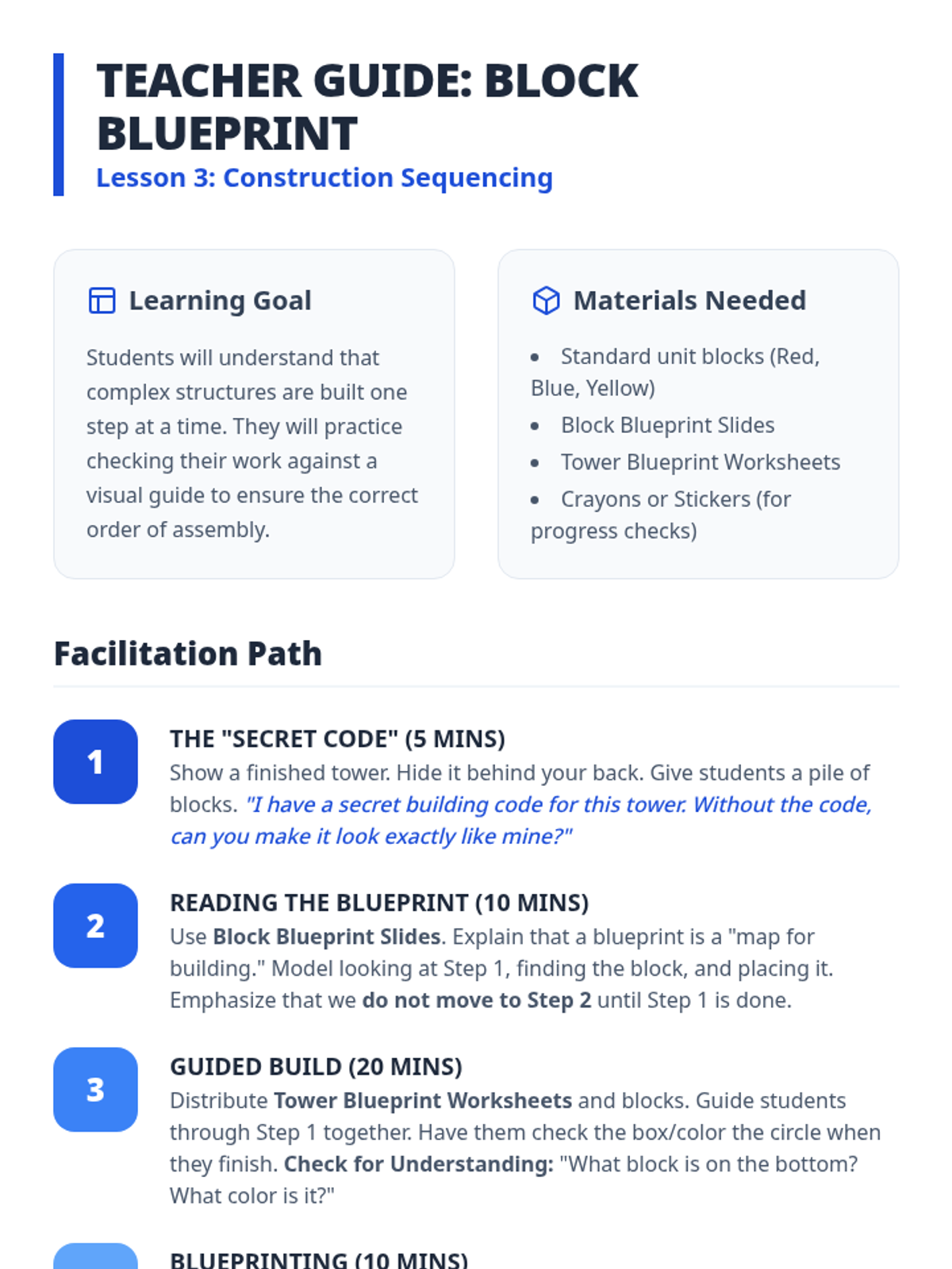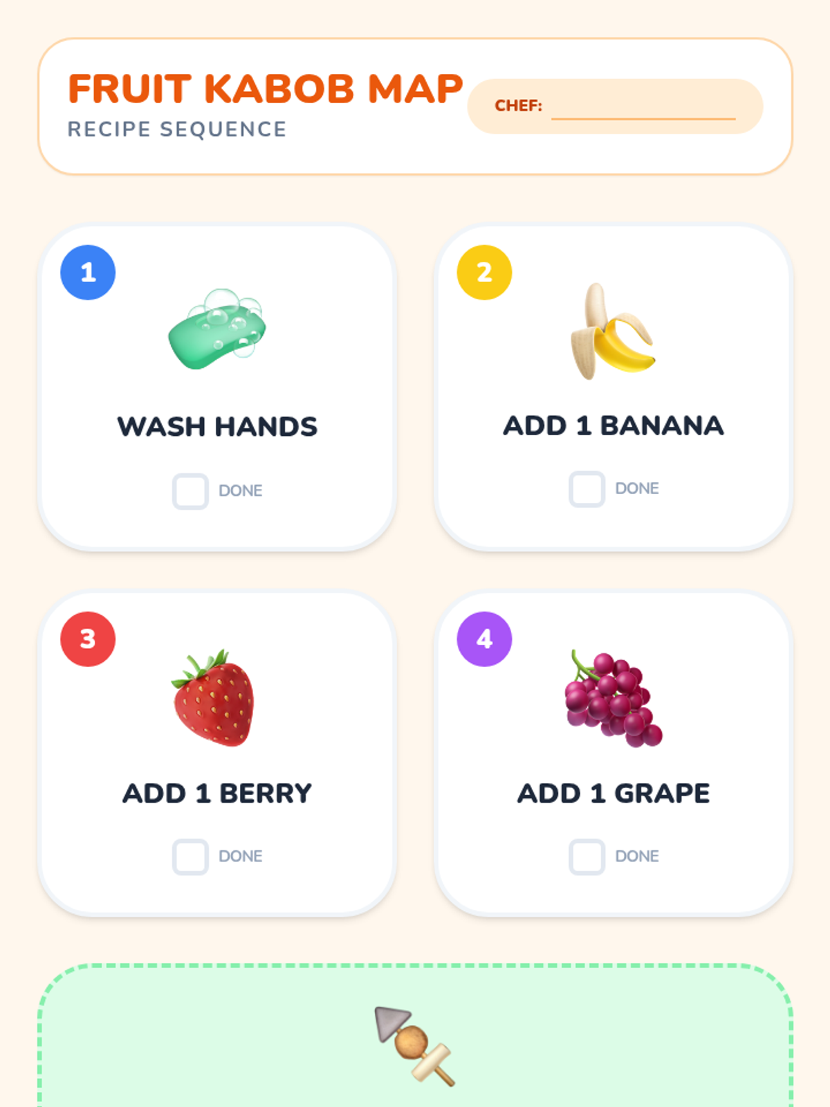 A hands-on sequence for Pre-K students to explore logic and cause-and-effect by ordering multi-step procedures. Students learn that the order of steps is essential for success in daily tasks like dressing, cooking, and building.