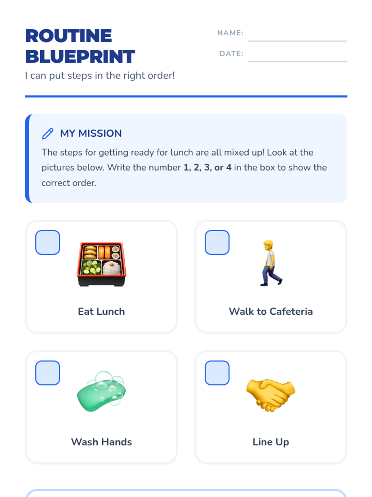 This sequence guides 1st-grade students through deconstructing classroom routines into visual steps. Students analyze logical order, create First/Then boards, and draft personal transition scripts to build independence and self-regulation during the school day.