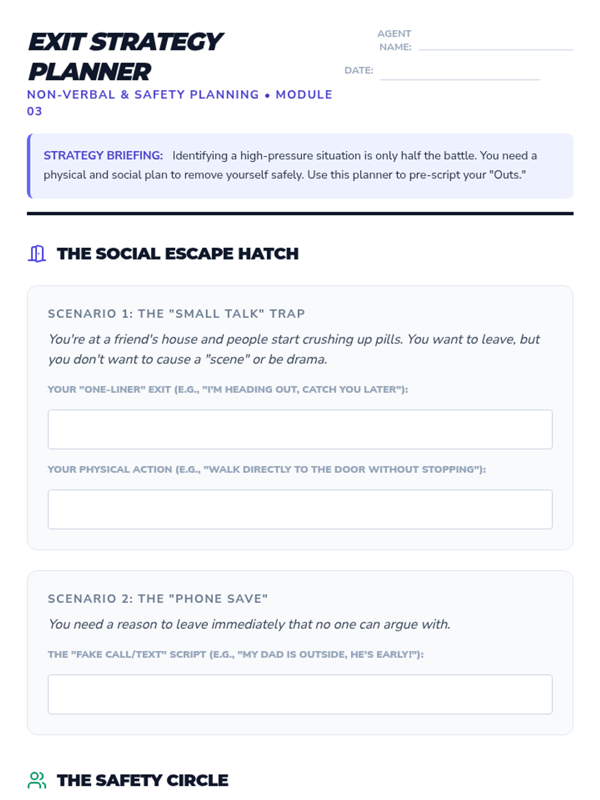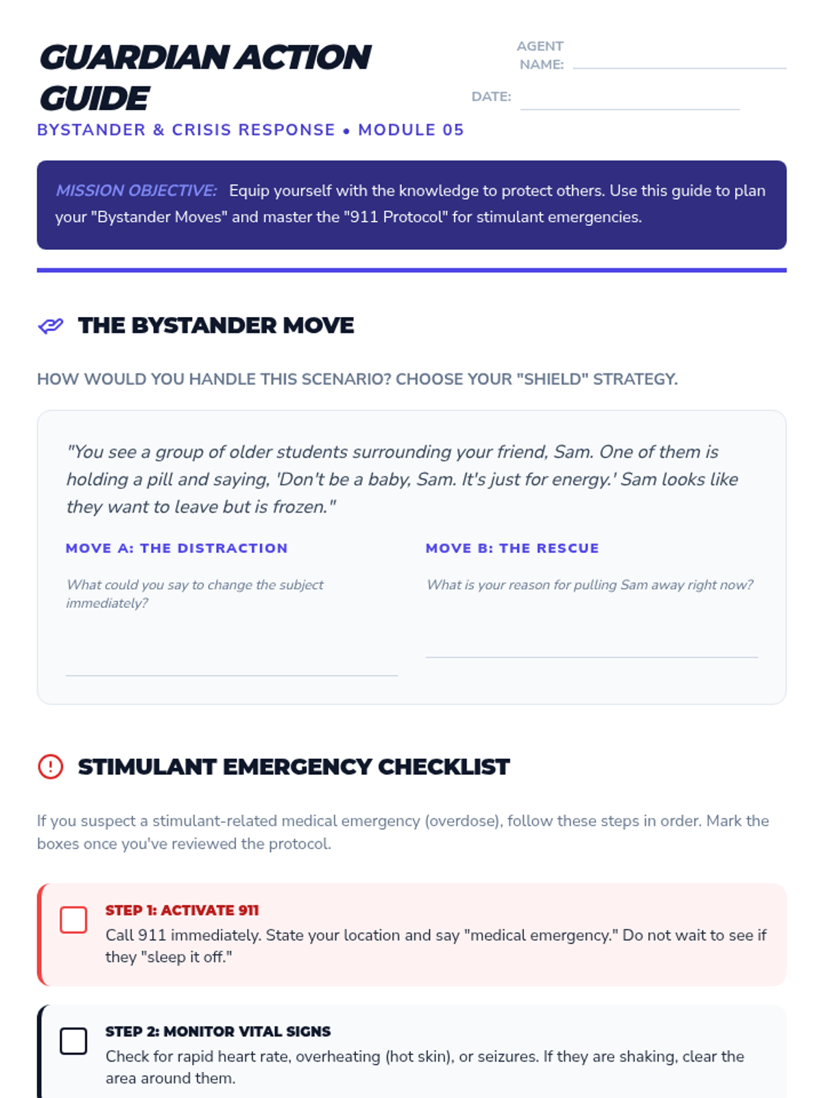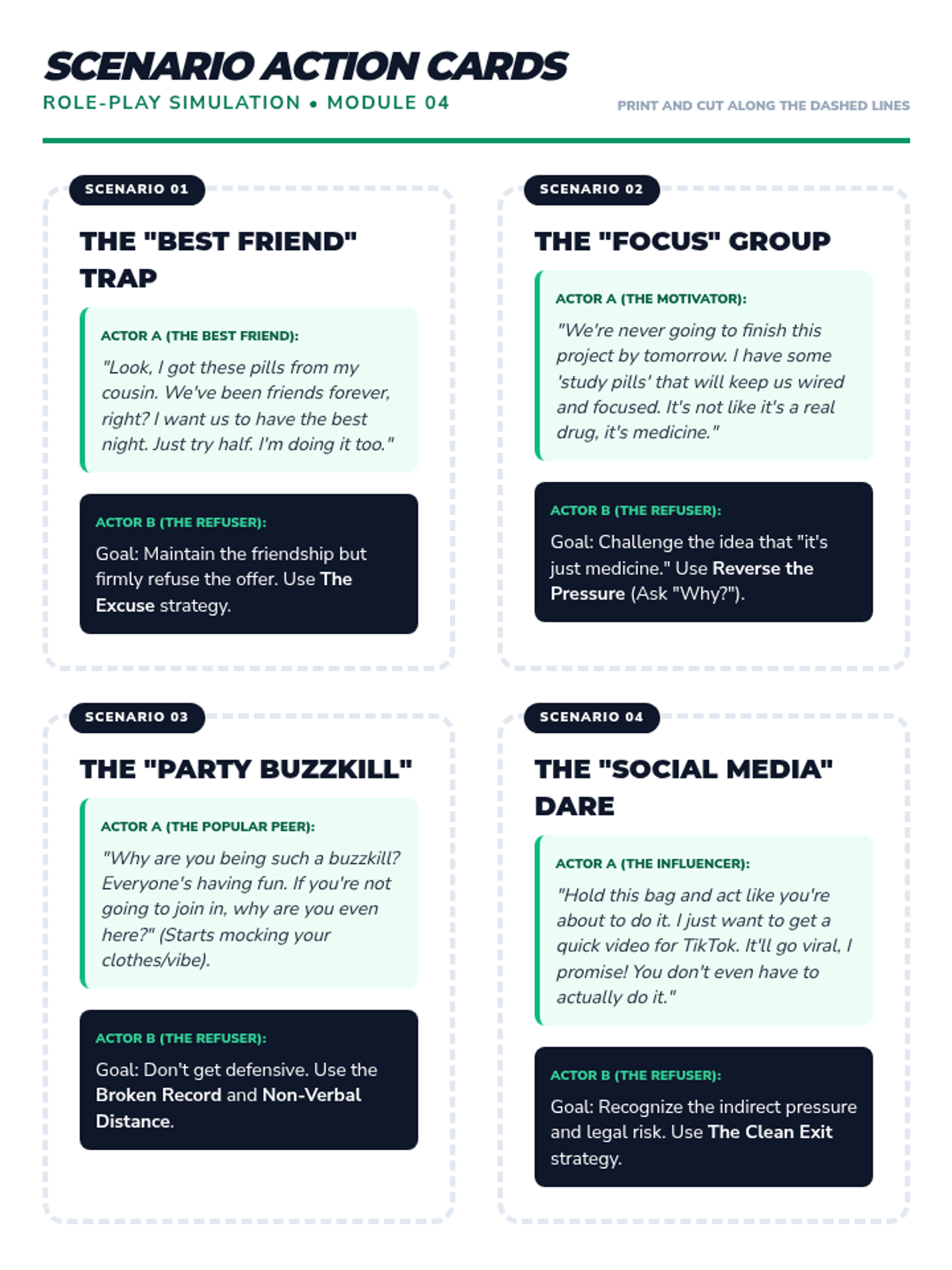 An empowerment-focused sequence for 8th-grade students on stimulant awareness, prioritizing practical refusal strategies, non-verbal communication, and bystander intervention through simulation and role-play.