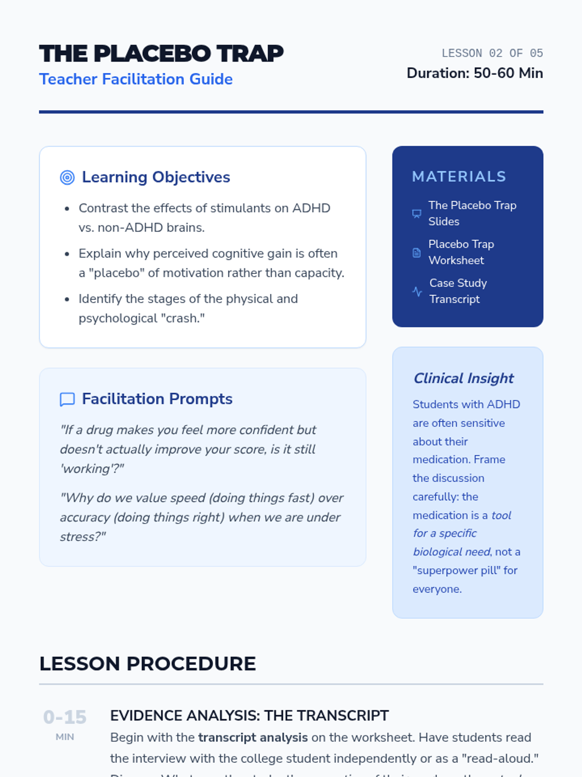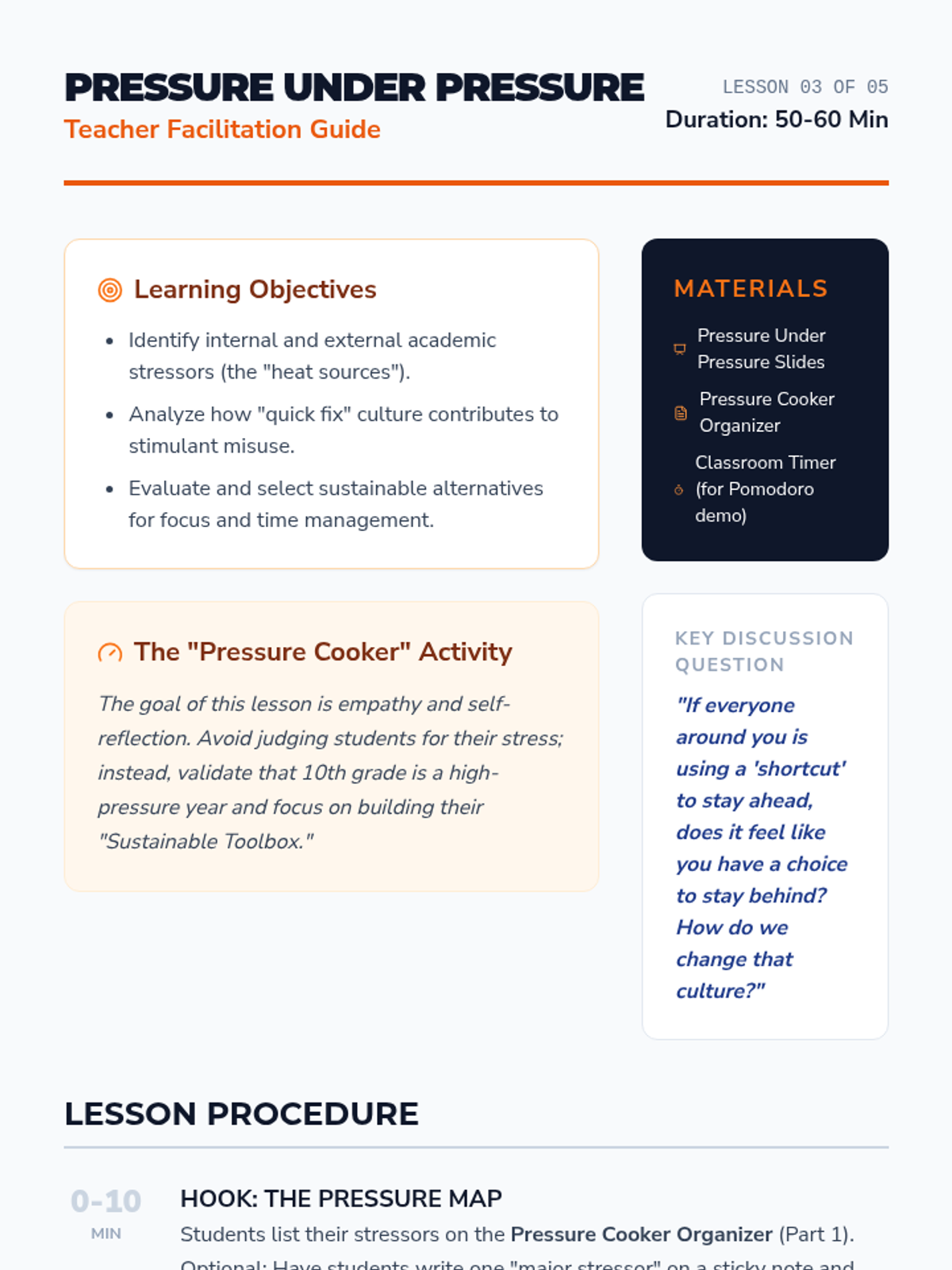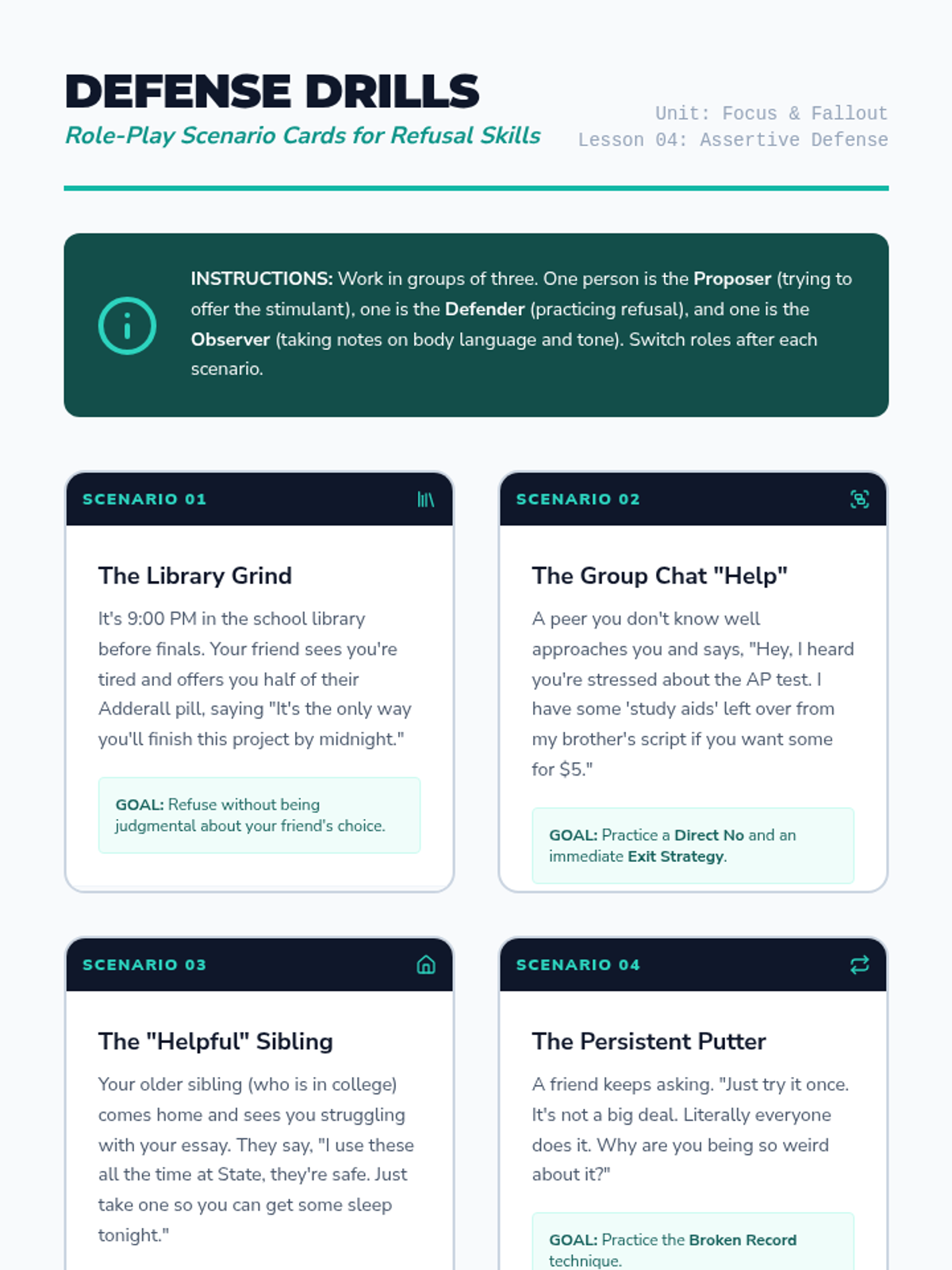 This 10th-grade sequence examines the social, legal, and cognitive impacts of prescription stimulant misuse. Students debunk myths about 'study drugs,' analyze the root causes of academic stress, and develop refusal skills through role-play, culminating in an ethical debate on academic performance enhancement.