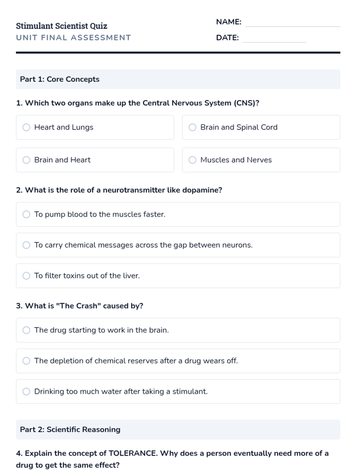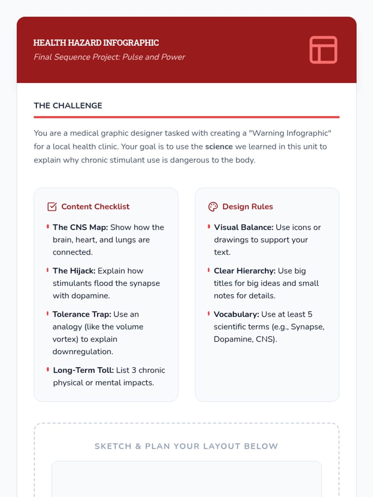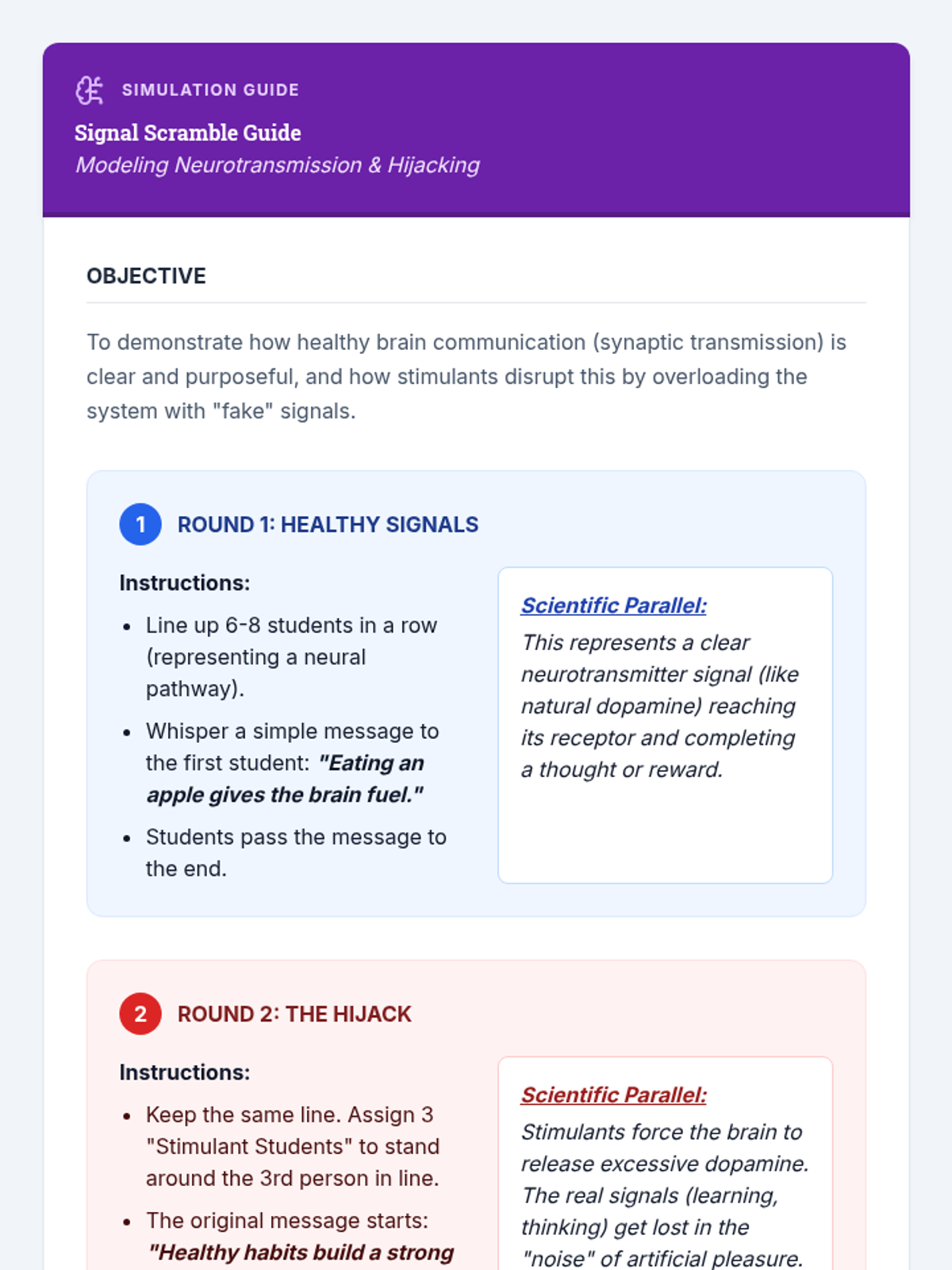 A comprehensive 6th-grade health sequence exploring the physiological effects of stimulants on the central nervous system, from caffeine to high-potency substances. Students investigate anatomy, neurotransmission, and the cycle of addiction through hands-on activities and scientific modeling.