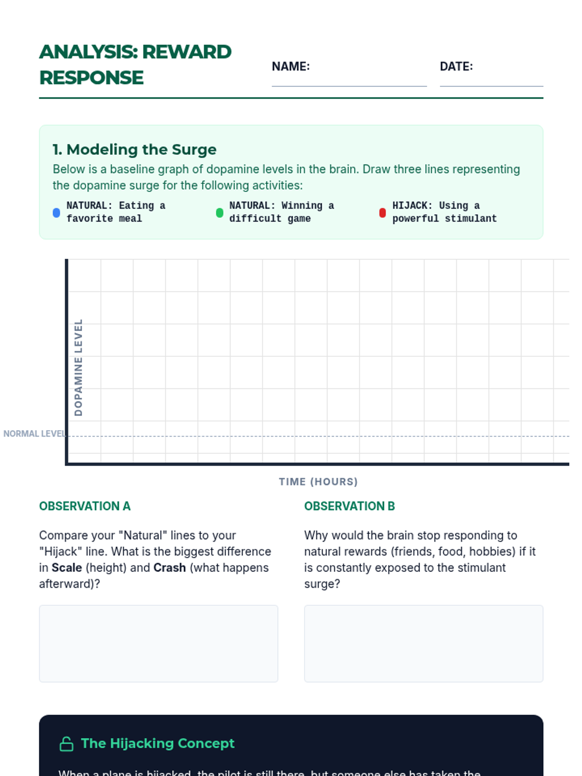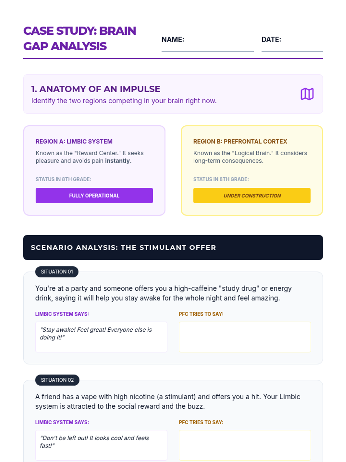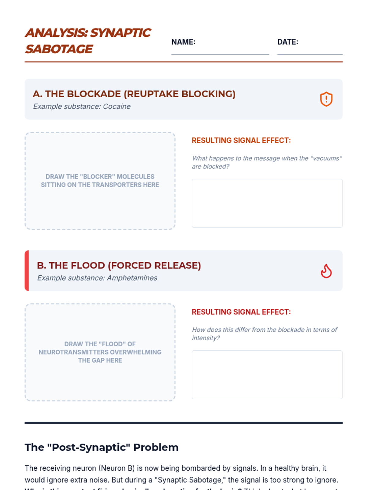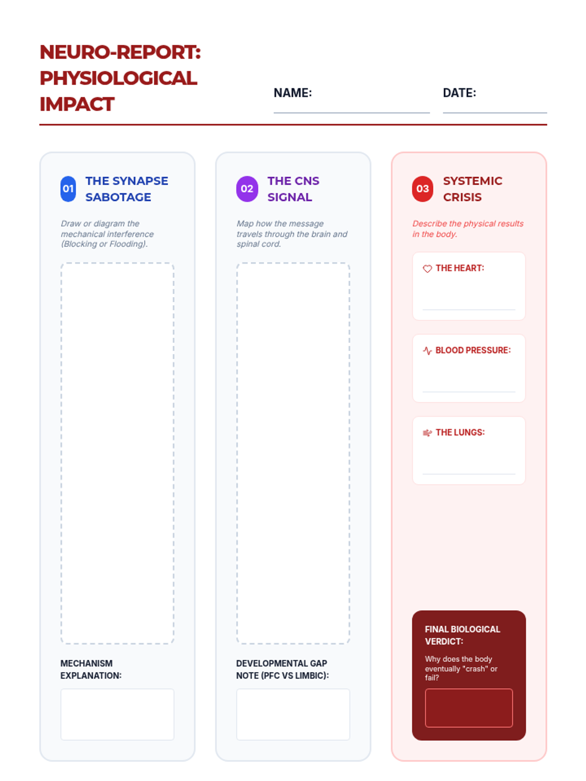 A scientific inquiry into how stimulants interact with the human body, specifically the Central Nervous System (CNS). Students map normal brain function, investigate how substances disrupt neurotransmission, and analyze why the developing adolescent brain is particularly vulnerable to stimulant-induced damage.