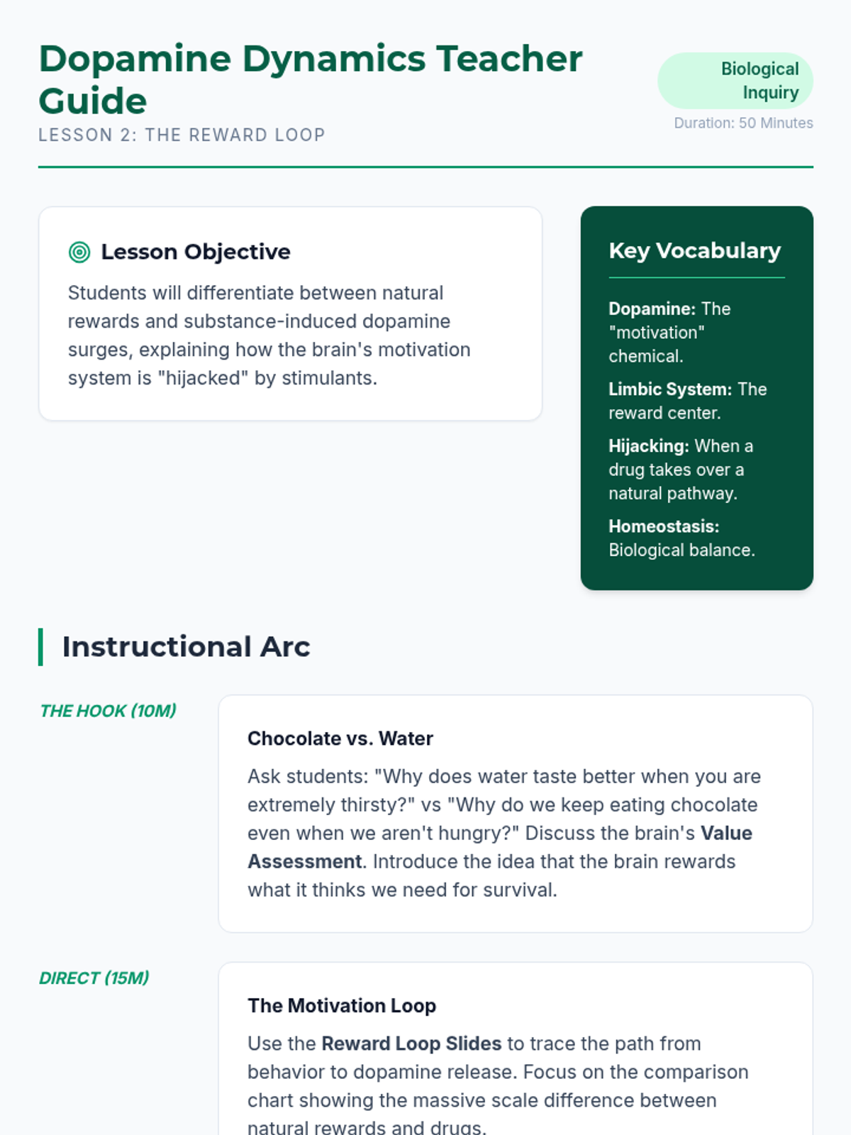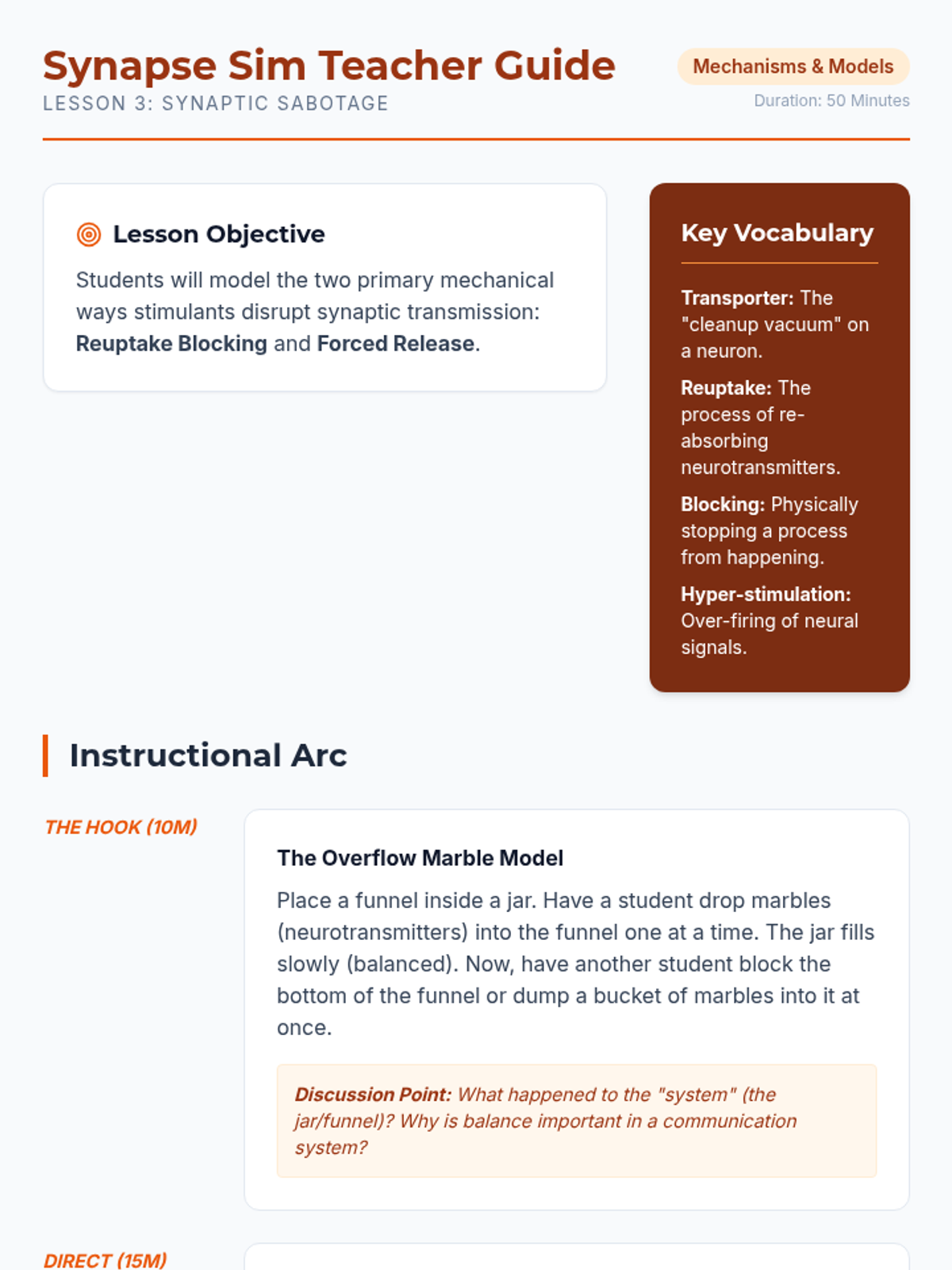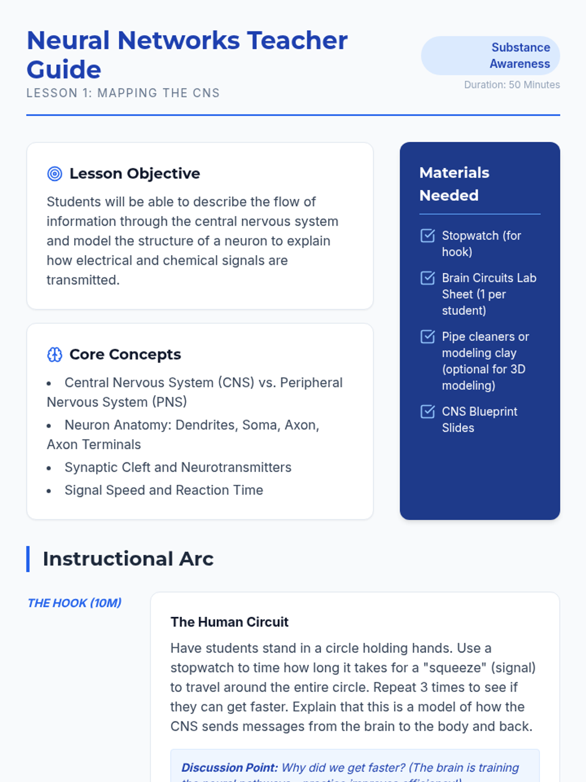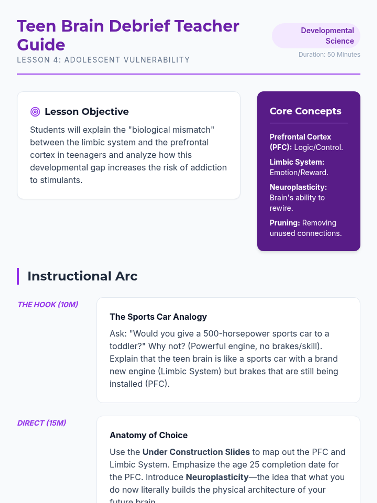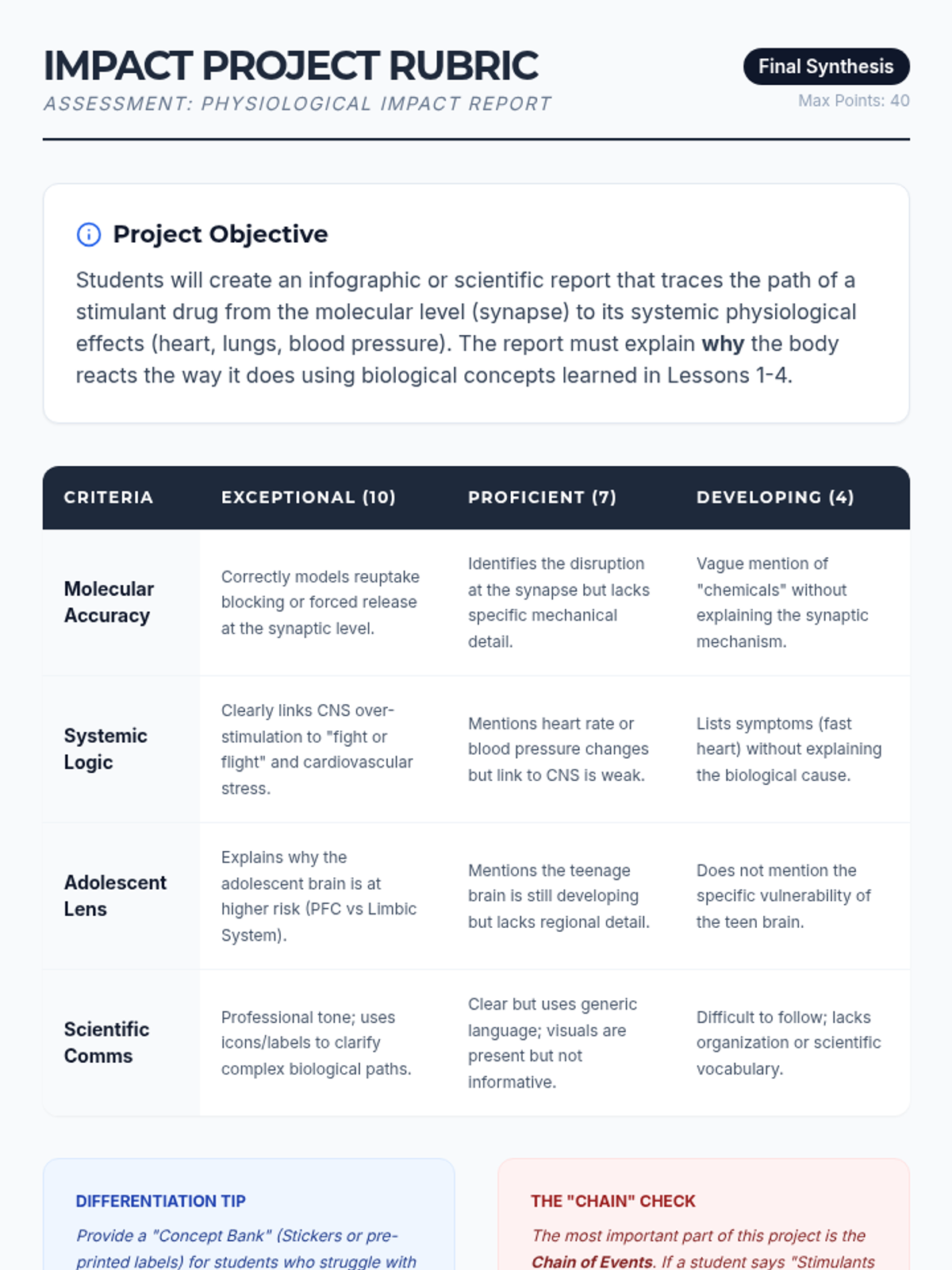 A scientific inquiry into how stimulants interact with the human body, specifically the Central Nervous System (CNS). Students map normal brain function, investigate how substances disrupt neurotransmission, and analyze why the developing adolescent brain is particularly vulnerable to stimulant-induced damage.