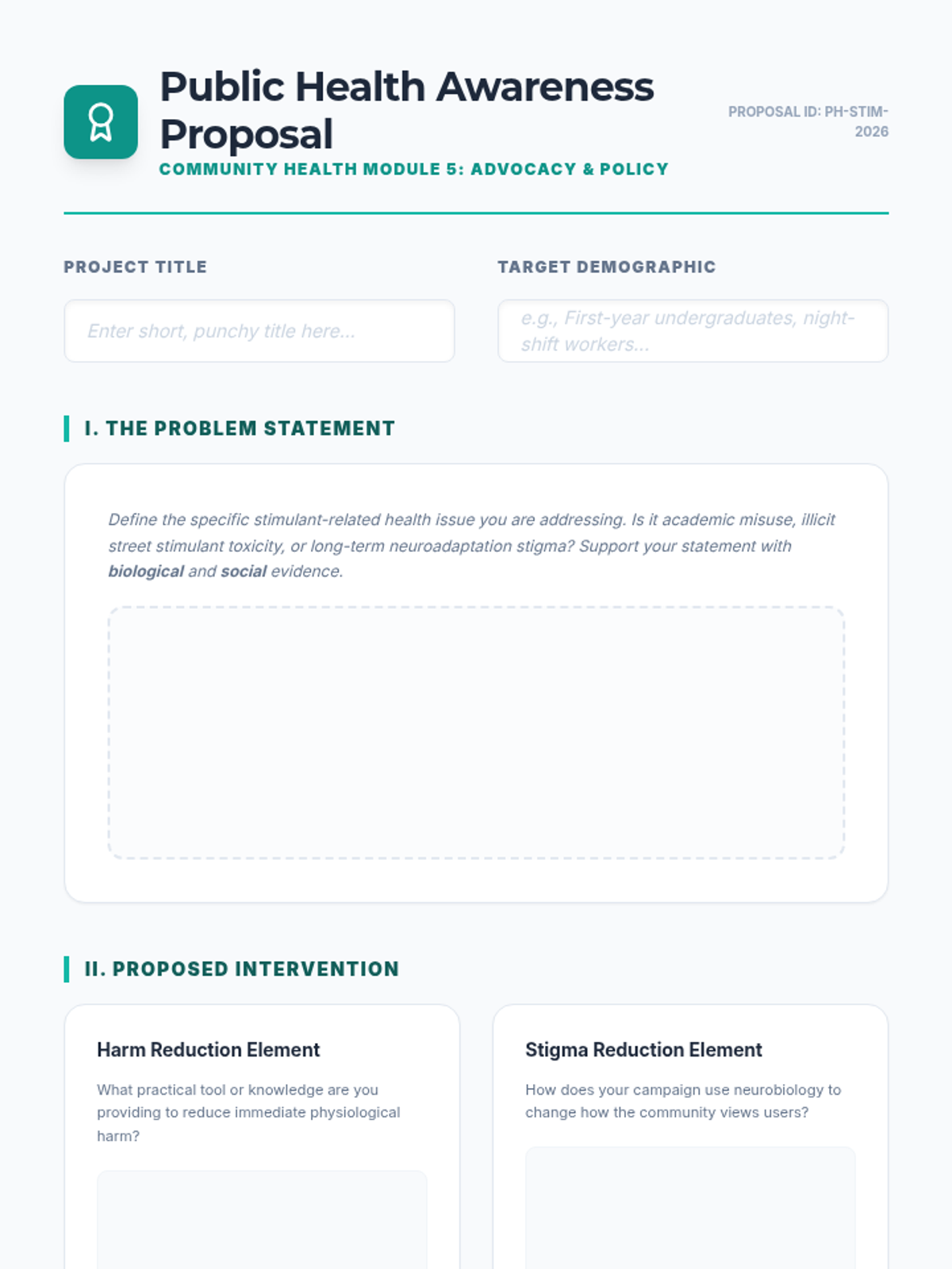 A comprehensive undergraduate-level sequence exploring the pharmacology, neurobiology, and public health implications of stimulant drugs, from molecular mechanisms to community intervention.