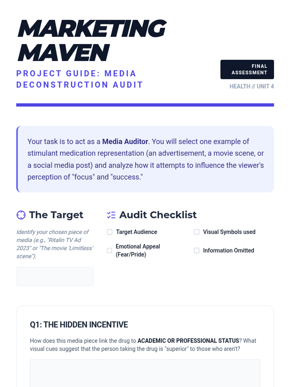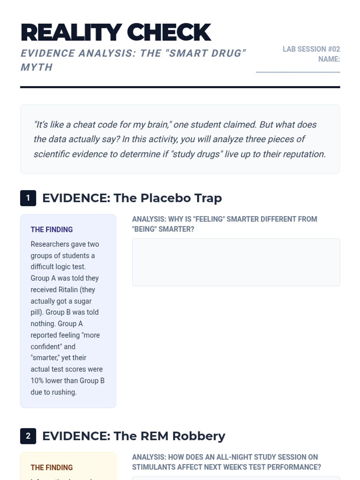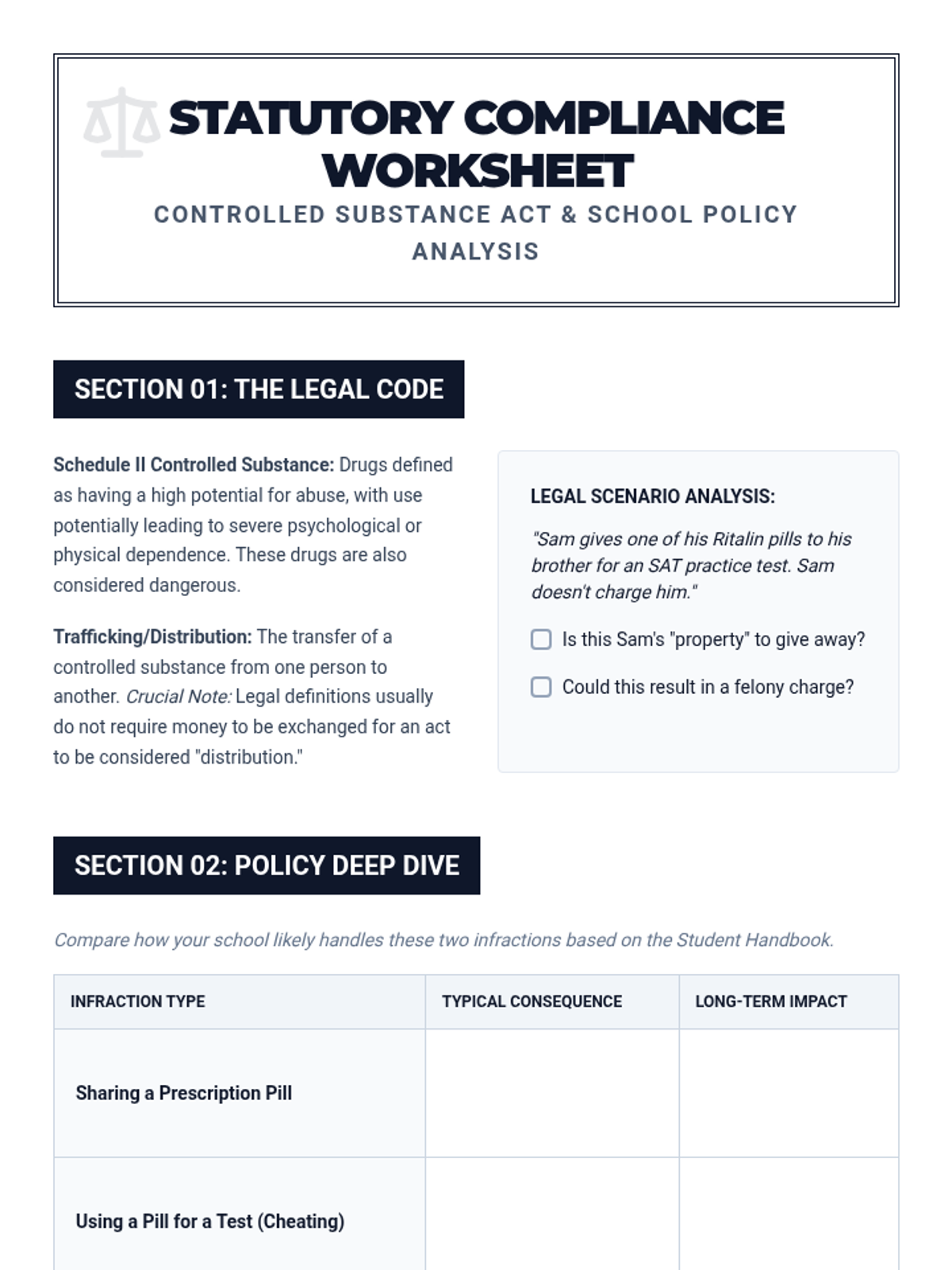 A comprehensive 5-lesson sequence for 9th-grade students exploring the medical reality, legal risks, and academic myths surrounding prescription stimulants. Students will analyze the difference between therapeutic use and misuse while developing healthy stress management strategies and media literacy skills.