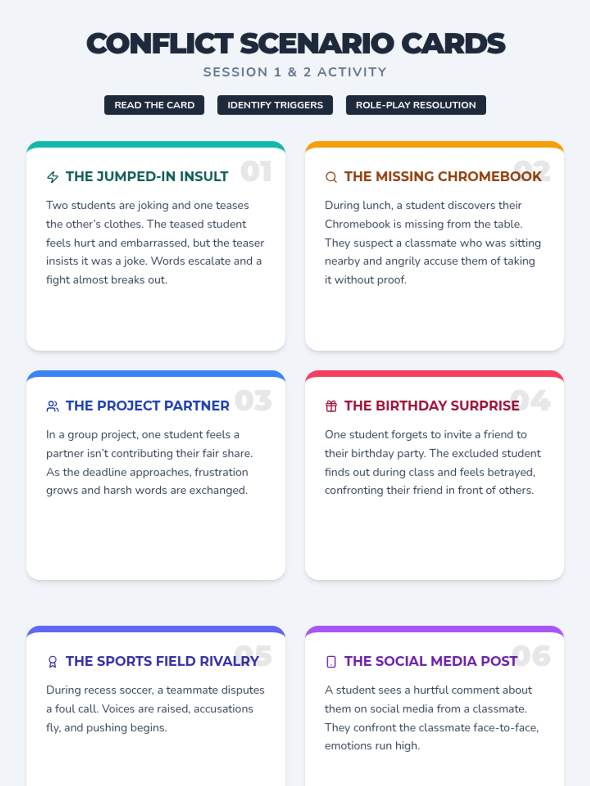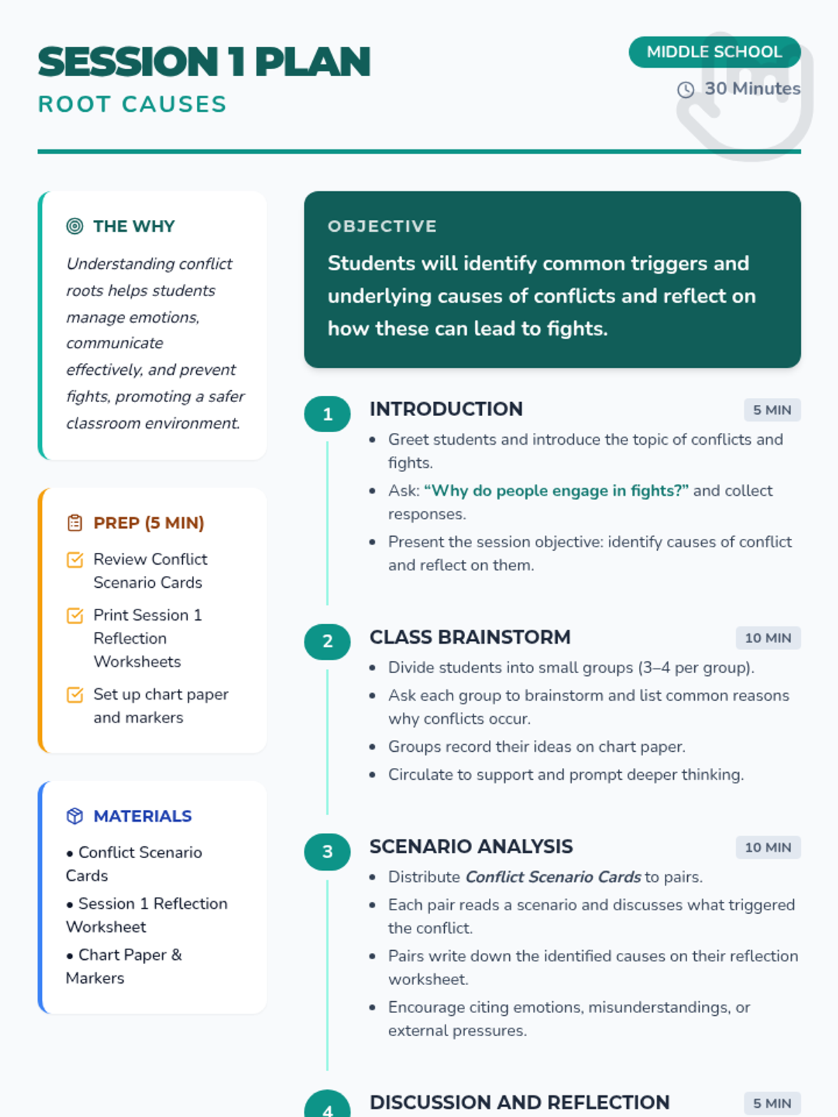 A two-session middle school program designed to help students identify the root causes of conflict and master peaceful resolution strategies to prevent physical fights and foster a safer school community.