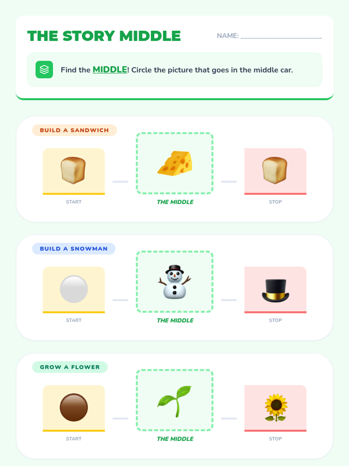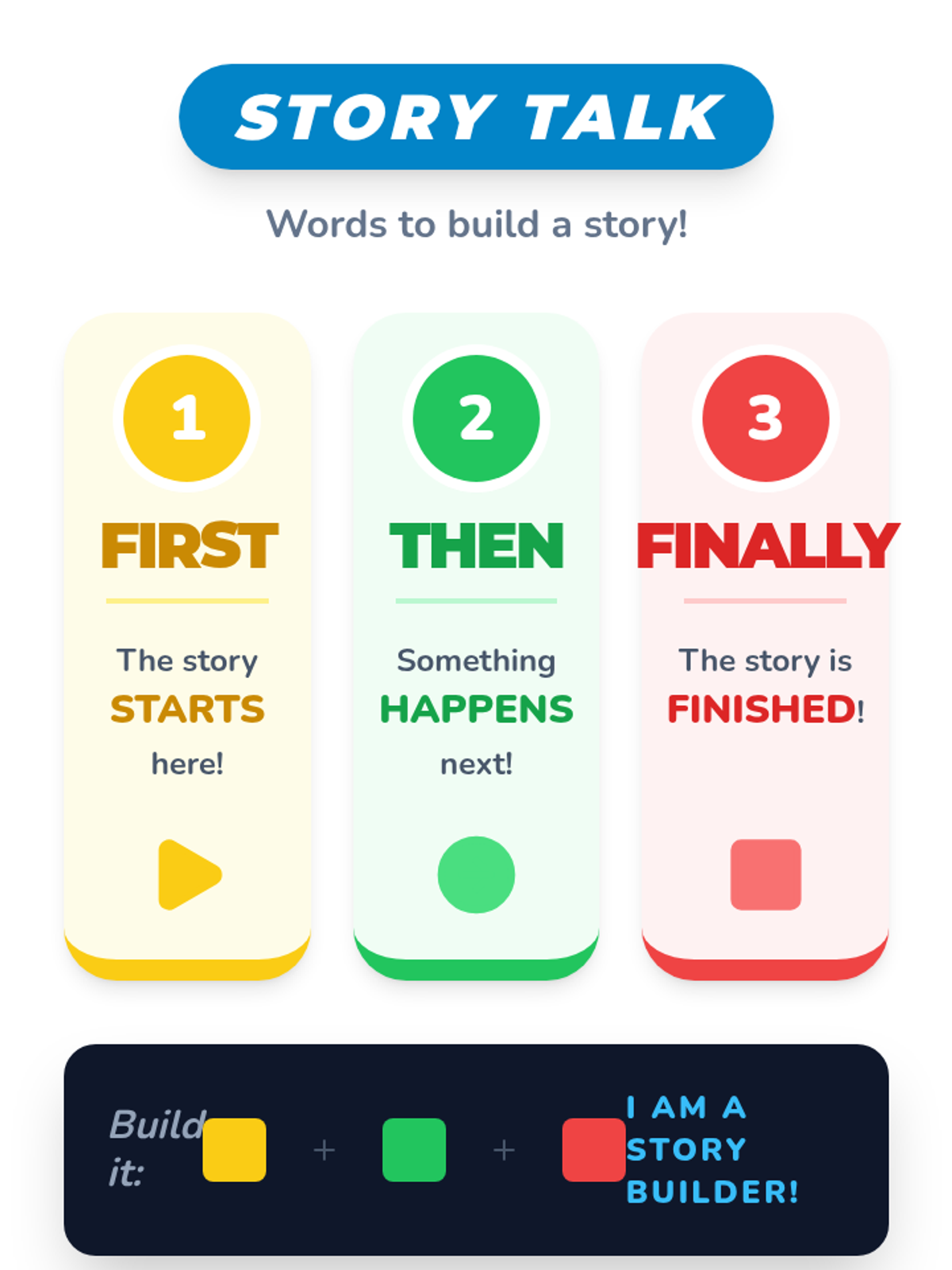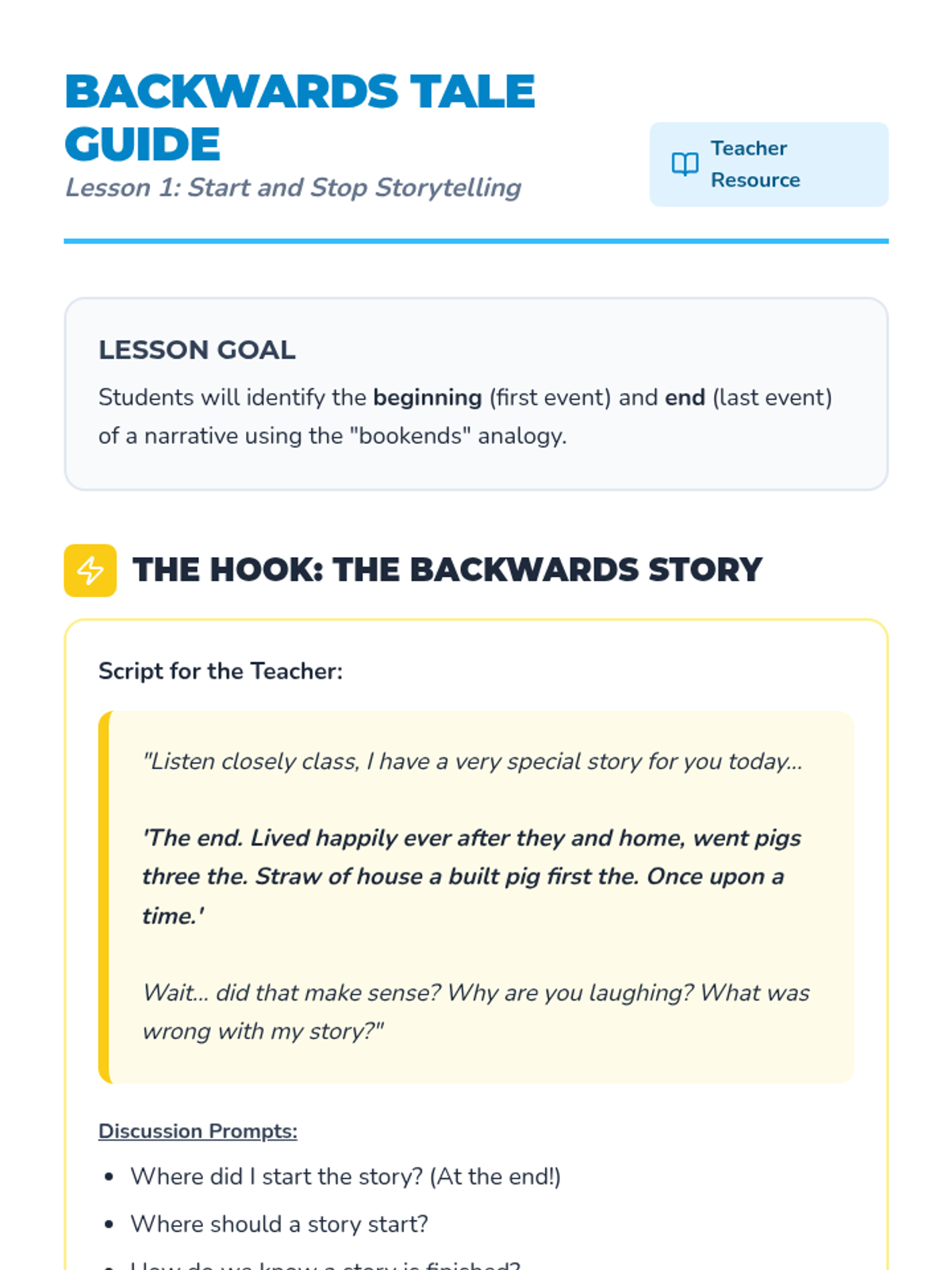 A Pre-K sequence focused on understanding the logical structure of stories. Students learn to identify and order events using 'beginning, middle, and end' through interactive play, visual cards, and transition words.
