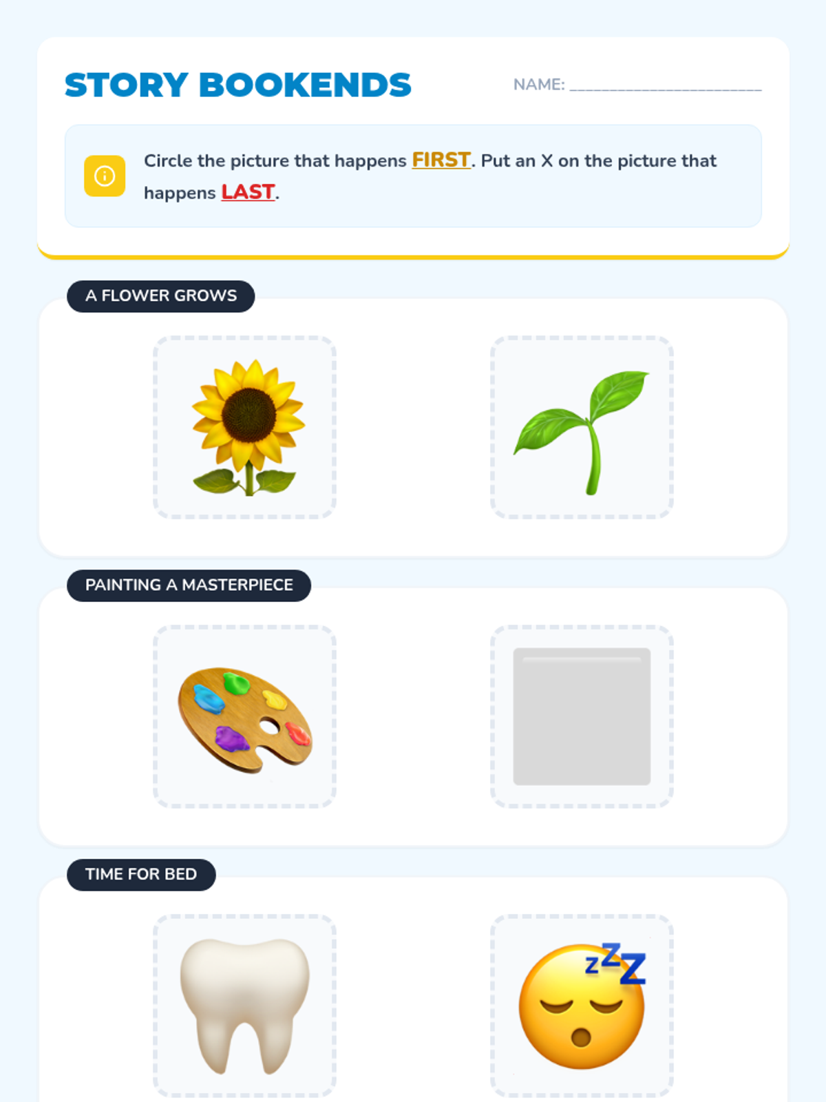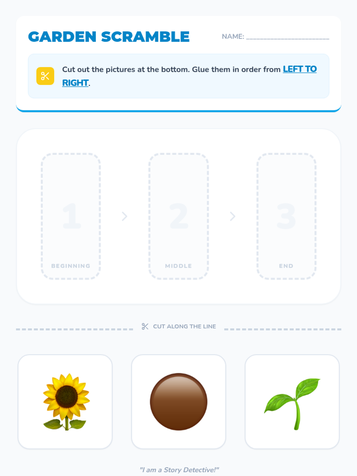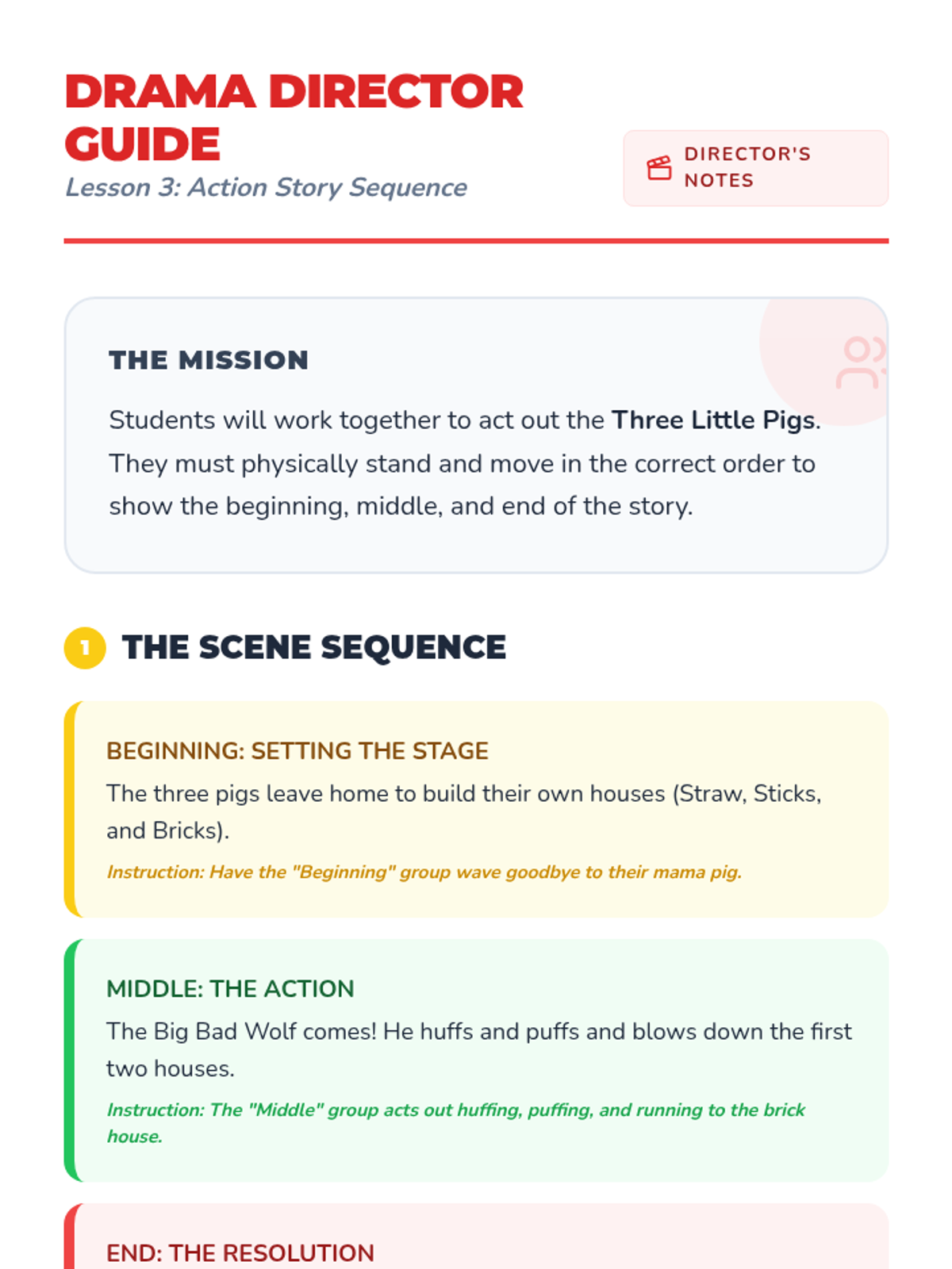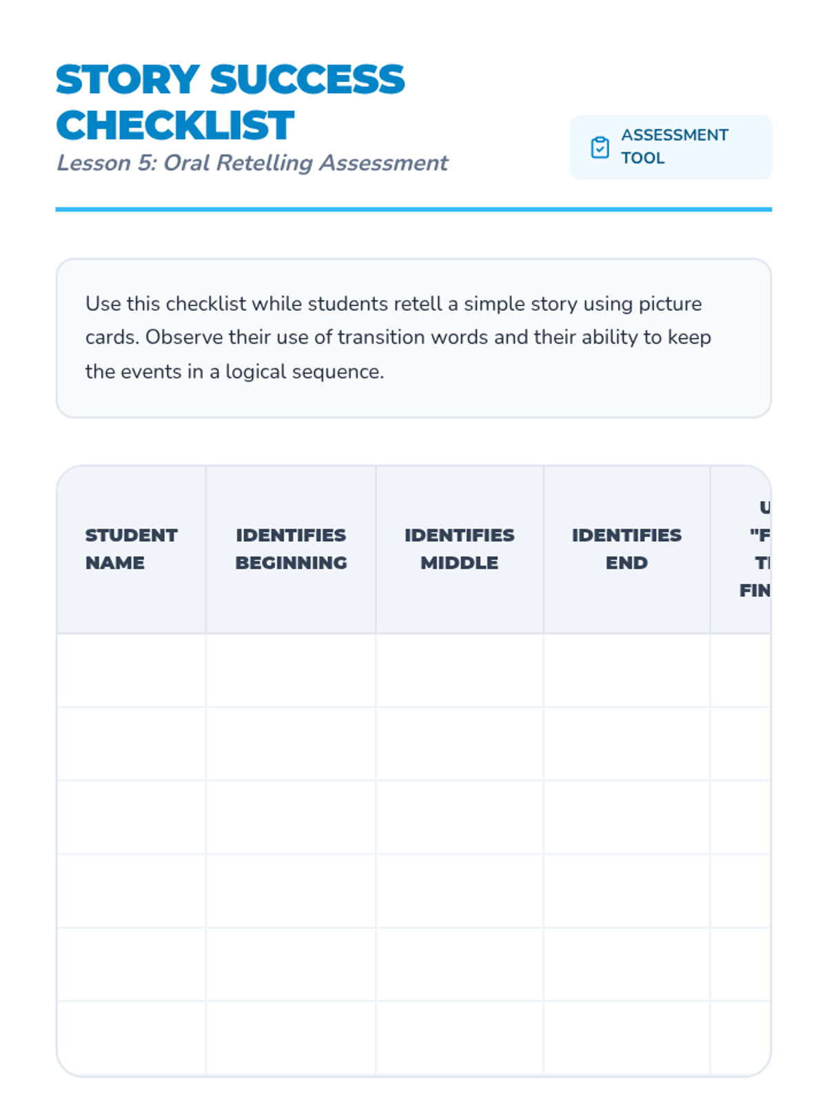 A Pre-K sequence focused on understanding the logical structure of stories. Students learn to identify and order events using 'beginning, middle, and end' through interactive play, visual cards, and transition words.