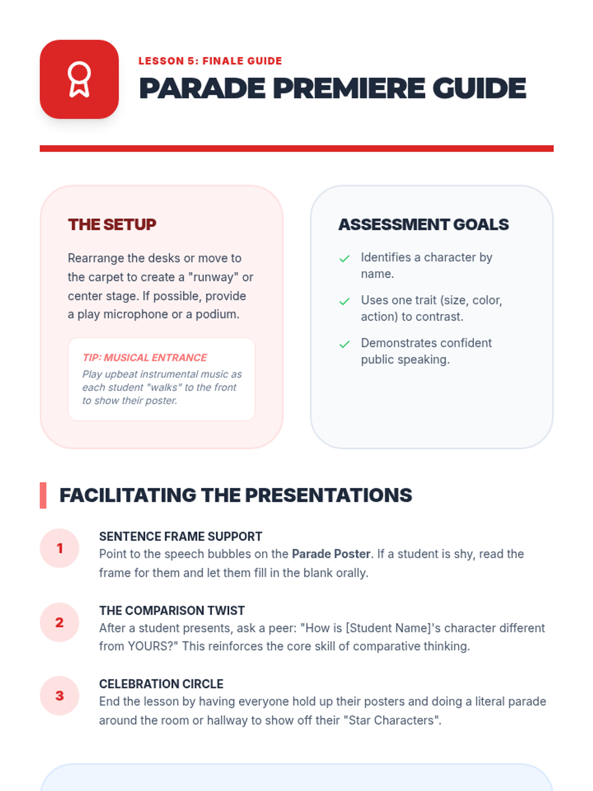 A sequence designed for WIDA Levels 1-2 (Entering/Emerging) focused on the Language of Language Arts. Students learn to identify and describe characters, settings, and story sequences using high-visual support and scaffolded sentence frames.
