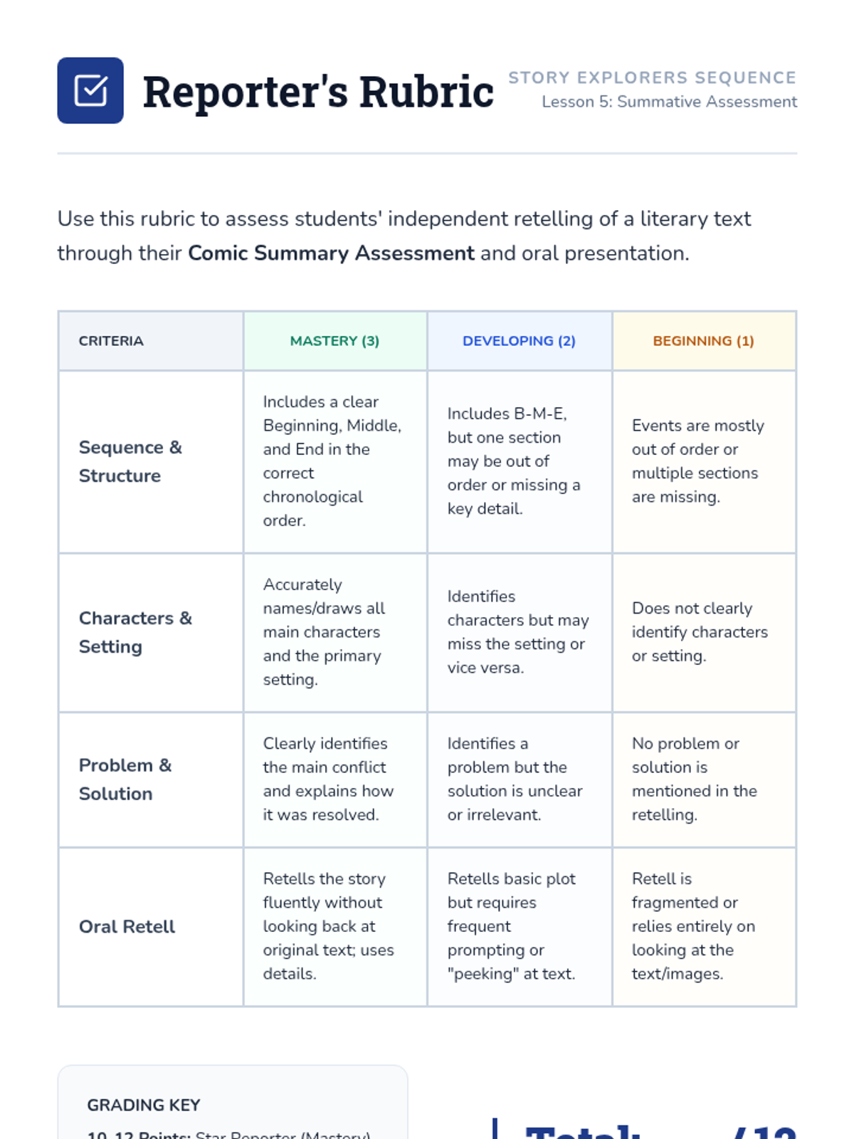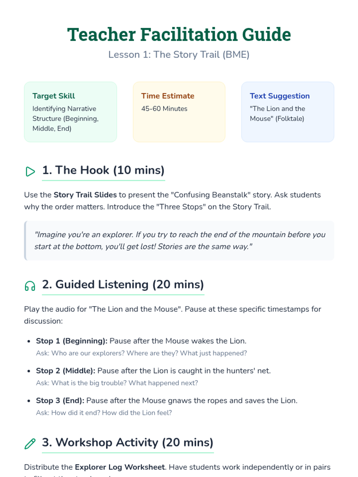 This sequence helps 2nd-grade students build reading comprehension and retelling skills through audio-supported literary texts, focusing on plot structure, sequencing, and the Five-Finger Retell strategy.