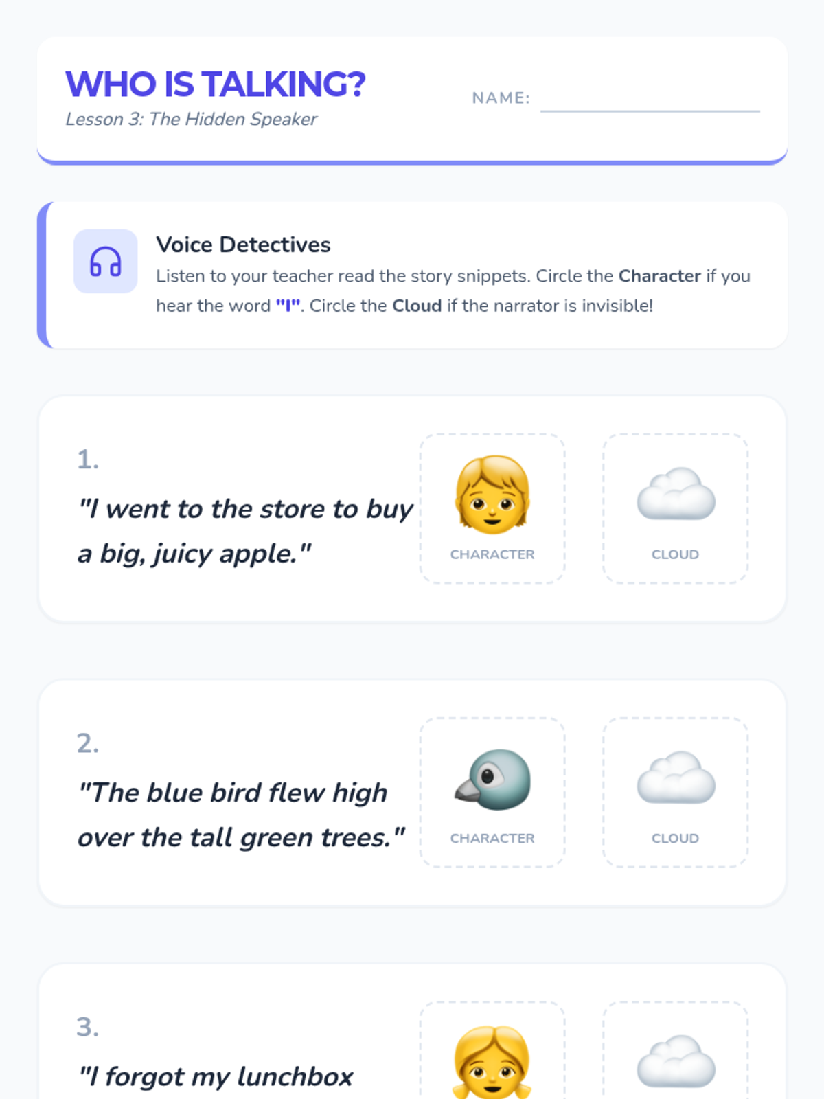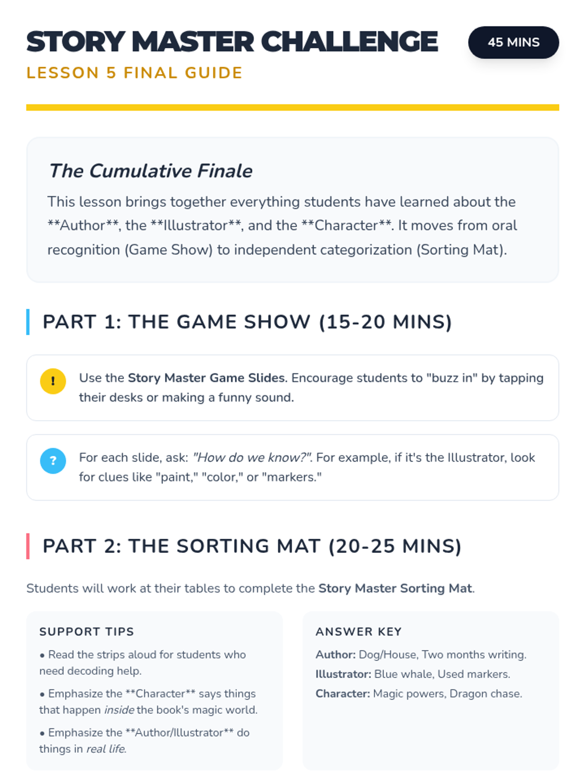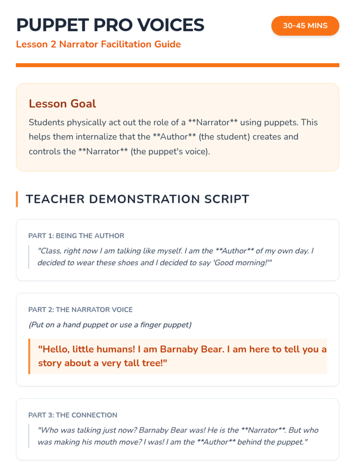 A foundational sequence for Kindergarten students to distinguish between the roles of Author, Illustrator, and Narrator. Using role-play and creative activities, students learn that stories are crafted by real people but told by various voices.