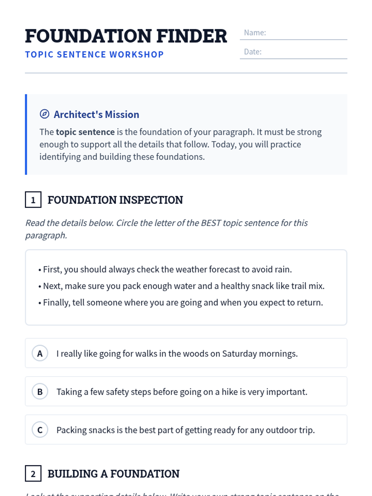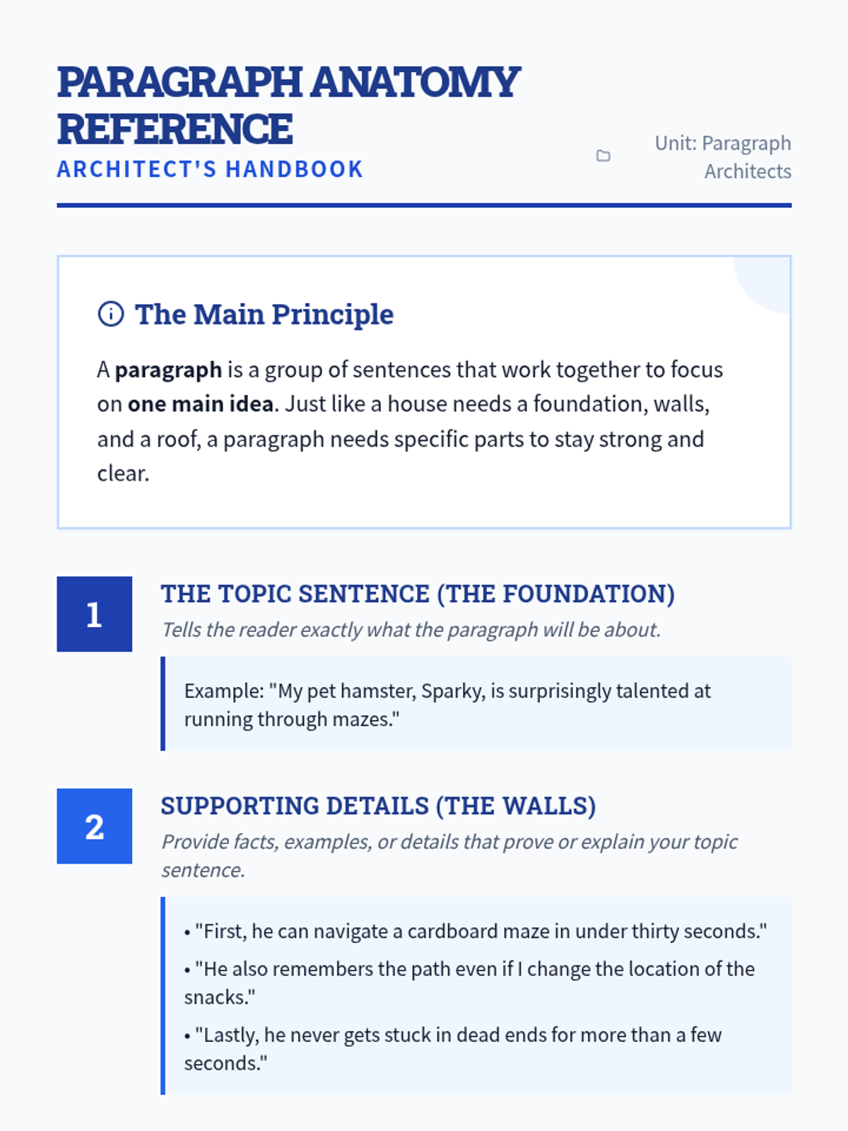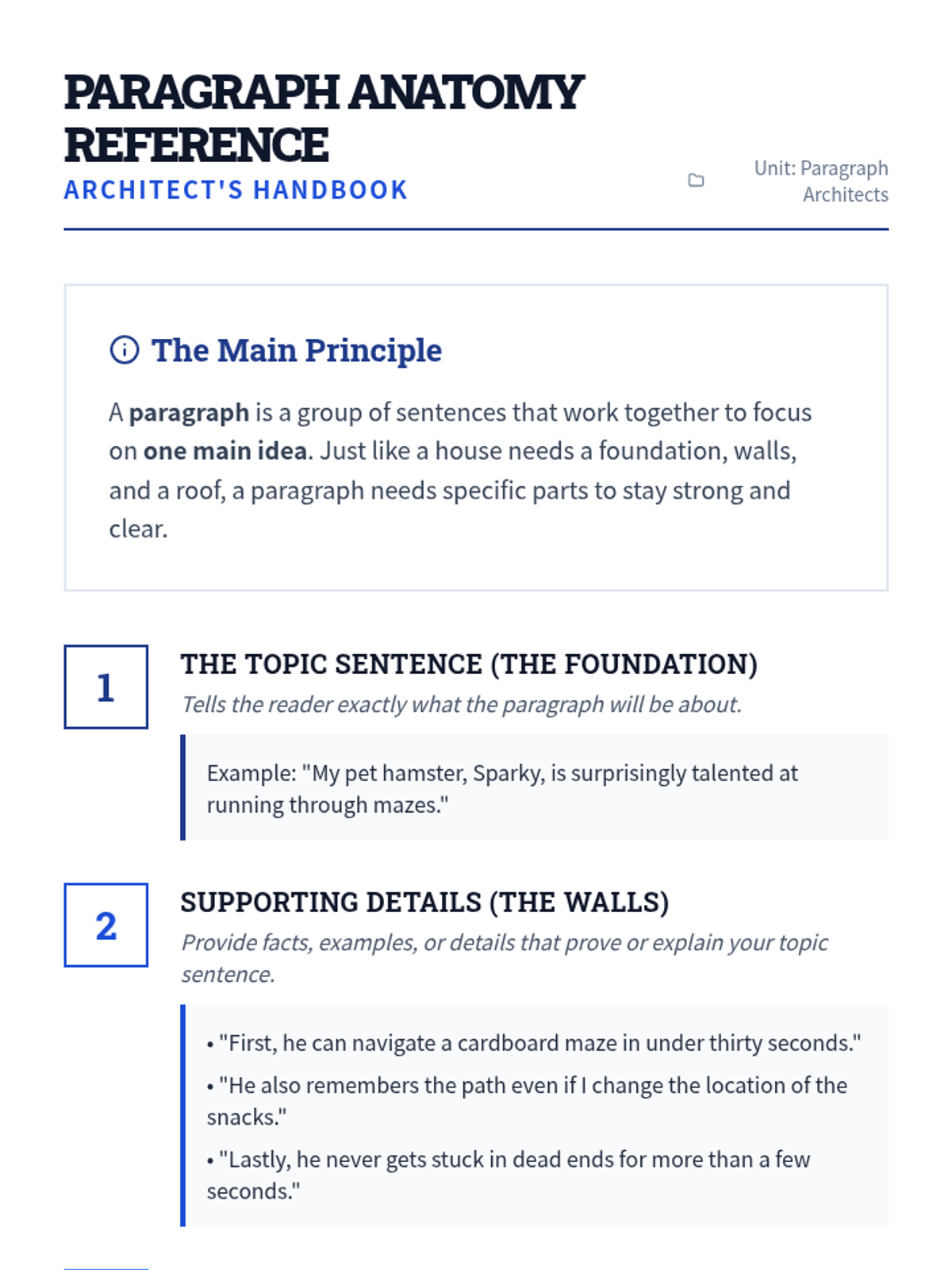 A comprehensive 2-week unit introducing students to the core components of paragraph writing, from topic sentences to concluding statements and transitions. The unit uses an architectural 'blueprint' theme to help students visualize the structure of their writing.