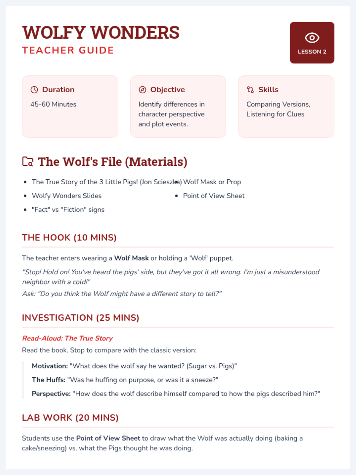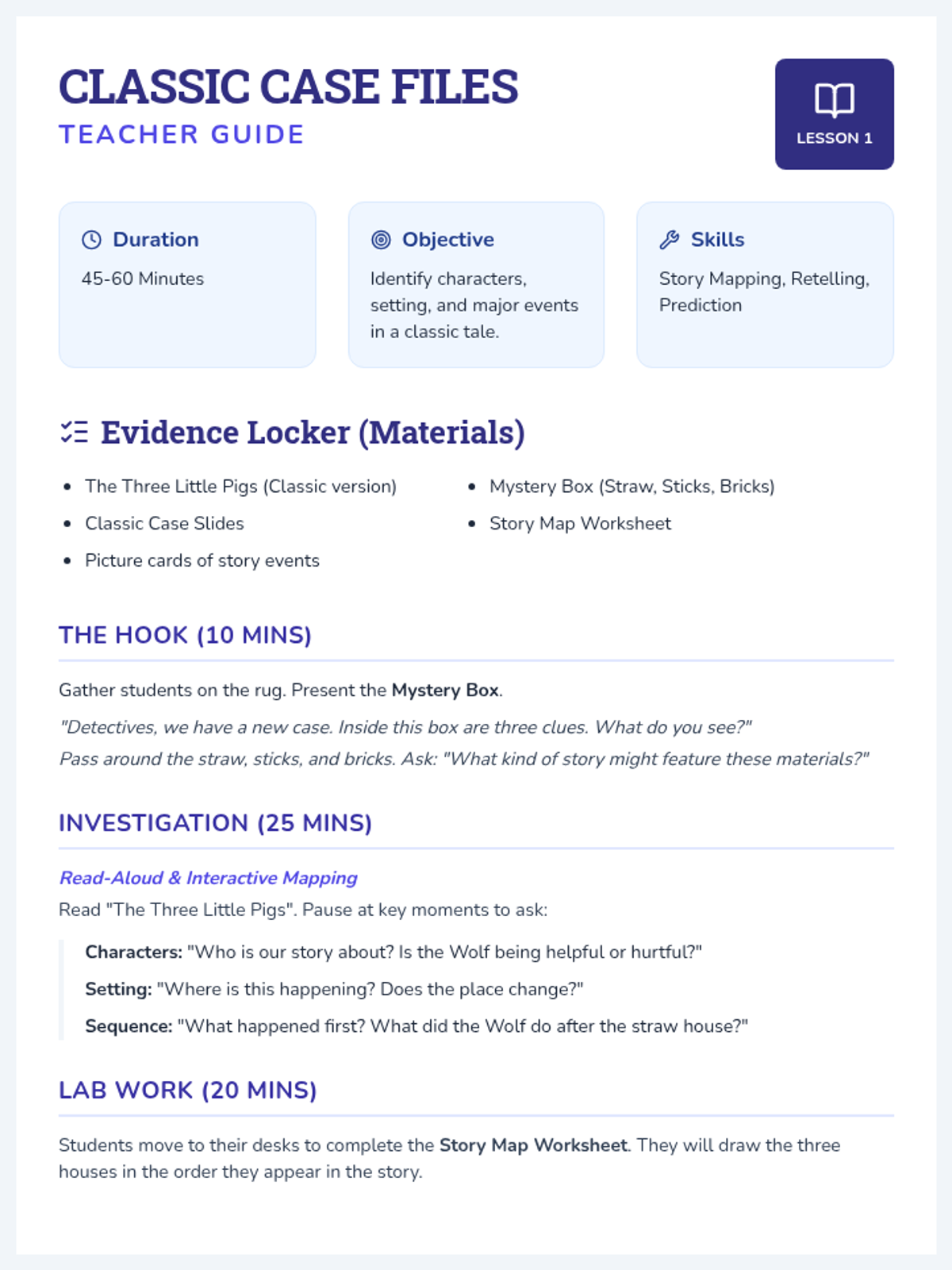 A series of lessons focused on developing reading comprehension through mystery stories, with tiered assignments for different grade levels.