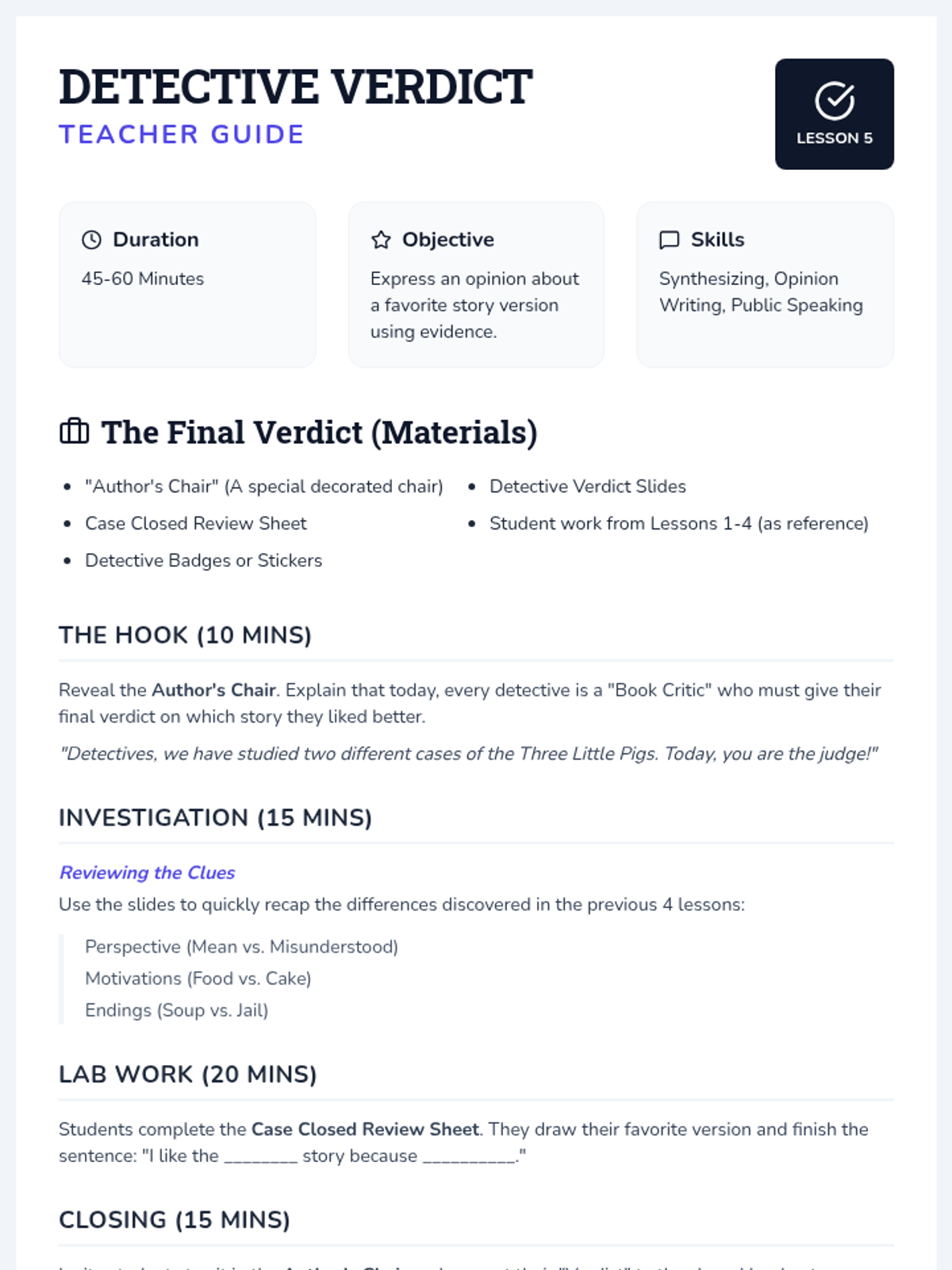 A comprehensive 5-day phonics curriculum for grades K-3 using a detective agency theme. Students progress from sound sleuths to master linguists, uncovering the secrets of CVC words, blends, digraphs, silent e, vowel teams, and multi-syllabic words through investigative play and structured practice.
