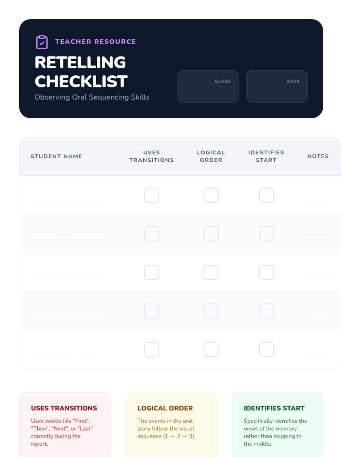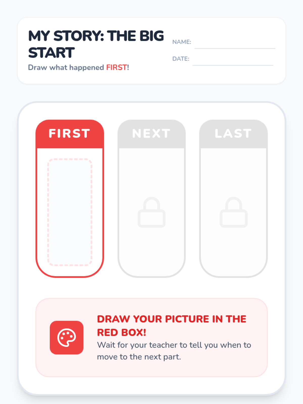 This sequence teaches Kindergarten students to use visualization and sketching as mnemonic devices for narrative comprehension. Students move from capturing single 'snapshots' of key events to building a full three-part storyboard, supporting working memory and story recall.