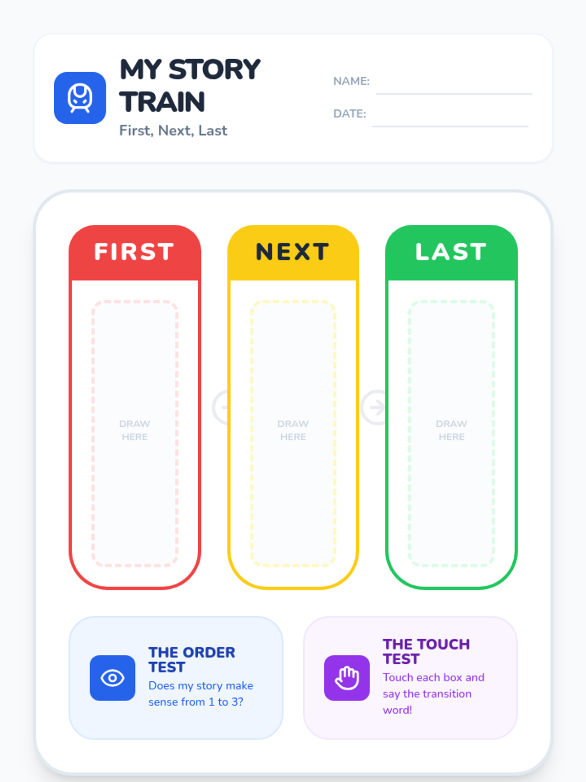 A Kindergarten writing sequence focused on using three-step linear flow charts (First, Next, Last) to organize narratives. Students move from kinesthetic floor mat activities to sorting picture cards and finally drawing their own three-part stories.