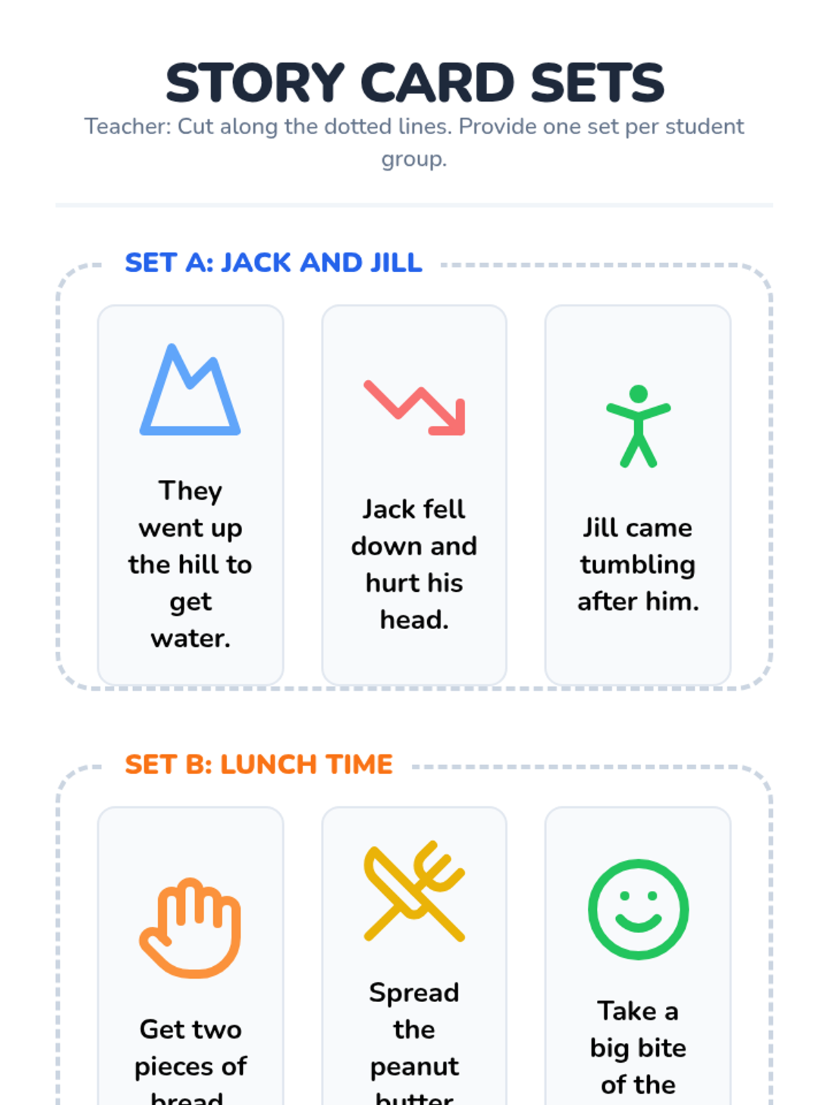 A unit focused on teaching story sequencing across different primary grade levels, from simple 3-step events to complex narrative order.