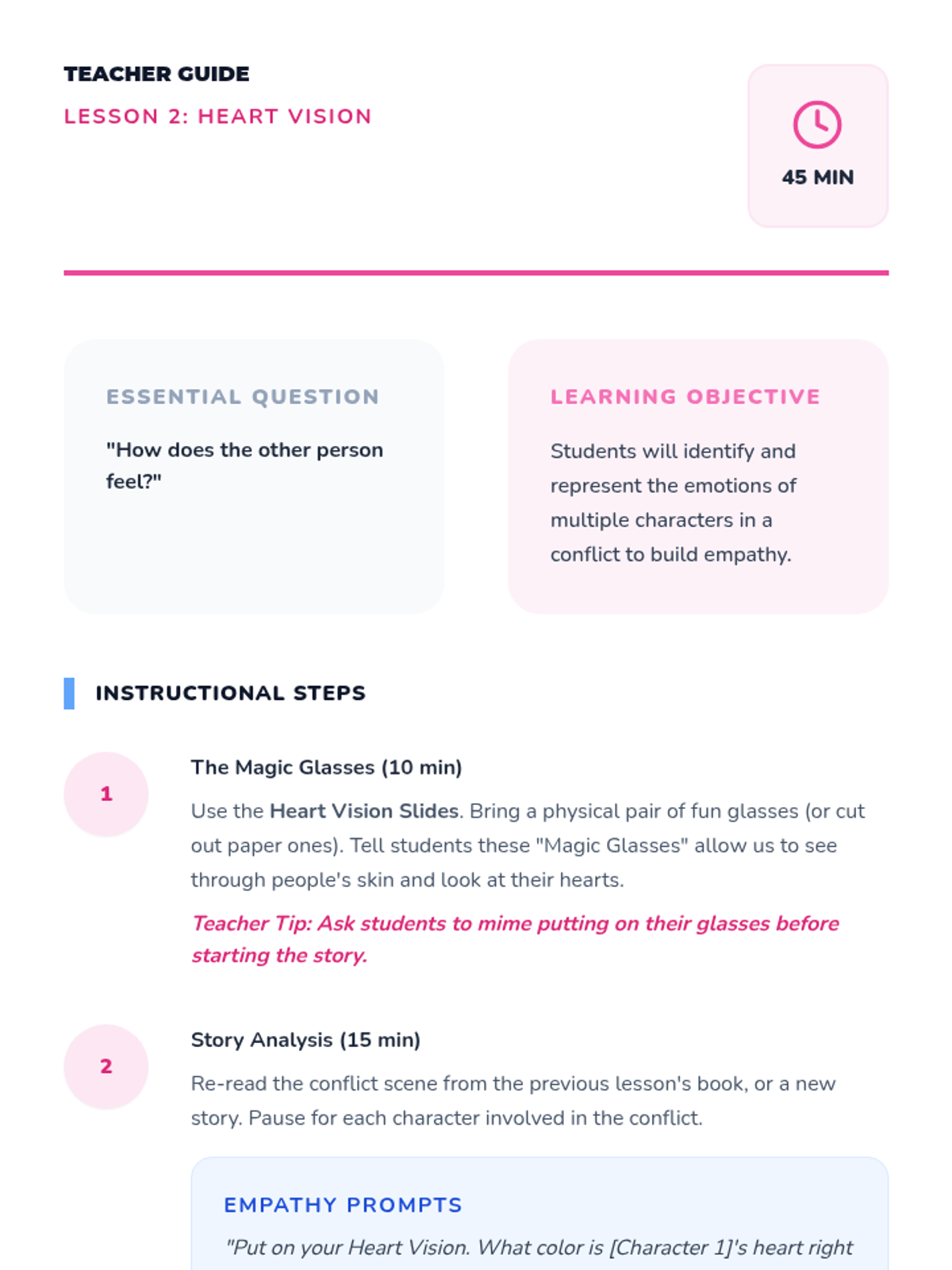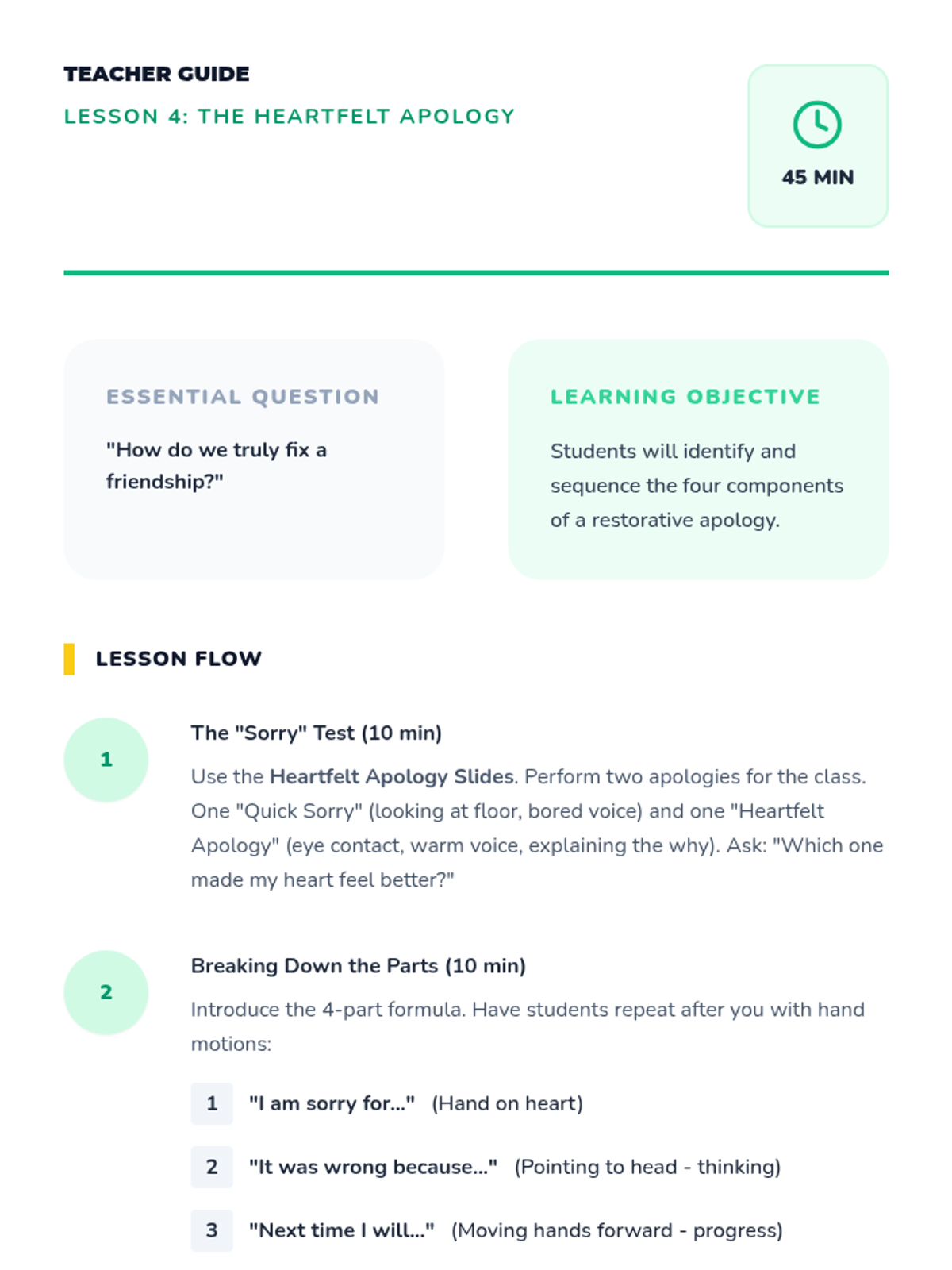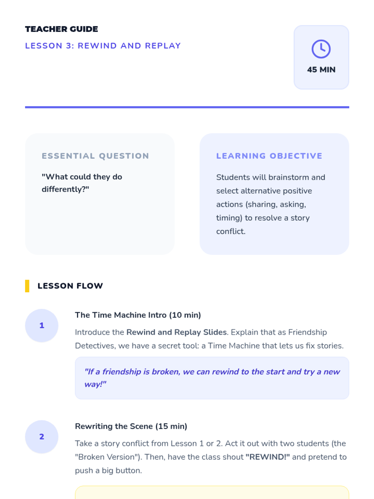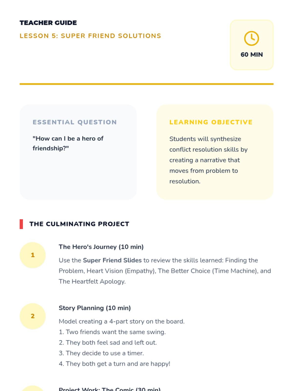 This Kindergarten sequence uses storytelling and narrative analysis to help students identify conflicts, understand different perspectives, and develop practical resolution strategies. Through the 'Storybook Repair Shop' theme, students move from observing character conflicts to practicing restorative apologies and creating their own 'Super Friend' solutions.