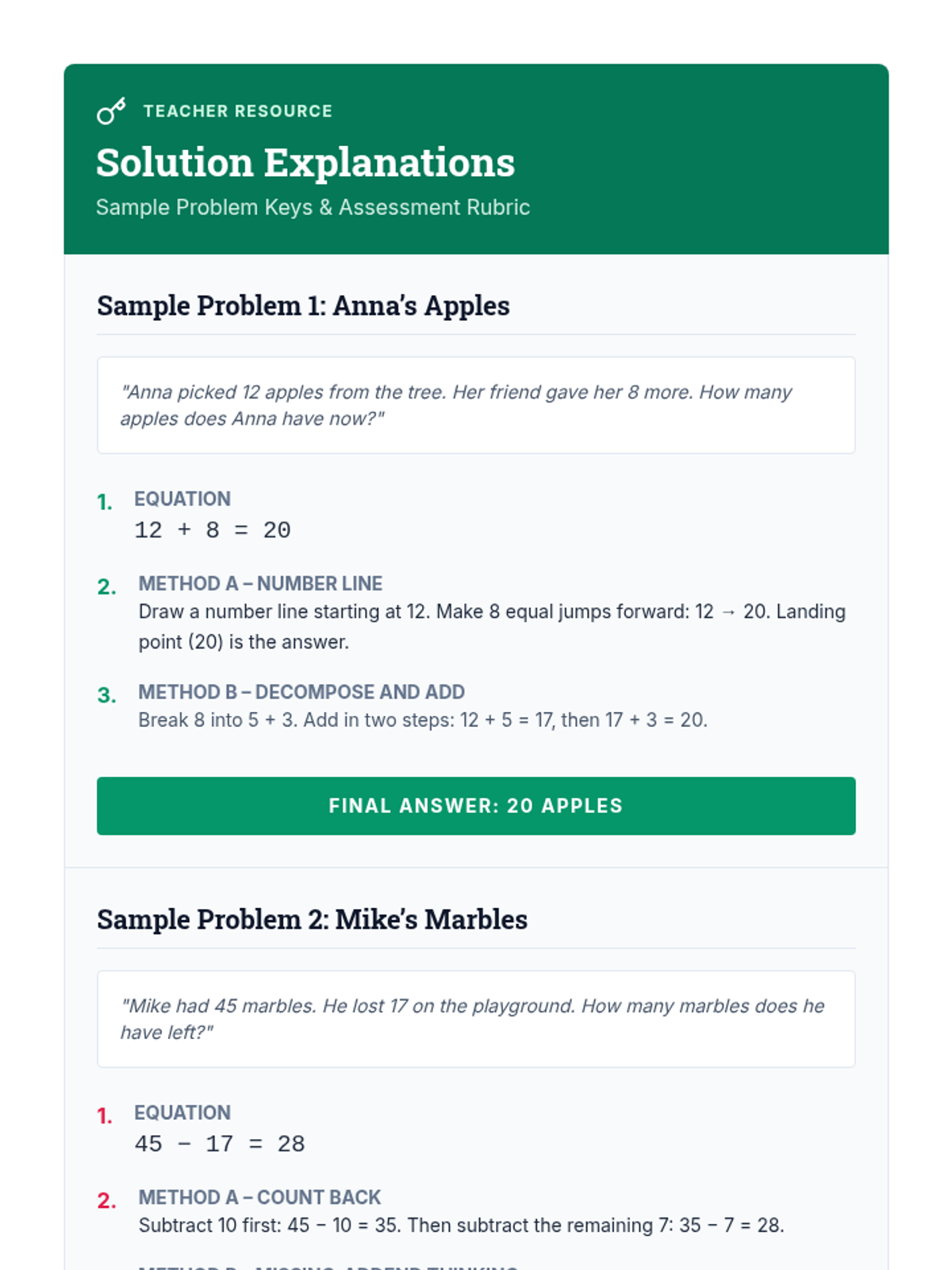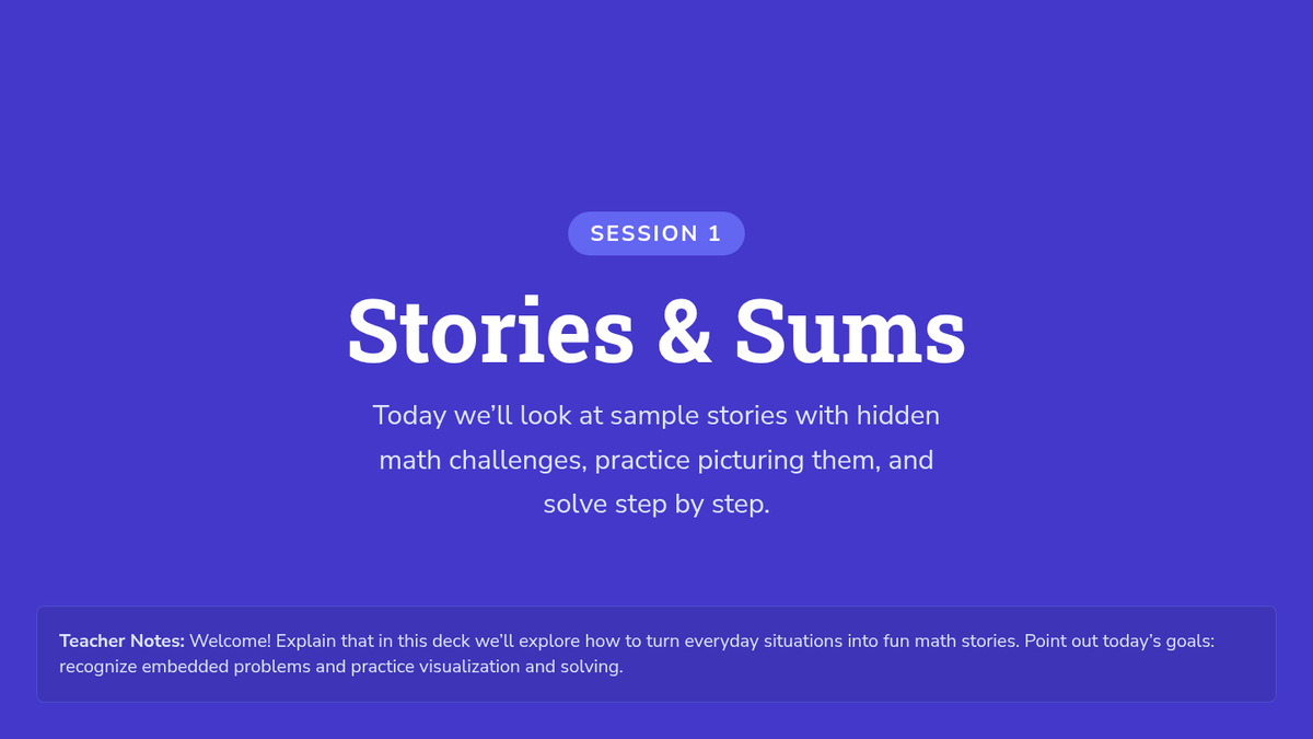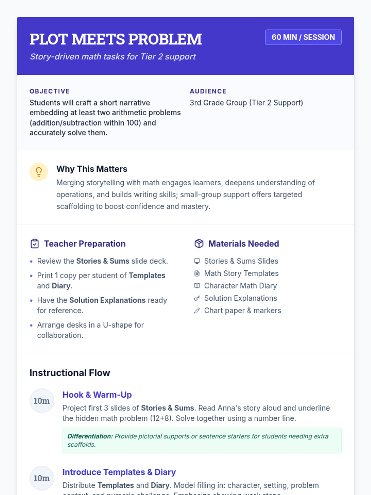A two-session sequence for 3rd grade Tier 2 students that integrates creative storytelling with multi-step math problem solving (addition and subtraction within 100). Students craft original narratives and embed numeric challenges to build both mathematical fluency and writing confidence.