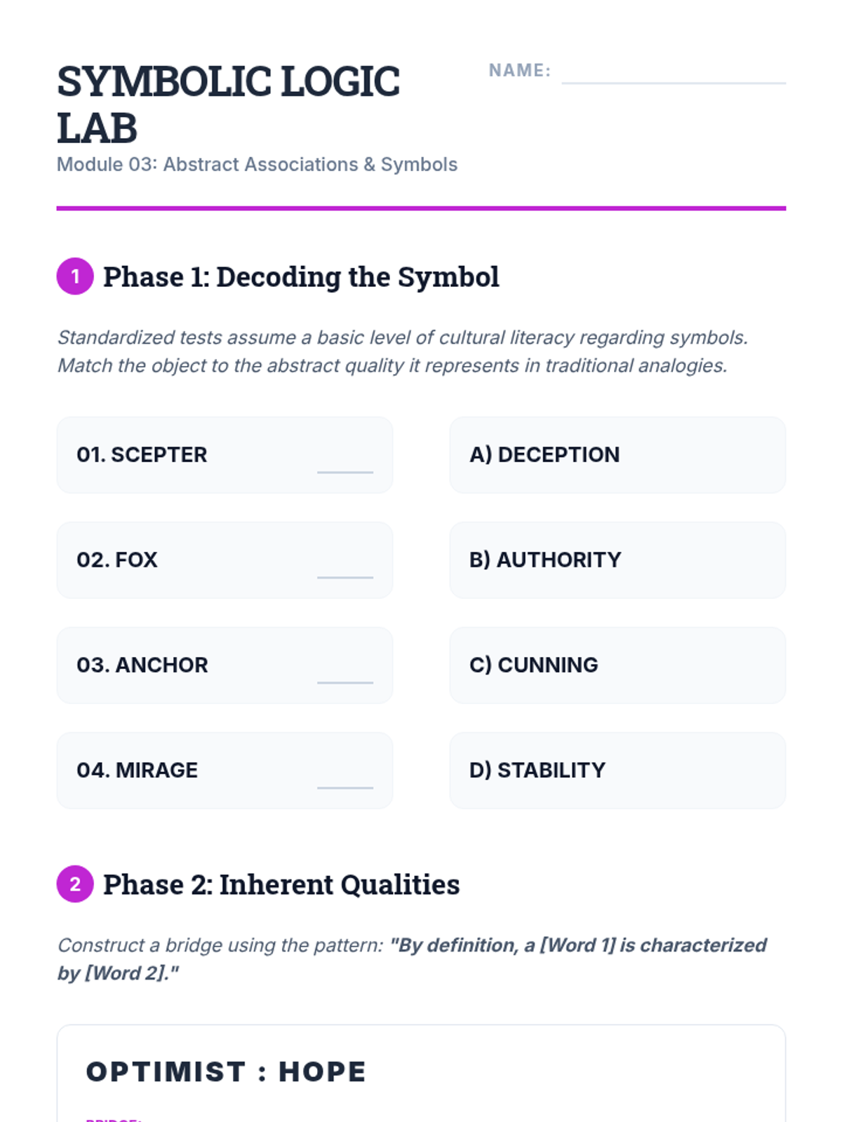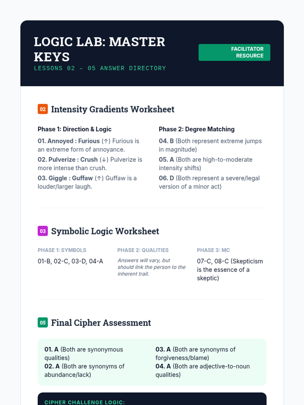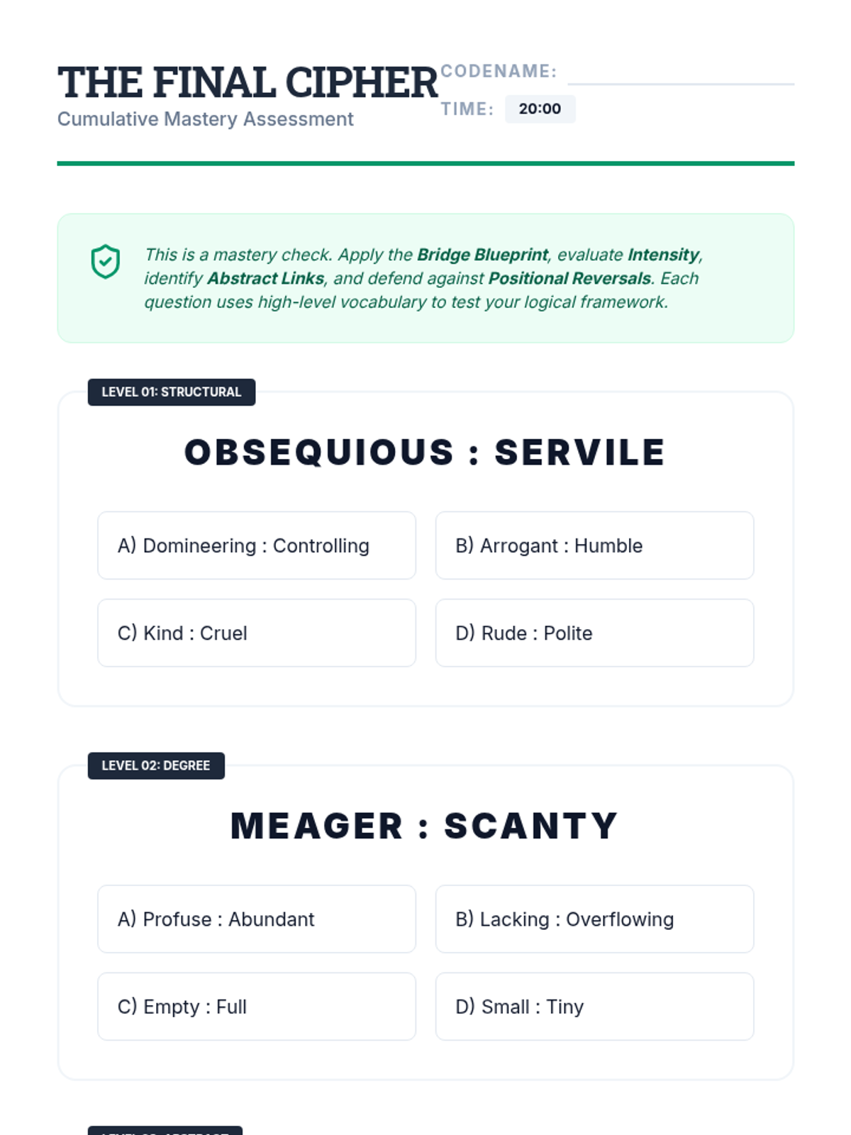 A high-level sequence for 11th-grade students focusing on the mechanics of solving verbal analogies through bridge sentences, degree analysis, abstract associations, and test-taking strategies. Students will develop the ability to decode complex vocabulary relationships using systematic logical frameworks.