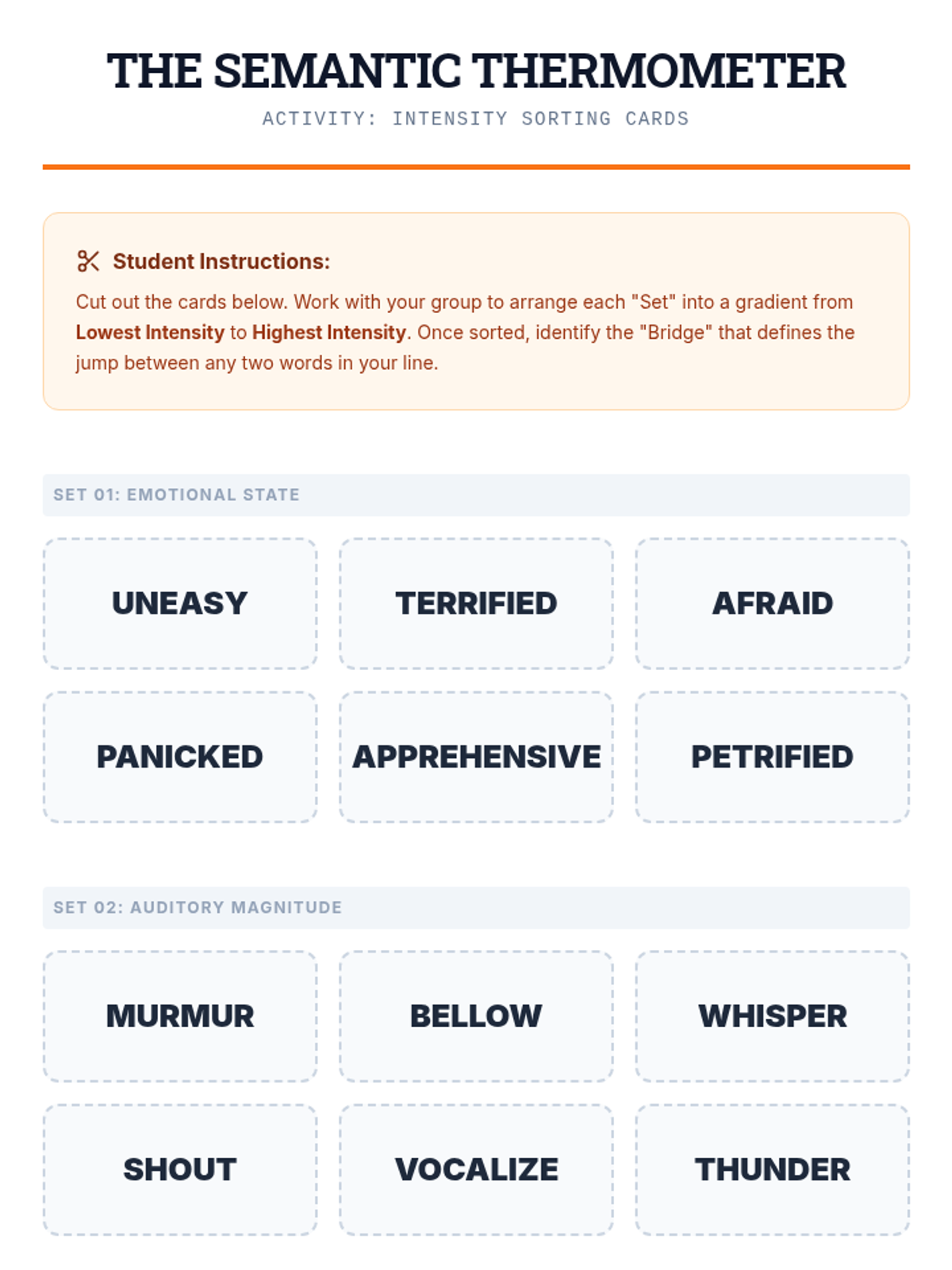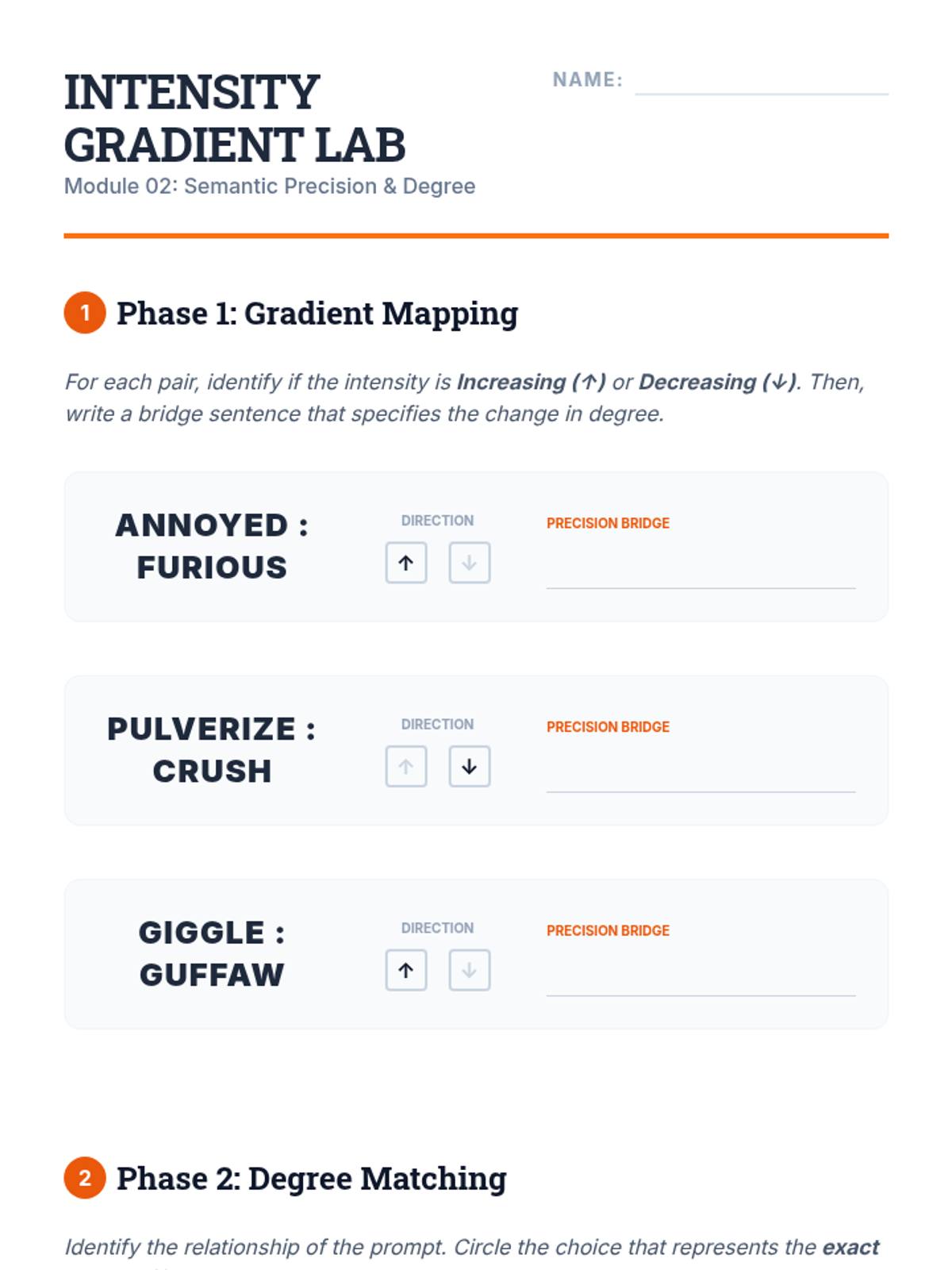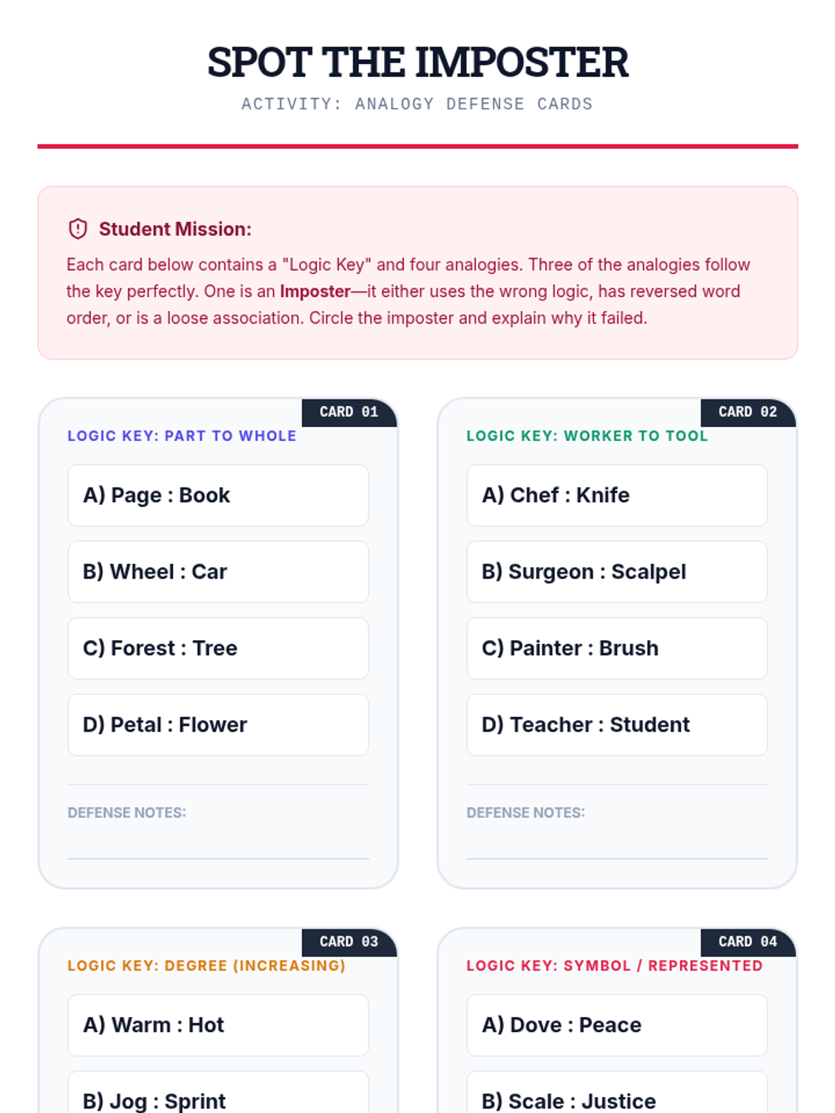 A high-level sequence for 11th-grade students focusing on the mechanics of solving verbal analogies through bridge sentences, degree analysis, abstract associations, and test-taking strategies. Students will develop the ability to decode complex vocabulary relationships using systematic logical frameworks.