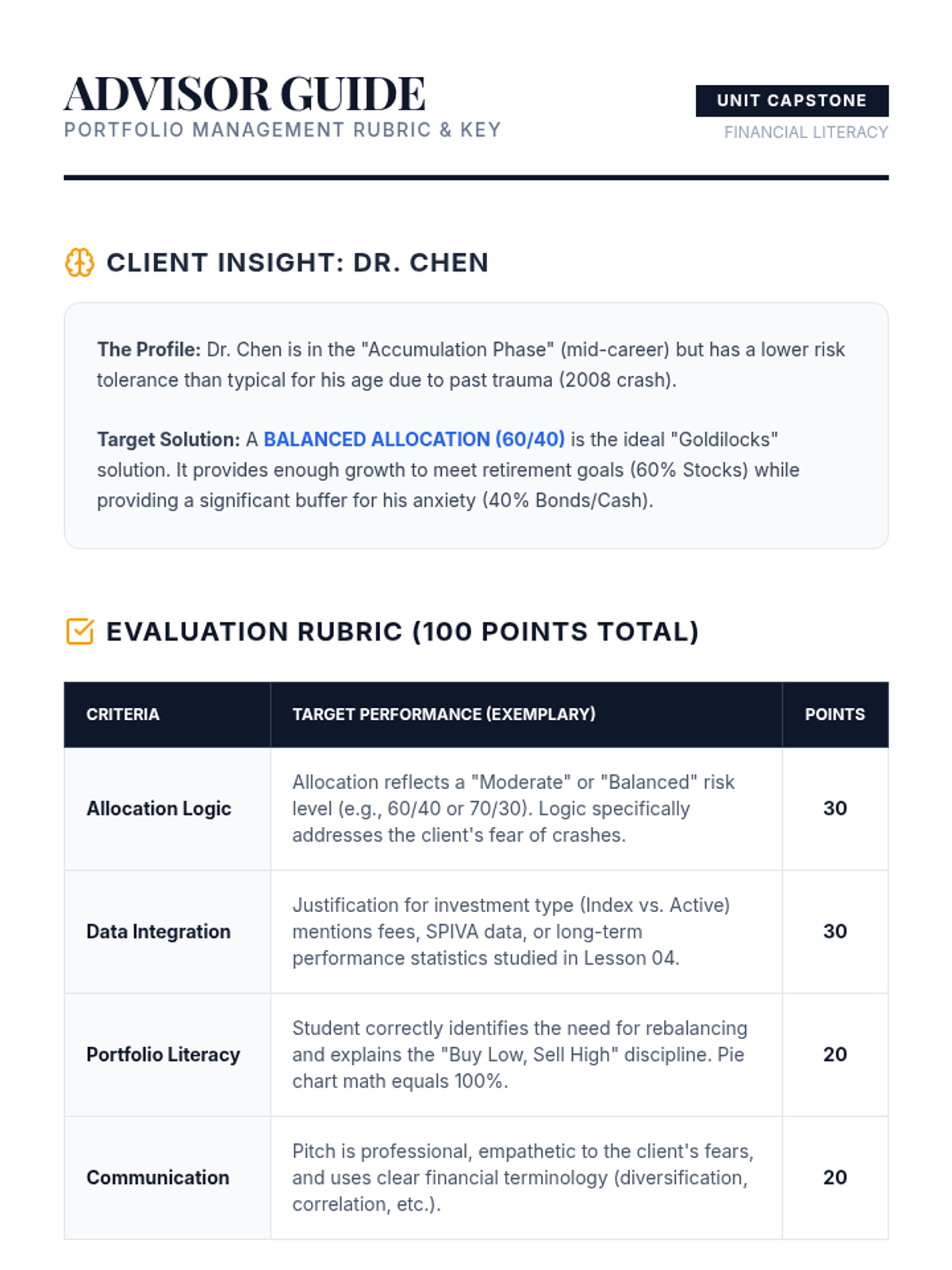 A comprehensive sequence for 9th-grade students exploring the principles of portfolio management, diversification, asset allocation, and rebalancing to build long-term financial security.