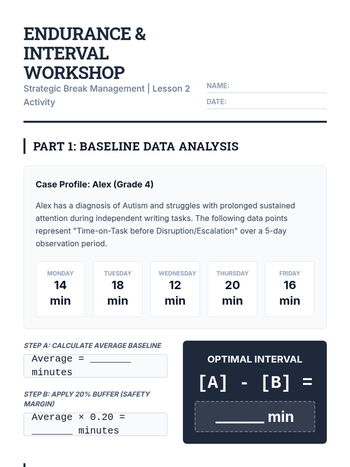 An undergraduate-level course focusing on the data-driven application of break strategies for neurodivergent learners. Students analyze learner profiles, design schedules, create data collection tools, and draft legally sound IEP accommodations to optimize regulation and task management.