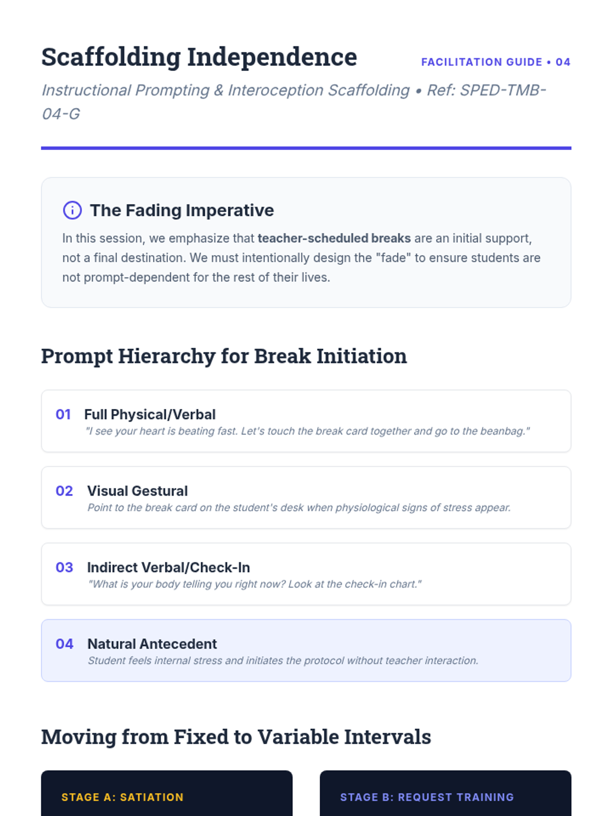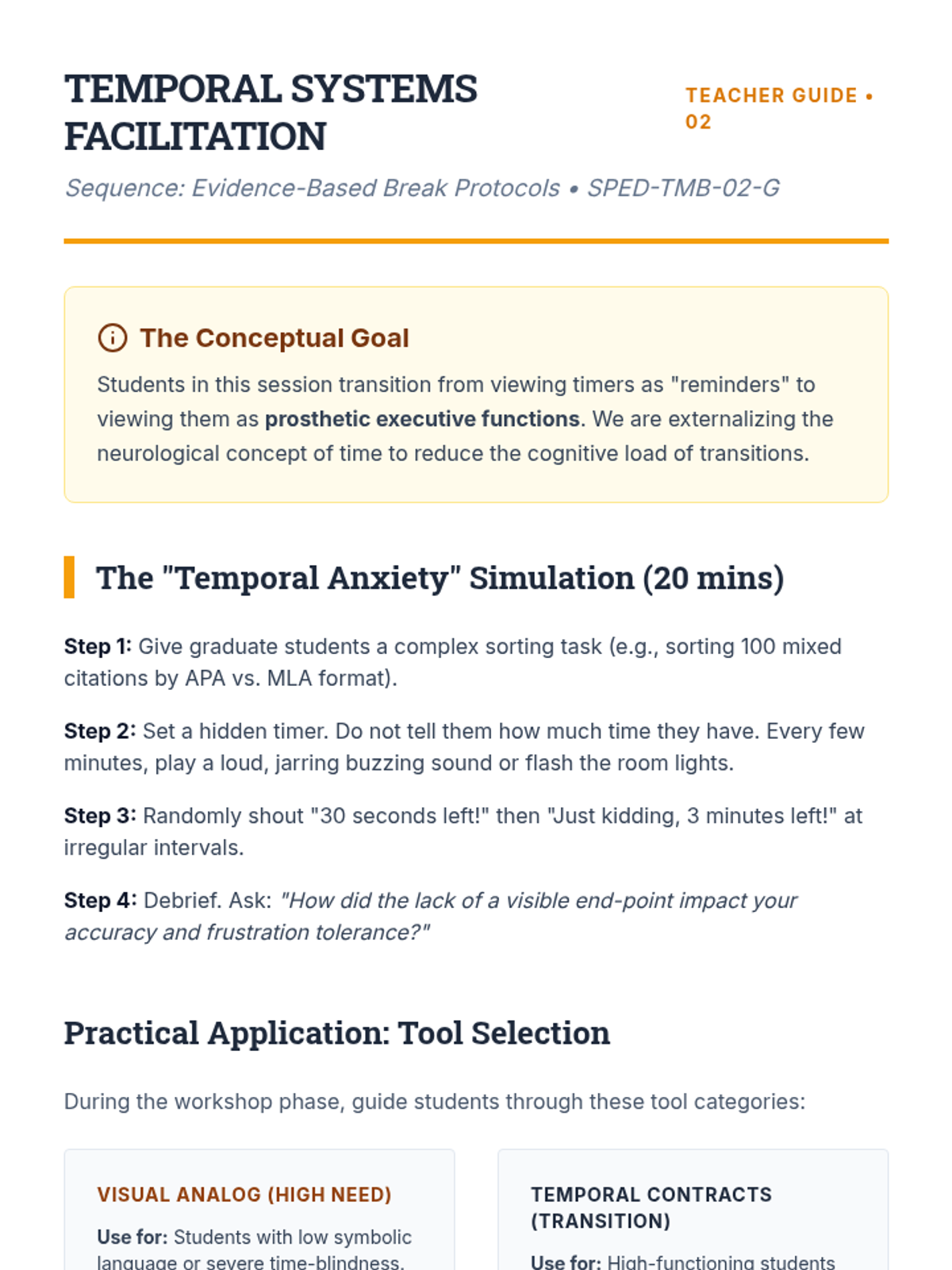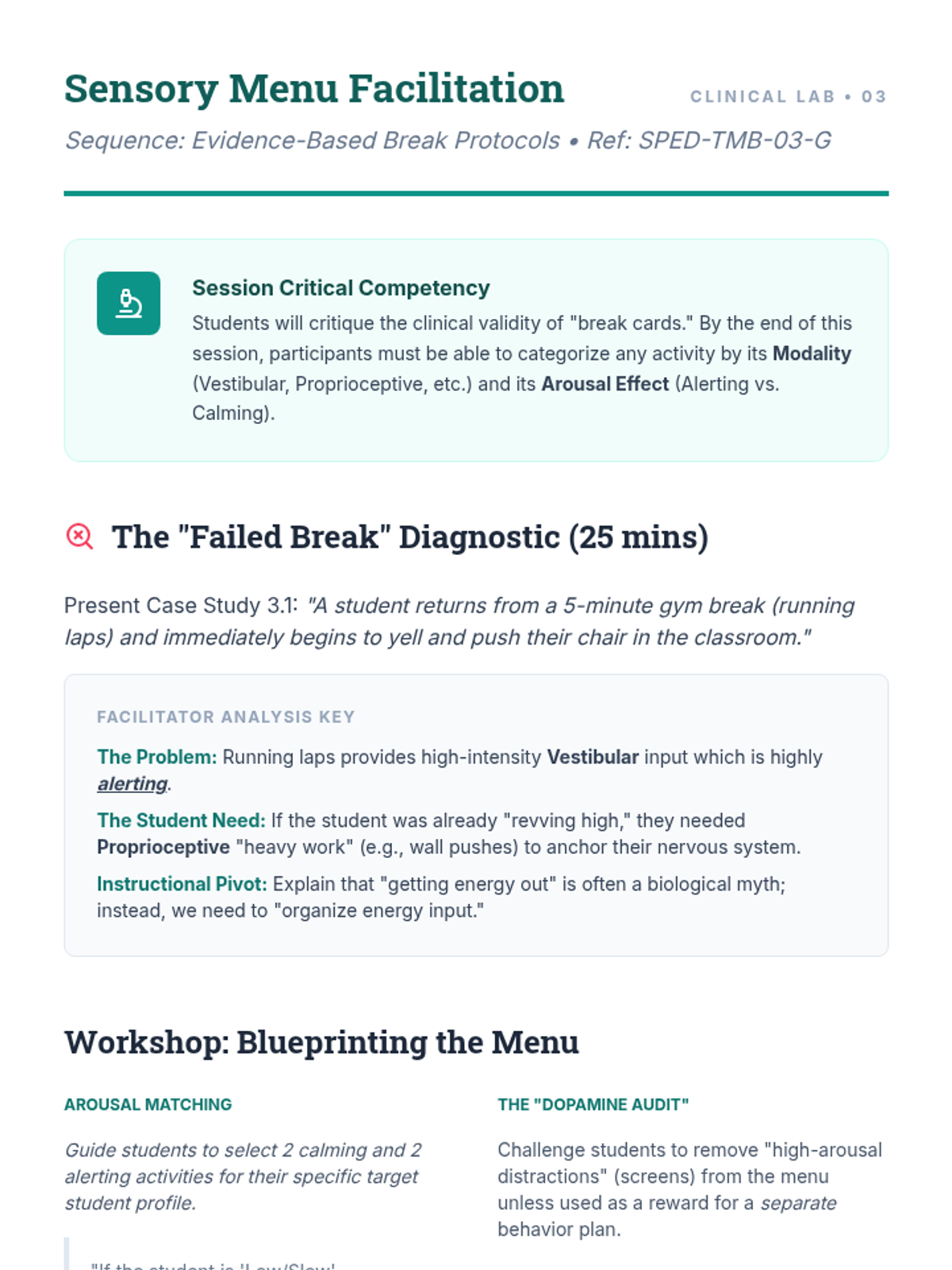 This advanced sequence guides graduate students through the design, implementation, and evaluation of strategic break protocols for neurodivergent learners. It covers the neurobiological basis for self-regulation, visual supports, sensory modality matching, and data-driven efficacy evaluation to foster student independence.