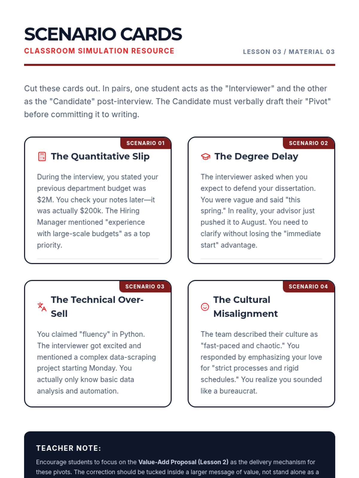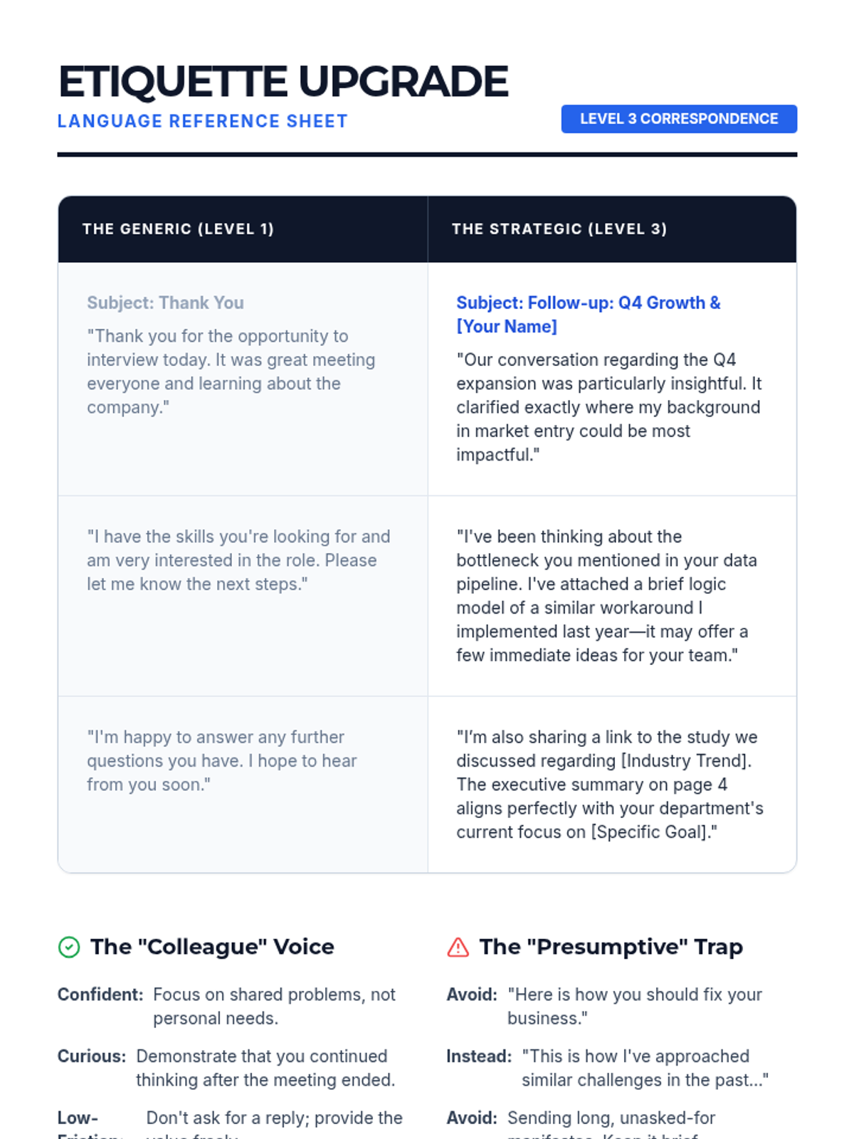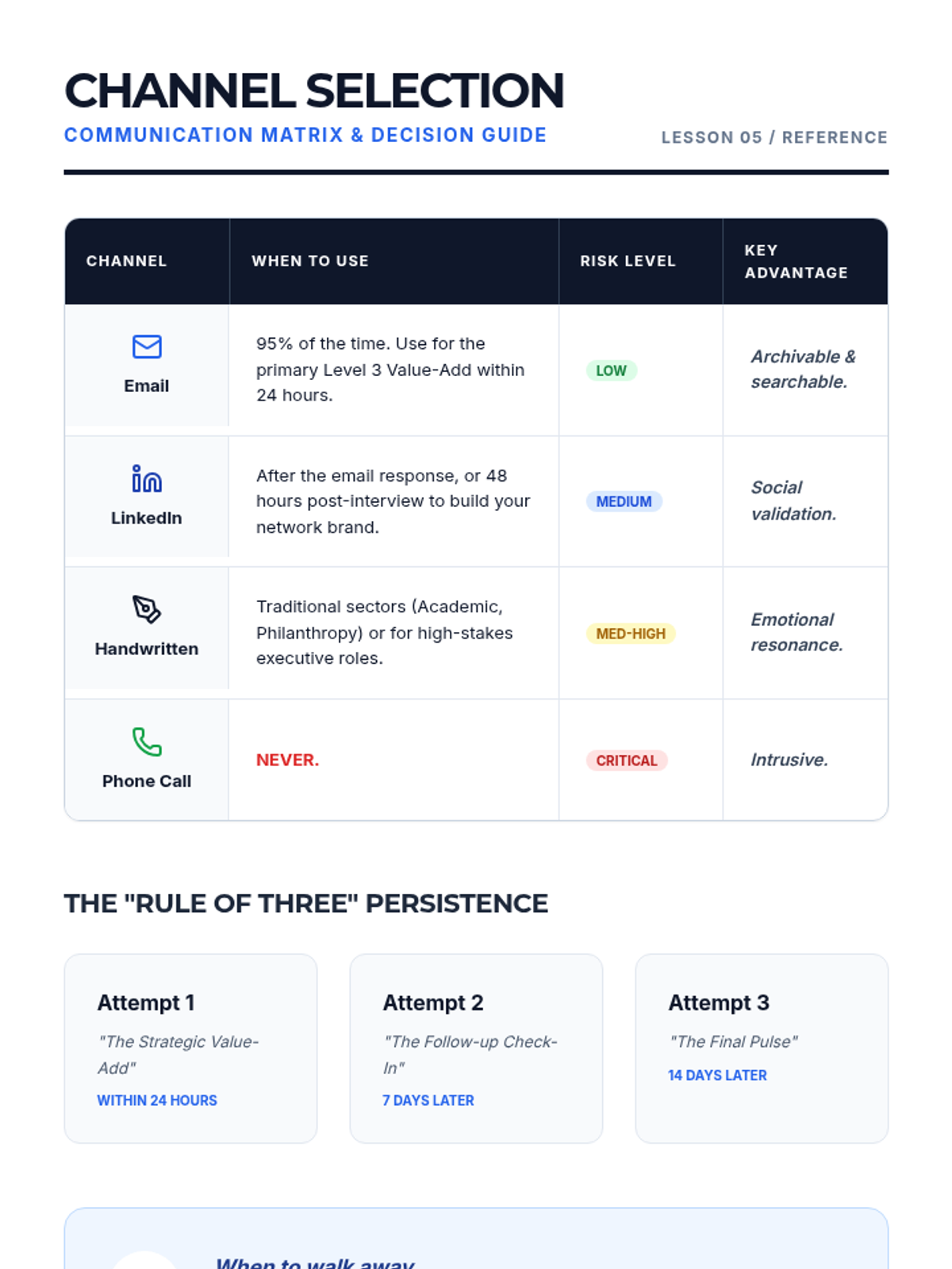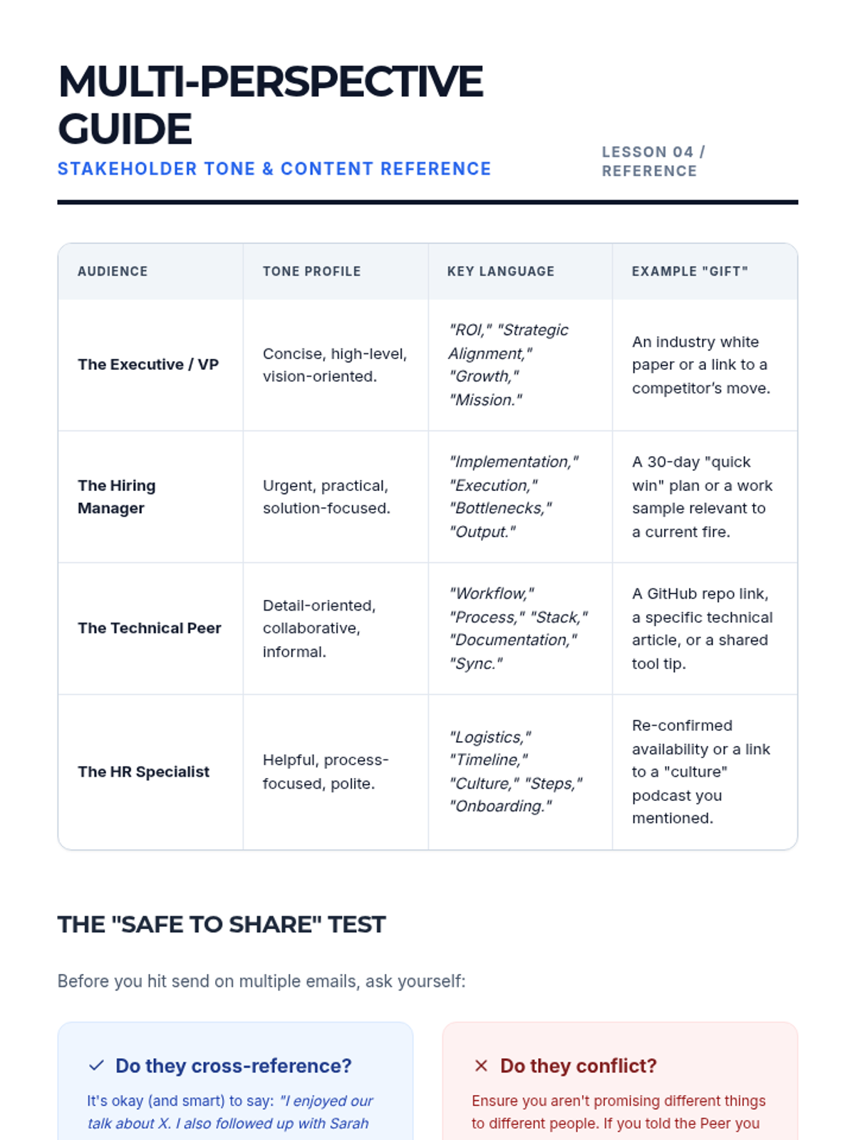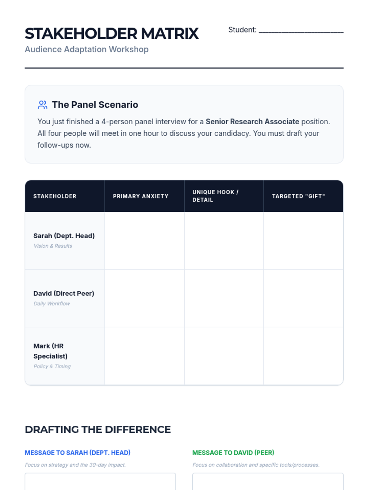 This graduate-level sequence focuses on post-interview communication as a strategic tool. Students learn to analyze interview performance, draft value-driven correspondence, mitigate weaknesses, and navigate complex stakeholder dynamics to reinforce their professional brand.