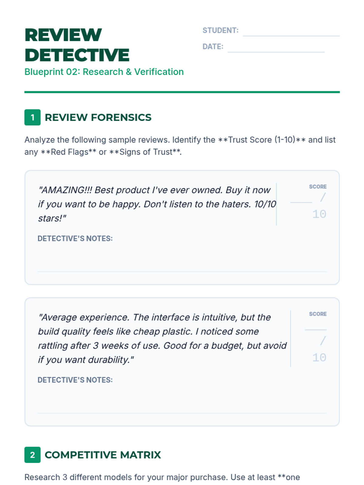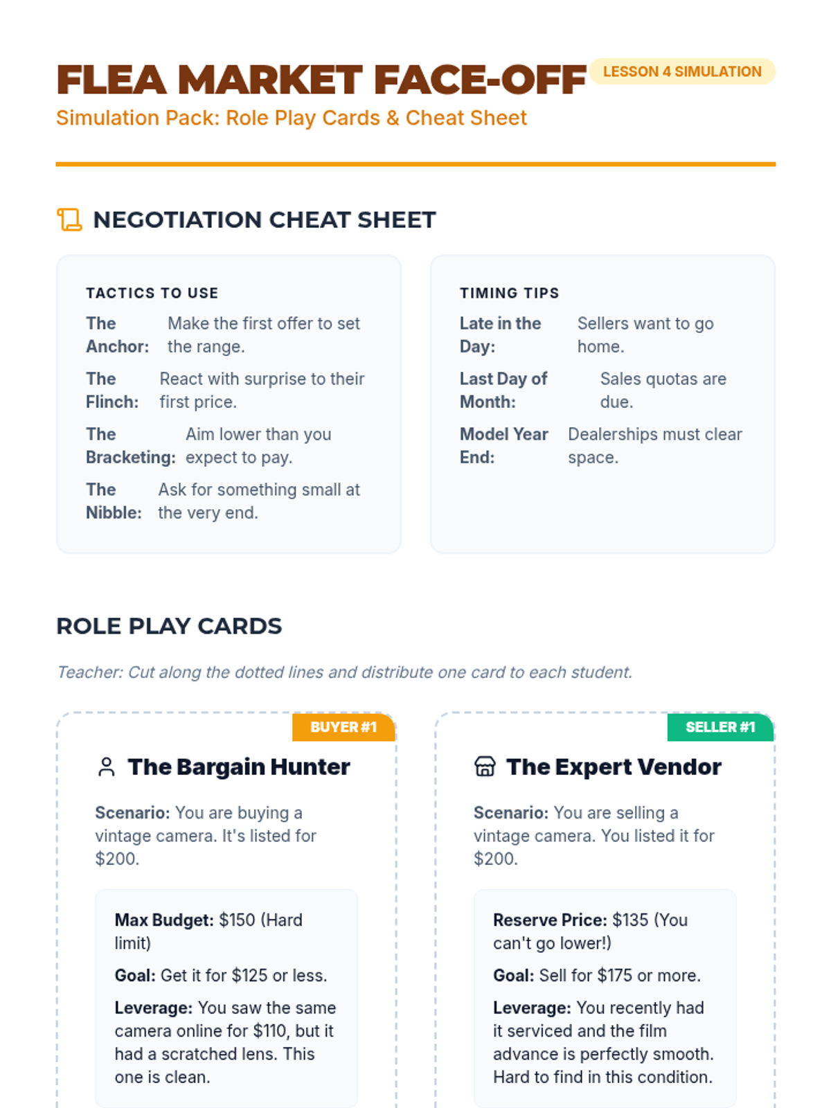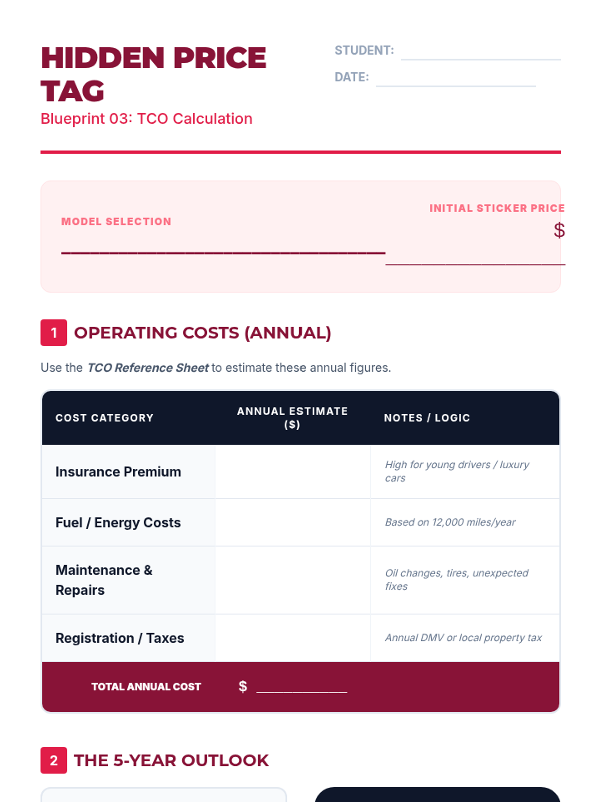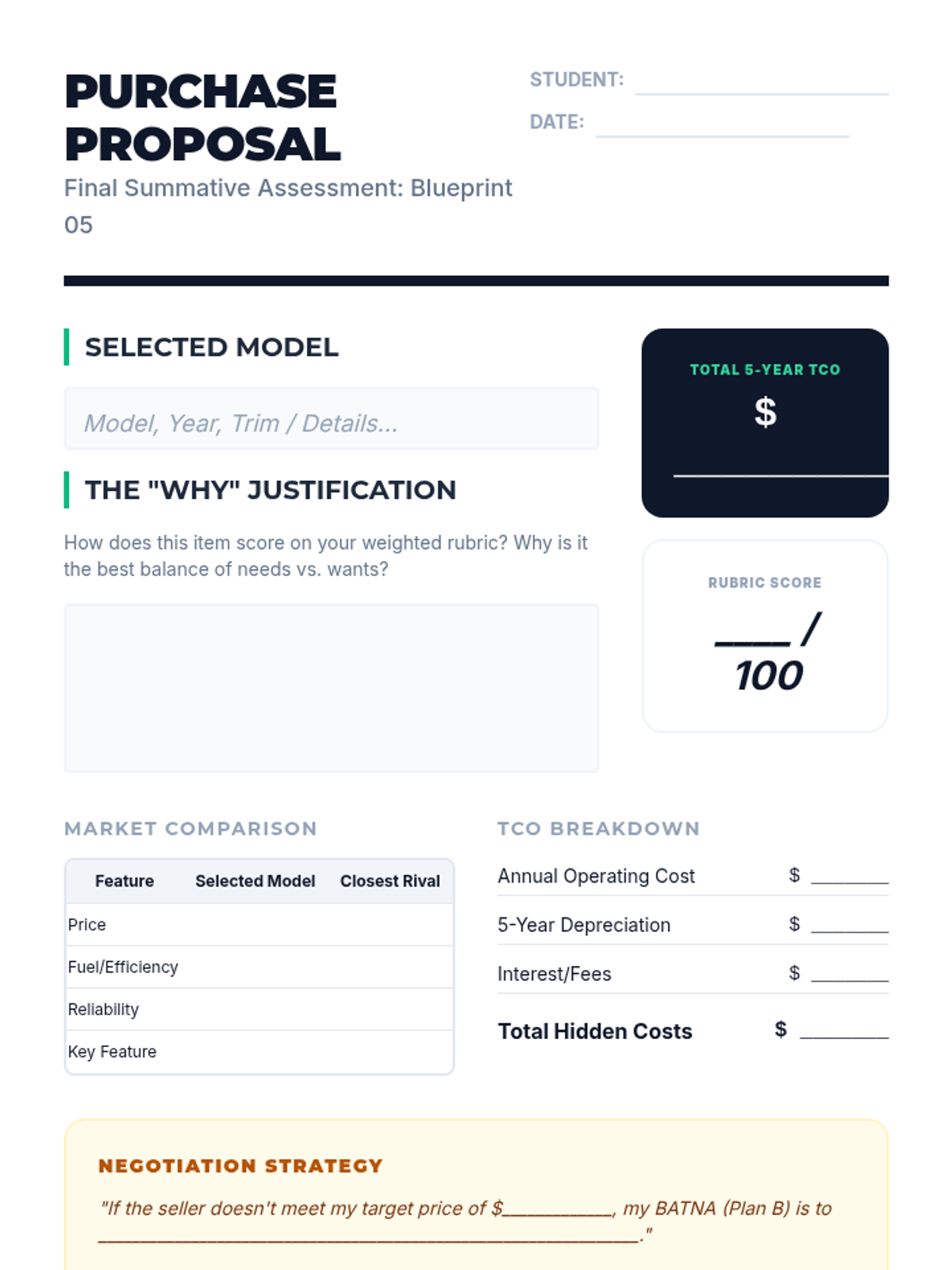 A project-based sequence for 11th-grade students focusing on practical consumer skills. Students simulate a major life purchase, moving from identifying needs to calculating the Total Cost of Ownership (TCO) and mastering negotiation tactics.