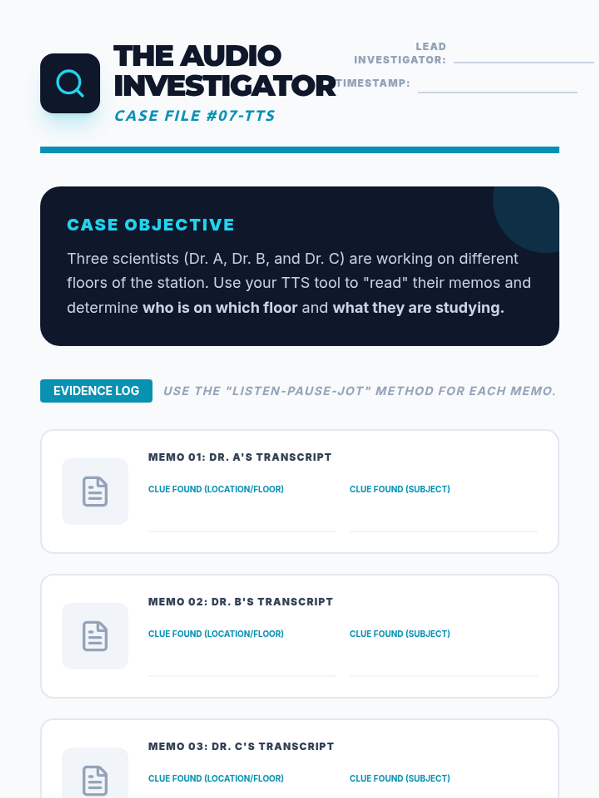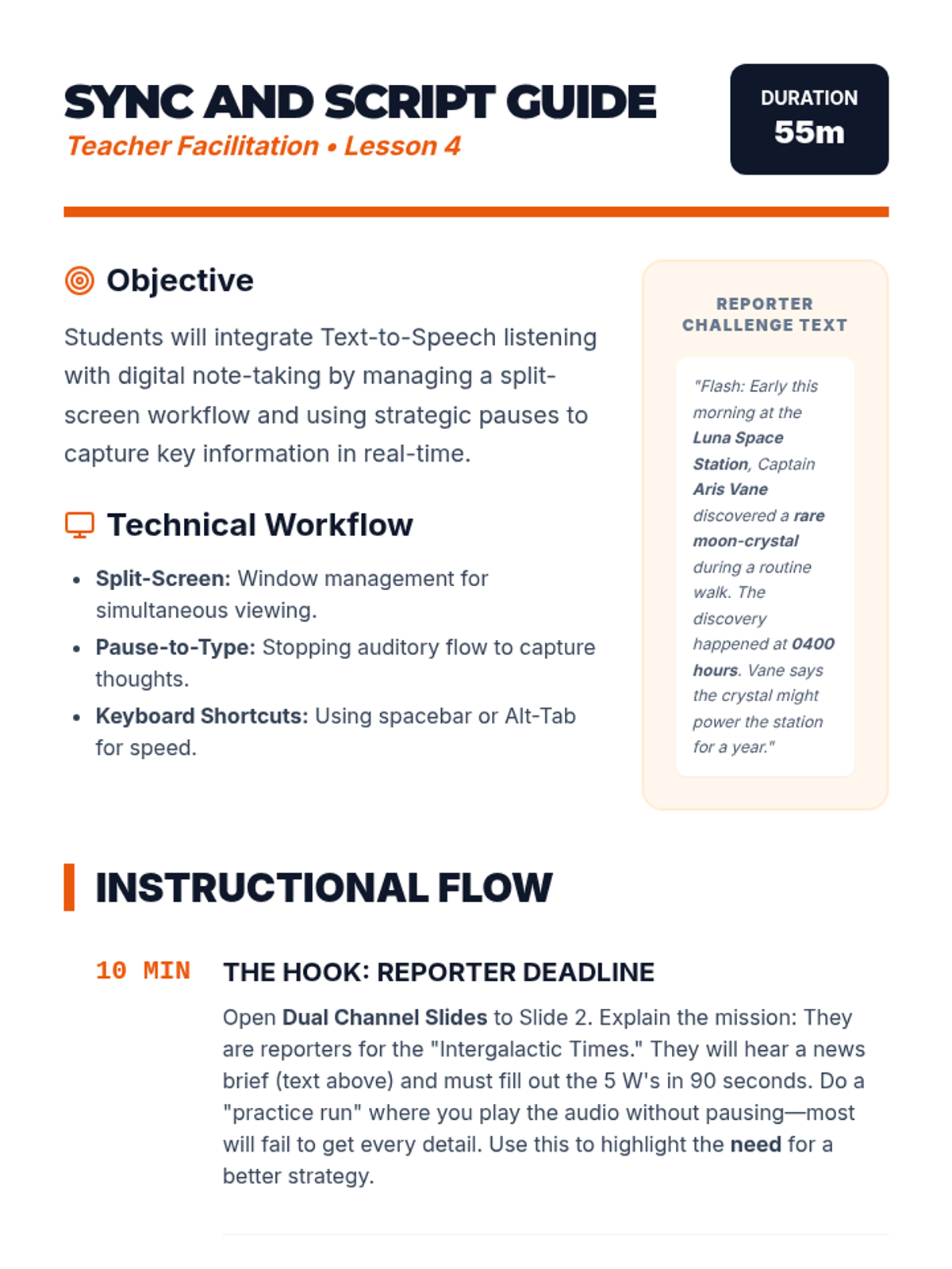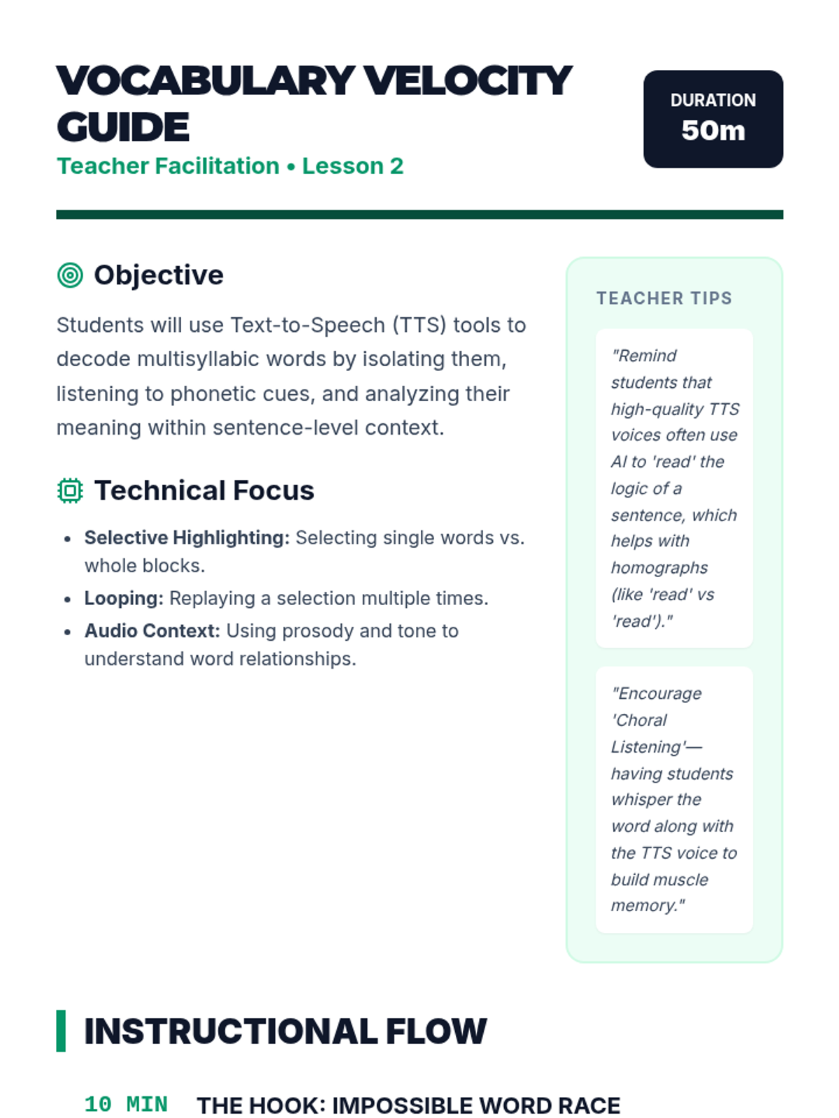 This sequence teaches 7th-grade students how to use text-to-speech (TTS) tools strategically to improve reading comprehension. Students progress from basic active listening habits to advanced multi-tasking and synthesis, transforming TTS from a passive hearing aid into a powerful active reading strategy.