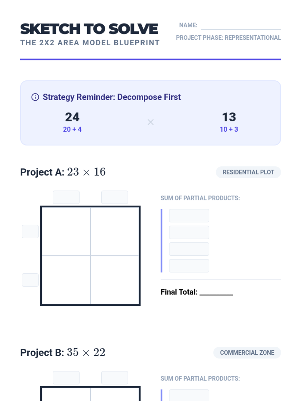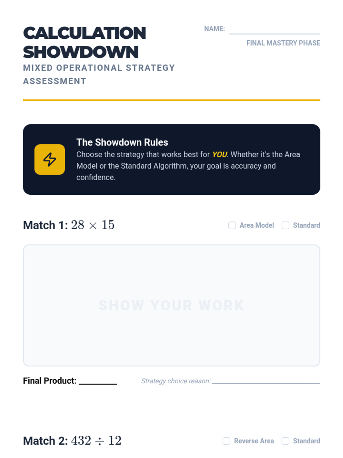 A specialized sequence for 12th-grade students focusing on math manipulative use and visual modeling to master multi-digit multiplication and division. Students progress from concrete base-ten blocks to representational area models, ending with strategy efficiency and real-world application.