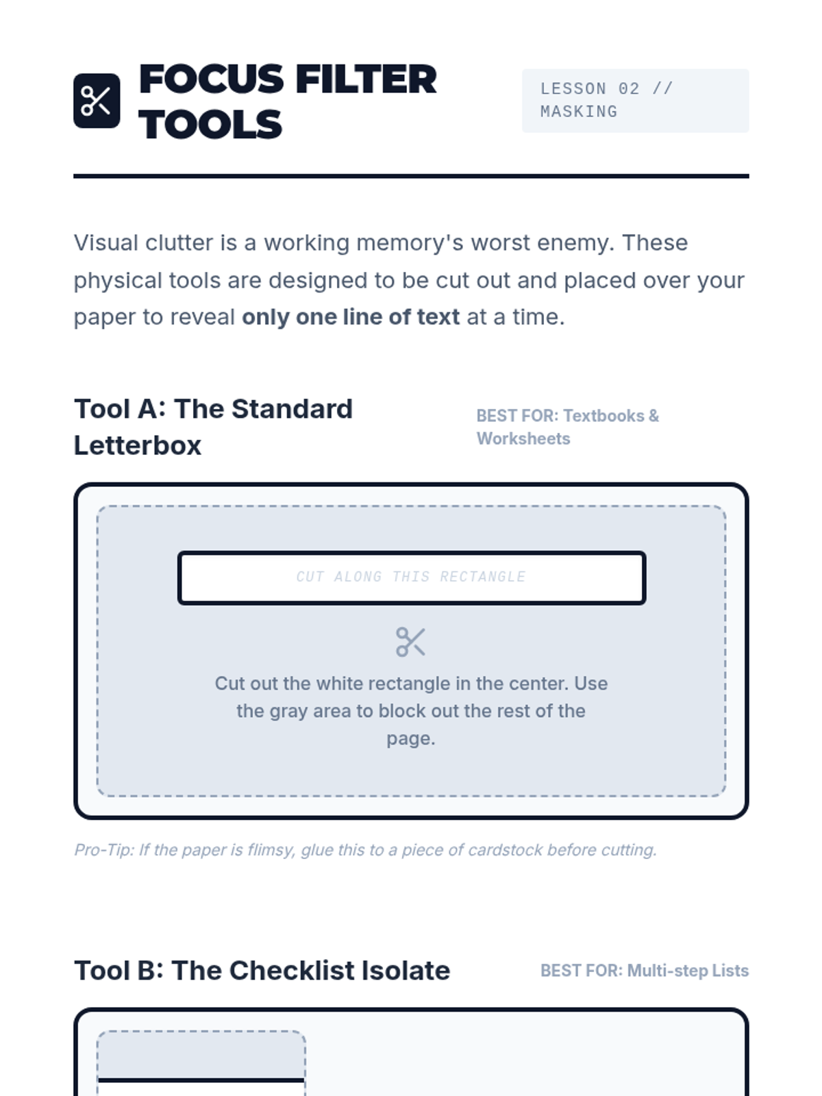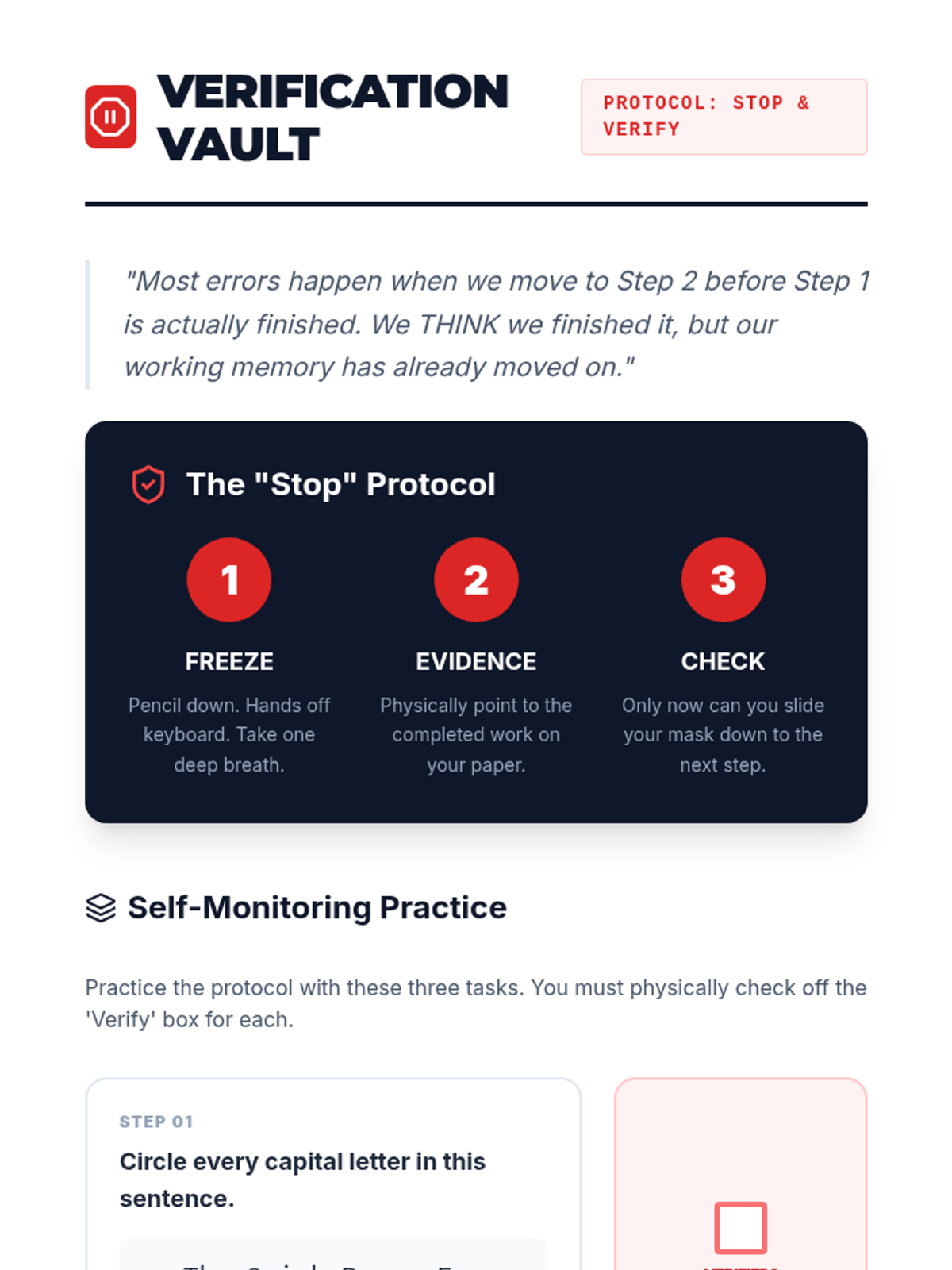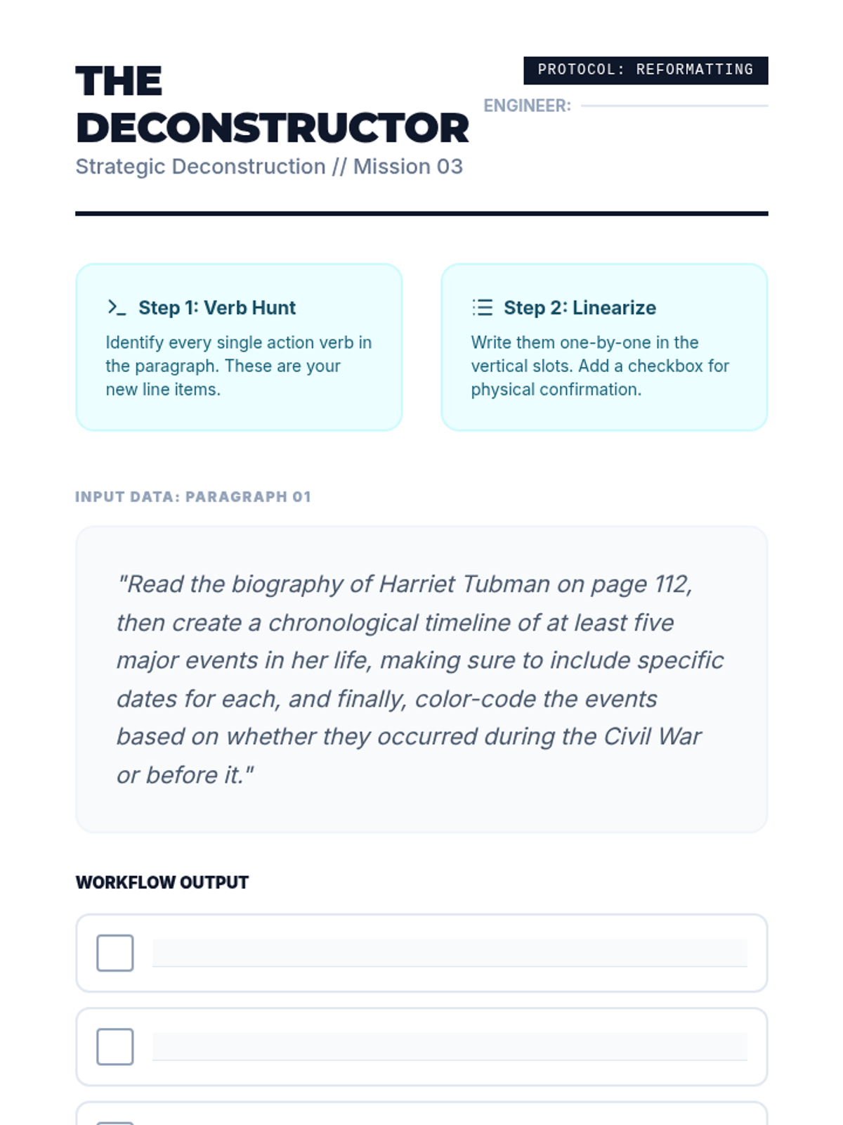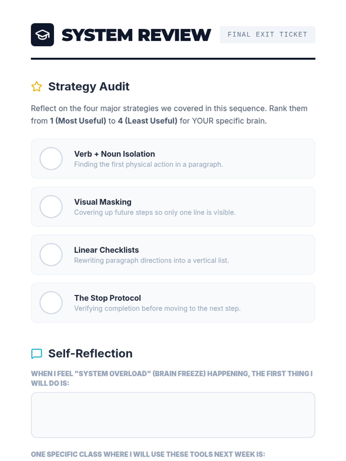 This sequence teaches 11th-grade students with working memory challenges how to deconstruct complex academic prompts into single, manageable steps using masking, checklists, and verification protocols.