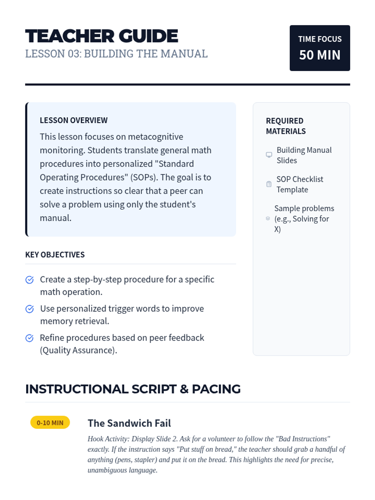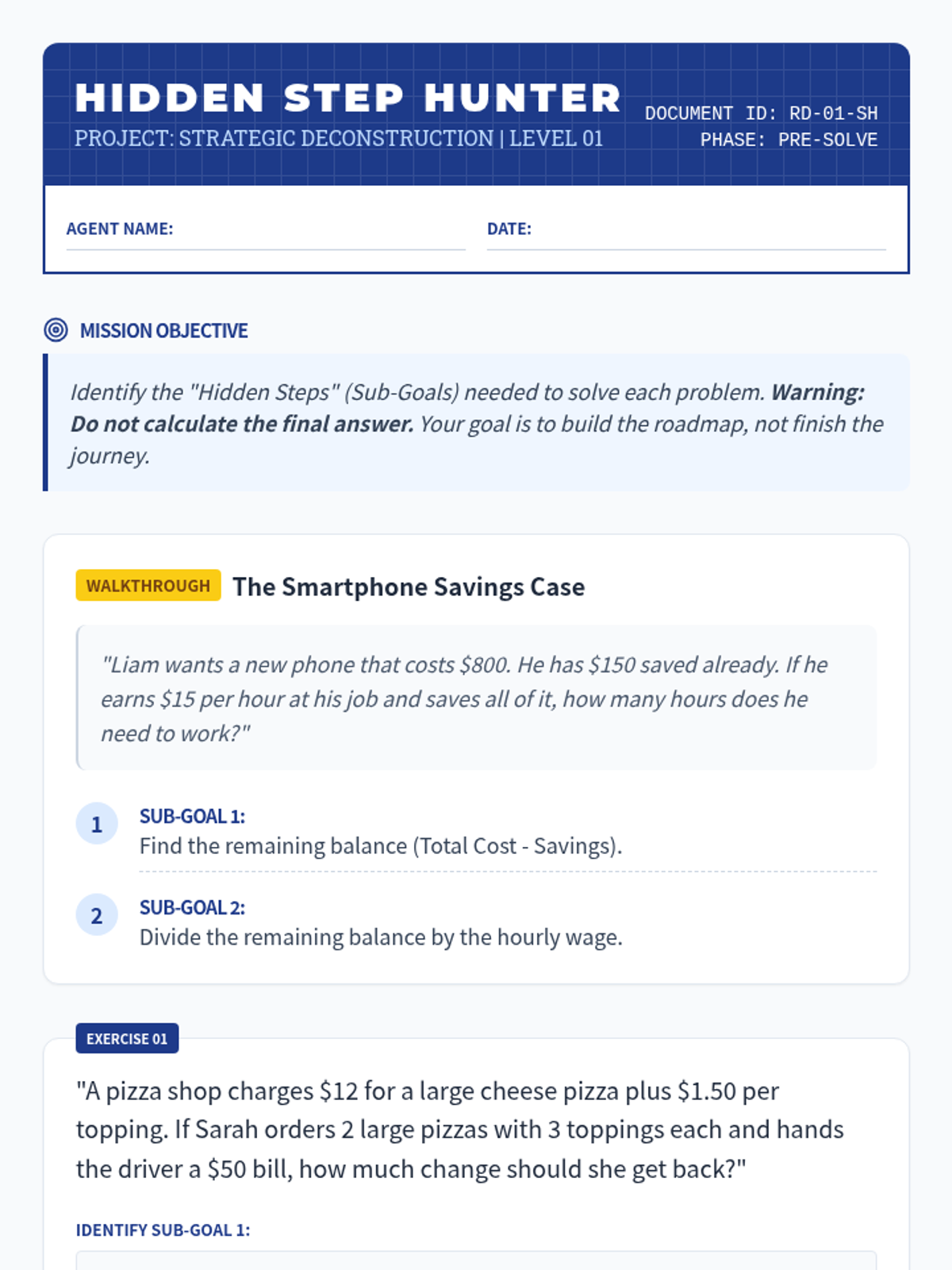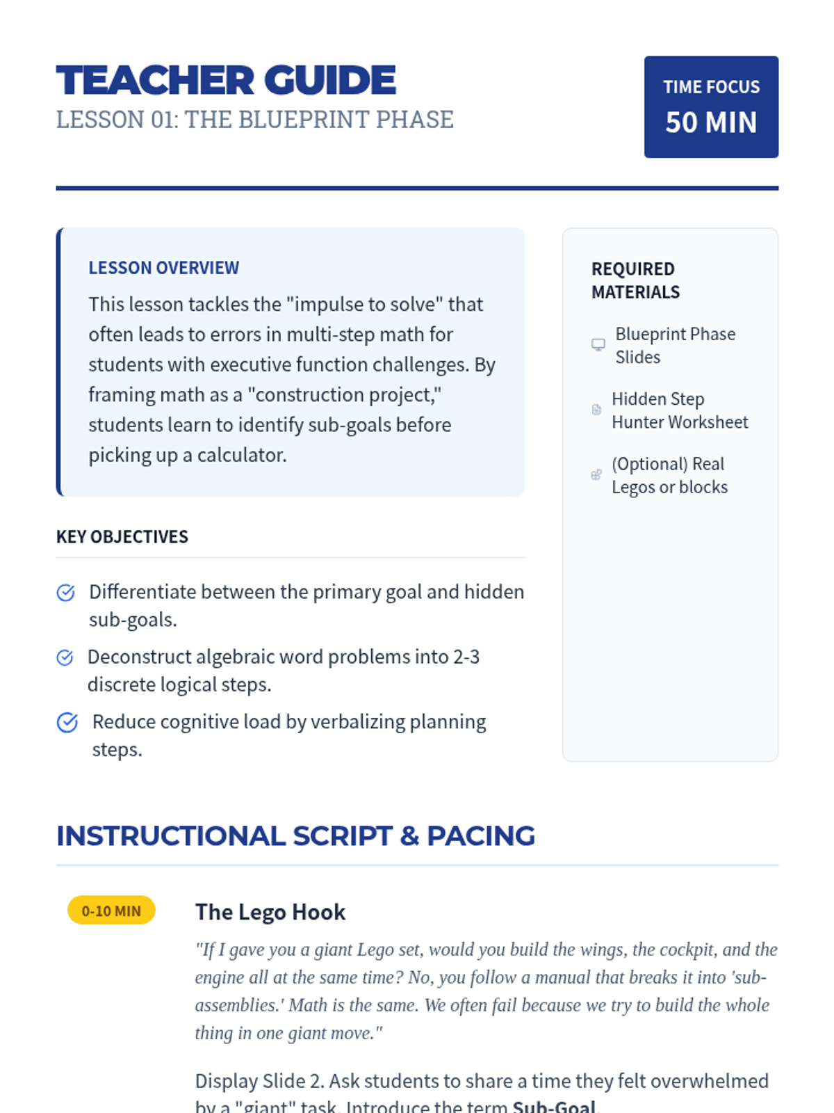 This sequence addresses executive function barriers in 10th-grade mathematics by explicitly teaching the mechanics of problem decomposition. Students learn to identify hidden sub-steps, create visual schematics, develop personalized checklists, and perform metacognitive error analysis to move from impulsive solving to systematic planning.