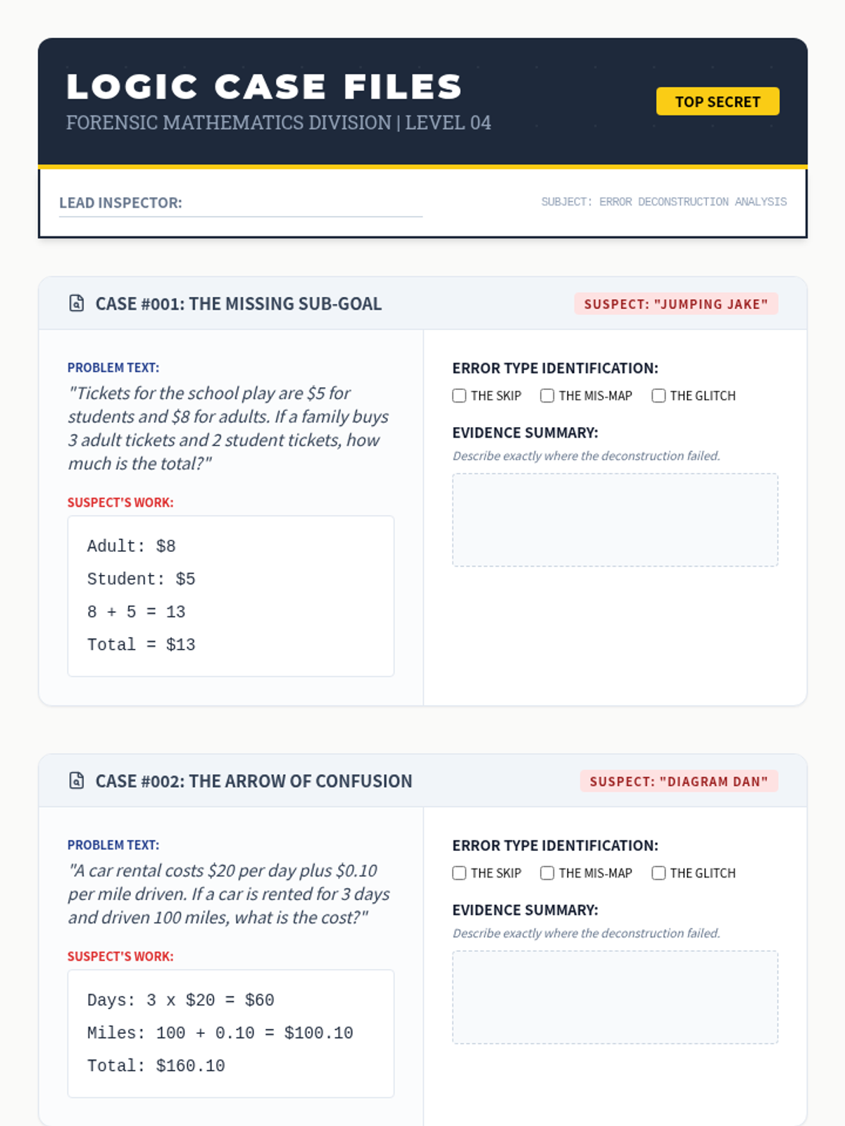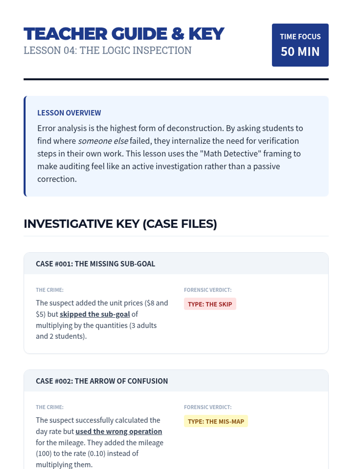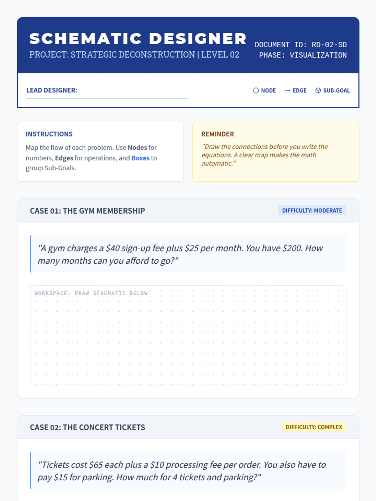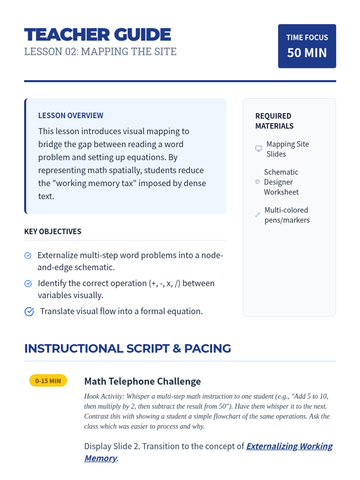 This sequence addresses executive function barriers in 10th-grade mathematics by explicitly teaching the mechanics of problem decomposition. Students learn to identify hidden sub-steps, create visual schematics, develop personalized checklists, and perform metacognitive error analysis to move from impulsive solving to systematic planning.