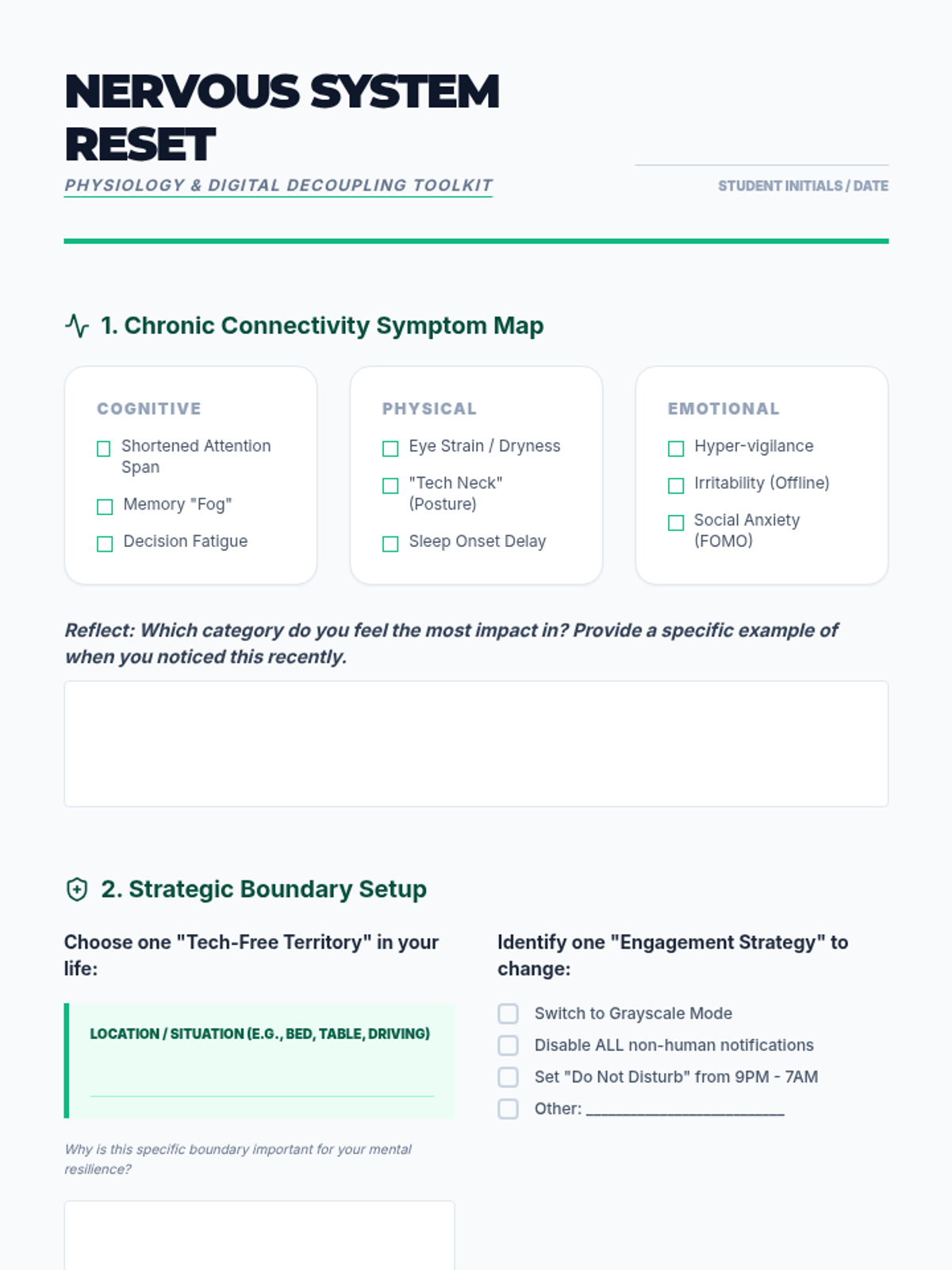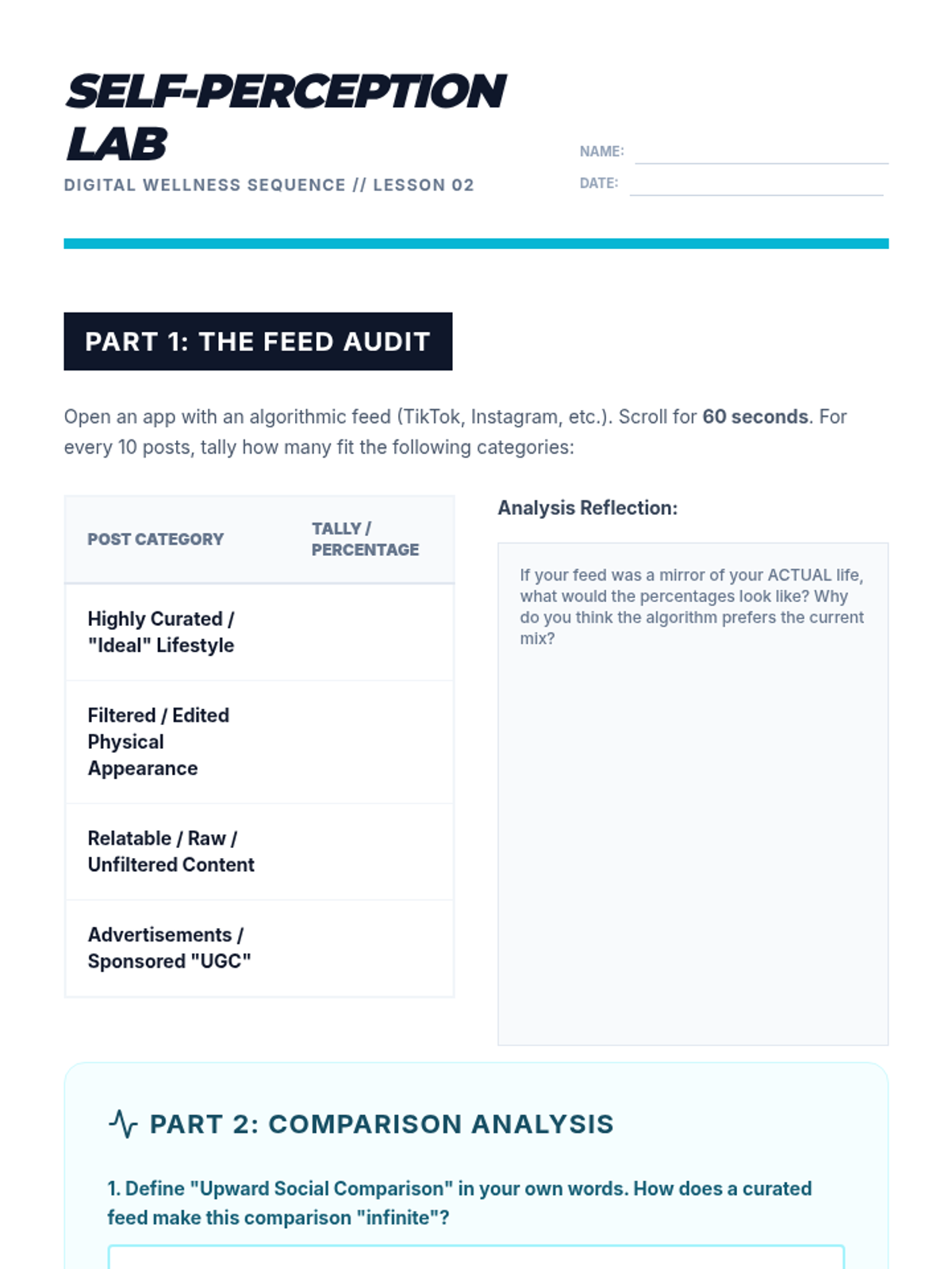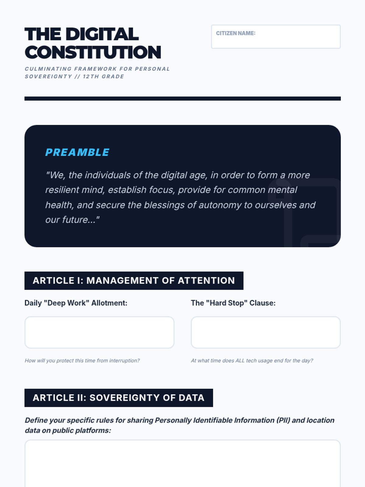 An advanced digital literacy and mental health sequence for 12th graders, focusing on tech ethics, algorithmic influence, and personal agency in the attention economy.