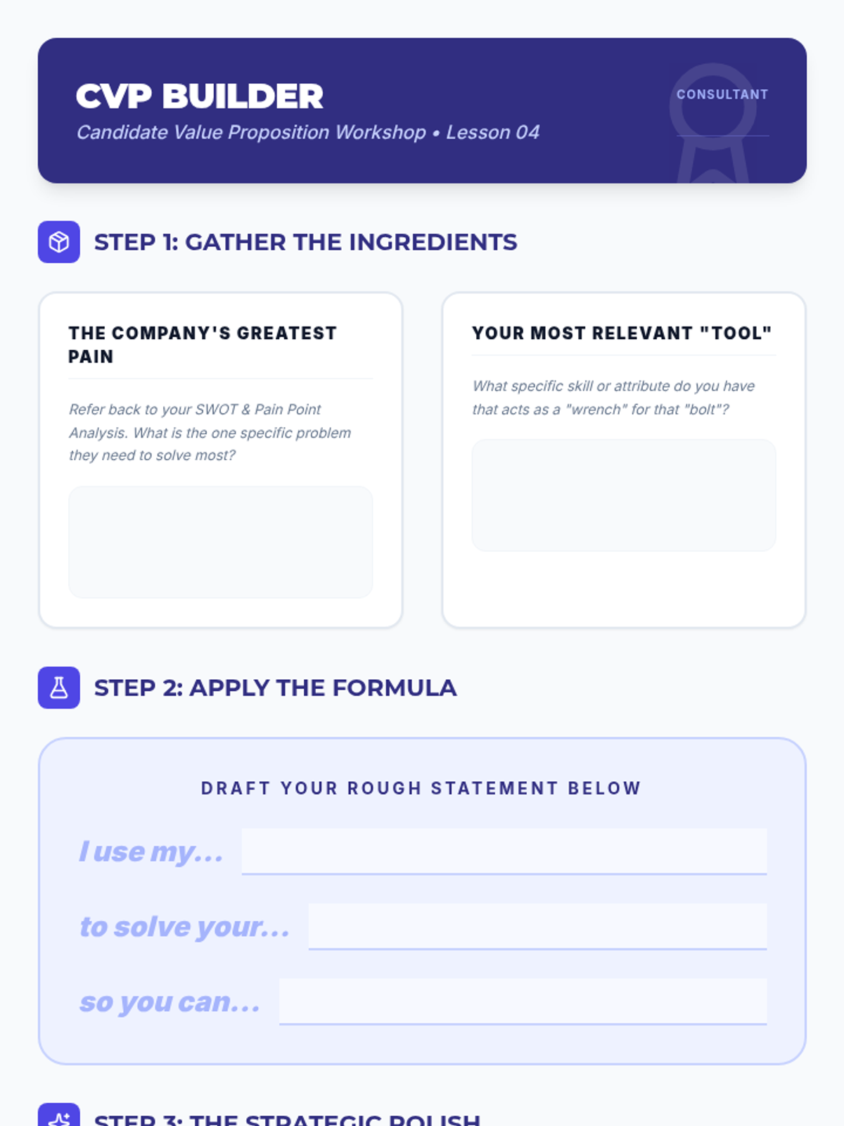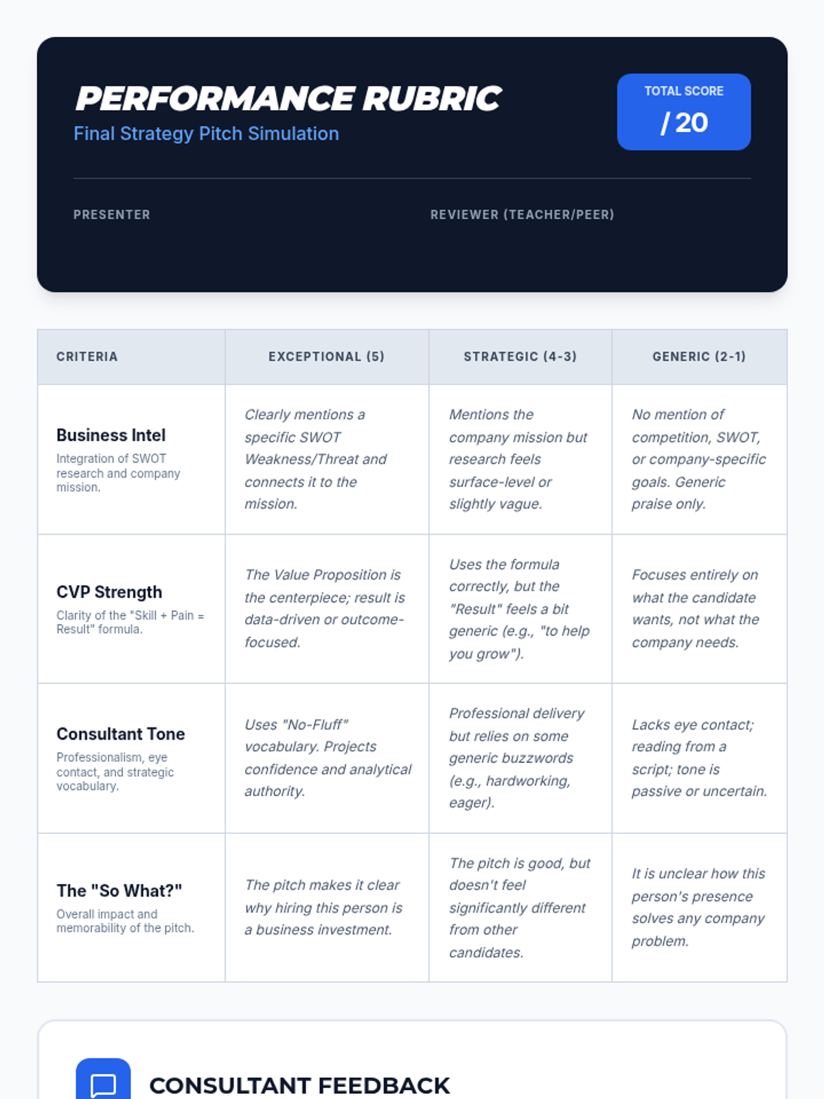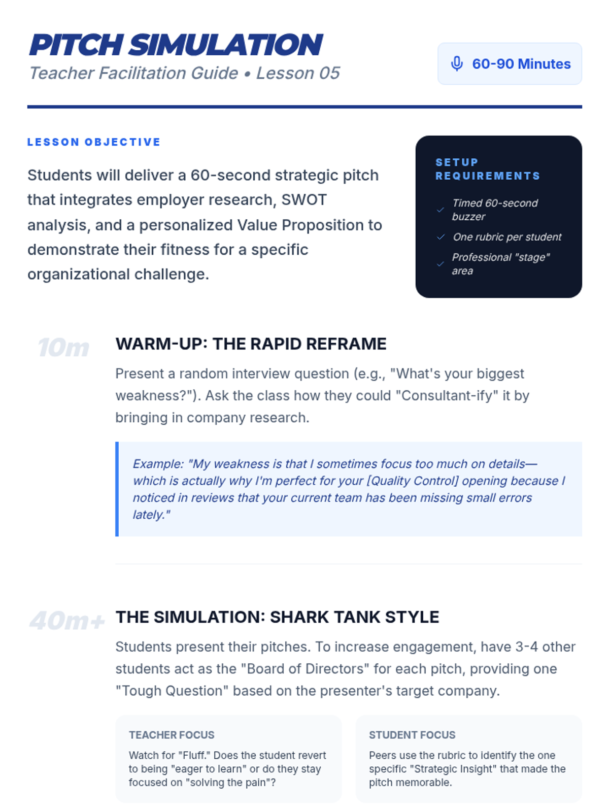 A project-based sequence where 10th-grade students act as business consultants to research target employers. Students conduct SWOT analyses, identify company pain points, and develop a 'Candidate Value Proposition' to position themselves as strategic solutions during the interview process.