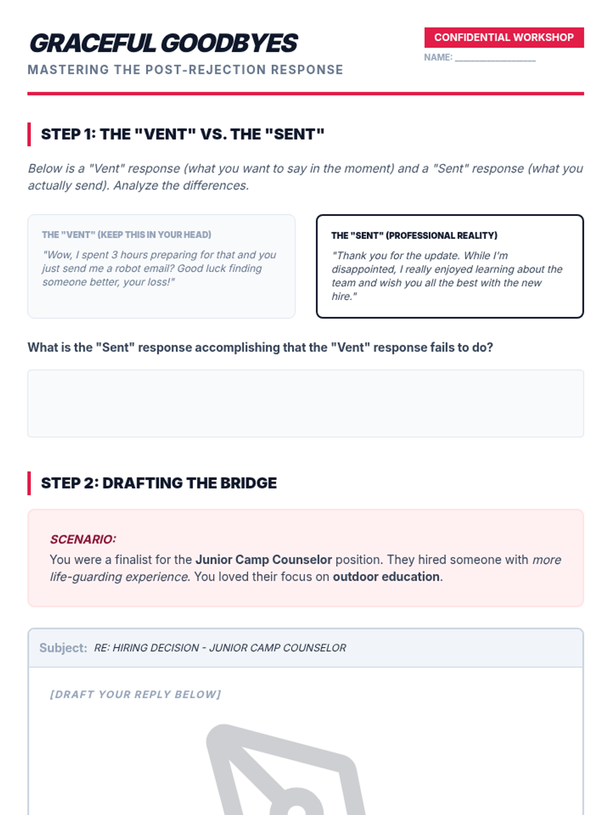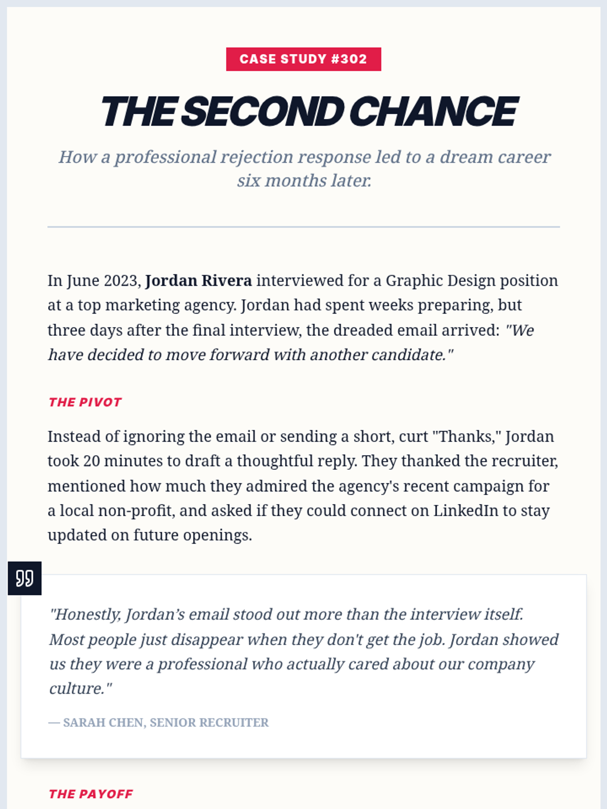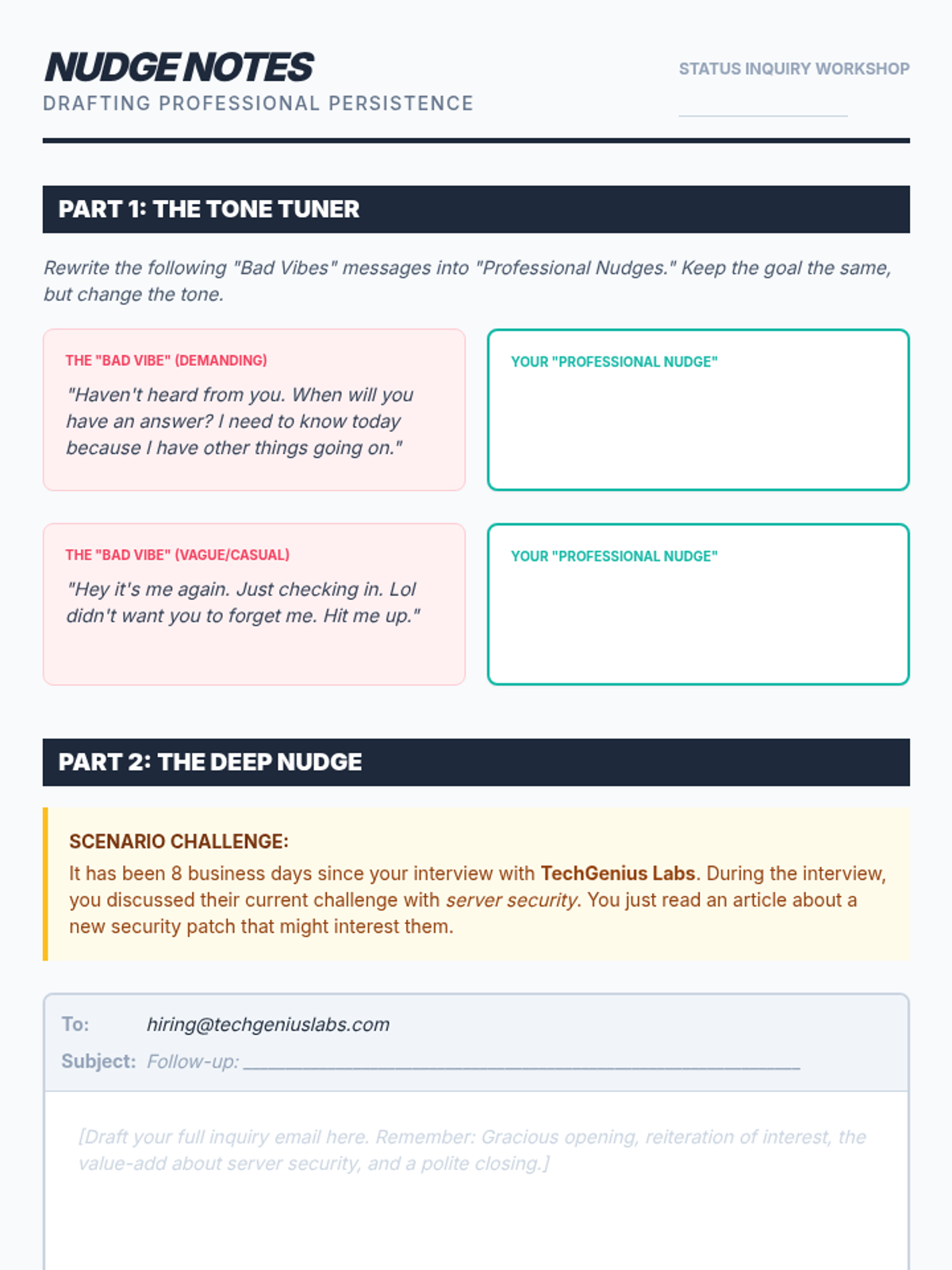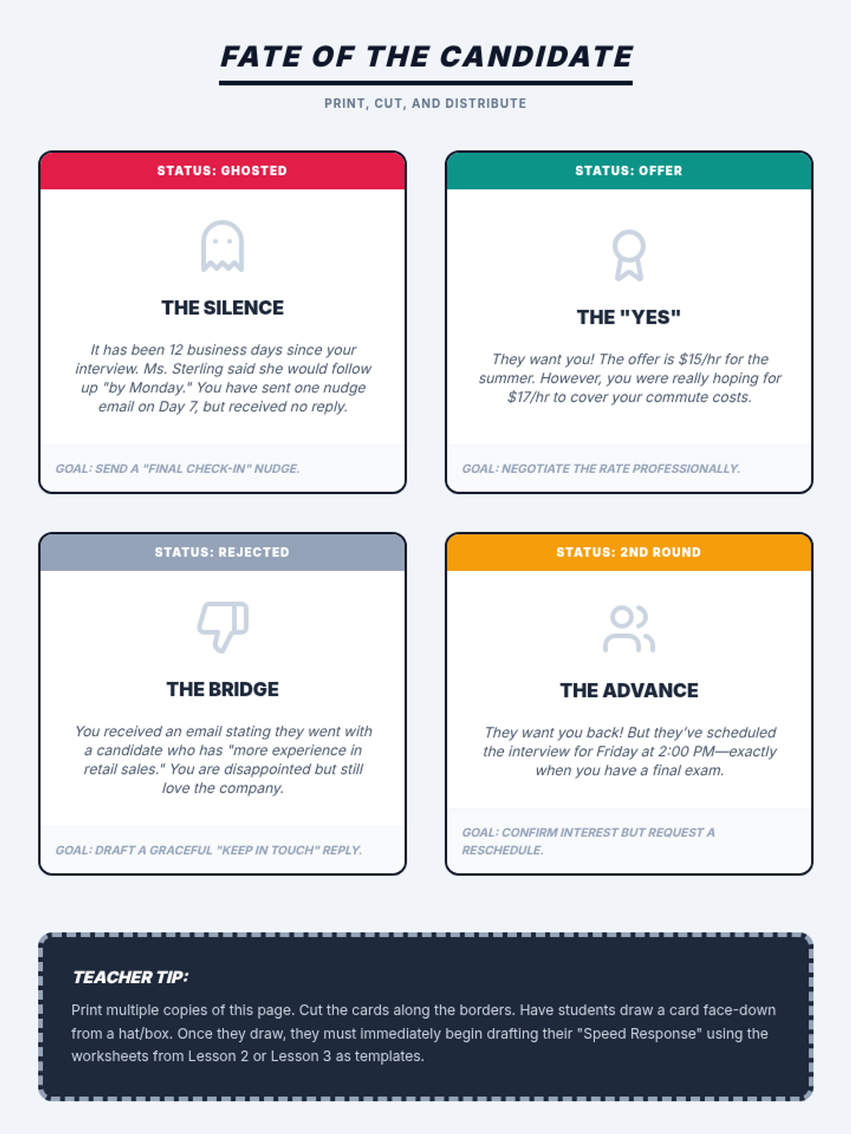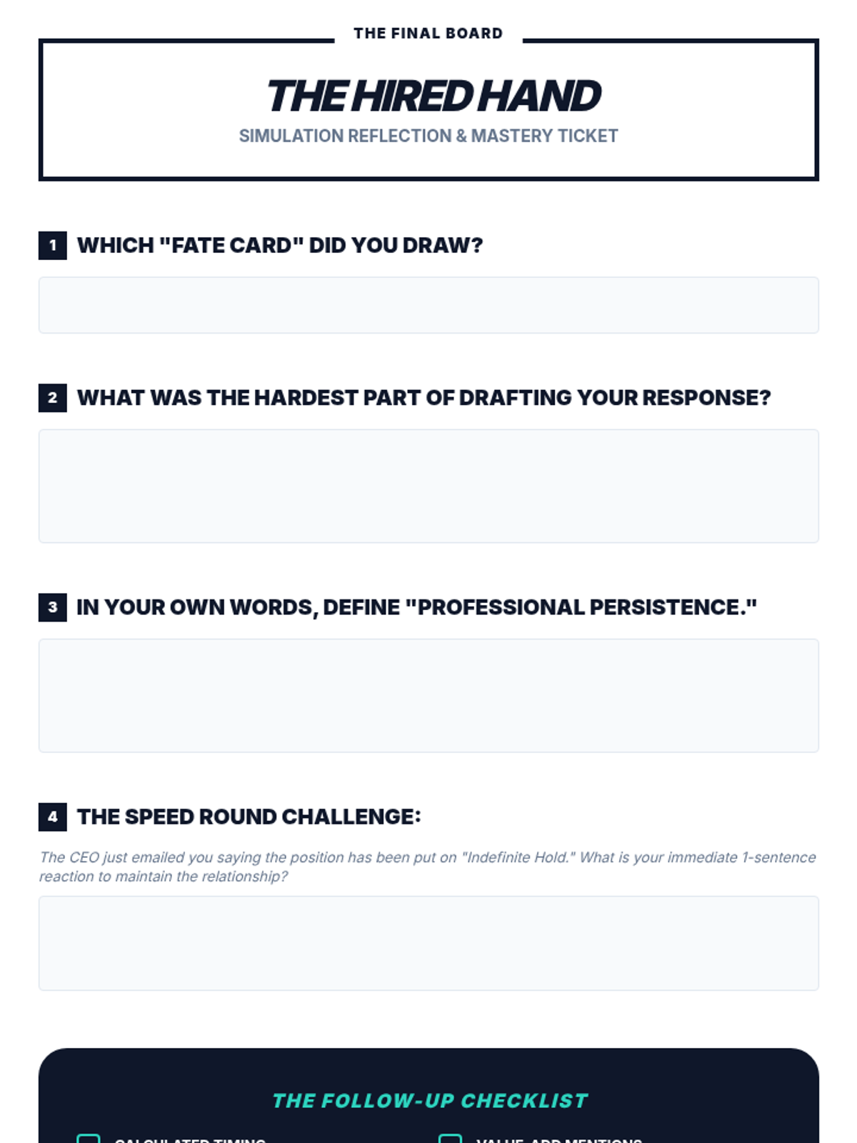 This sequence explores the professional art of following up after a job interview. Students learn to navigate the 'waiting game' by understanding employer timelines, drafting strategic inquiries, and responding professionally to outcomes ranging from job offers to rejections.